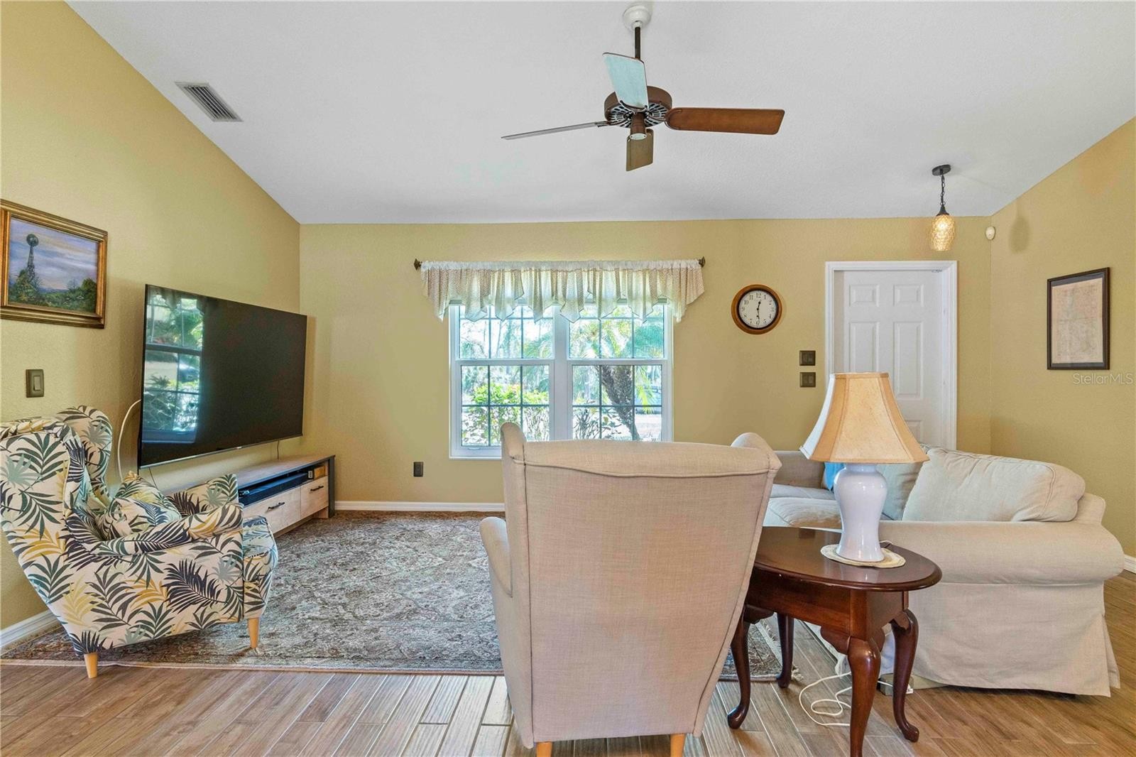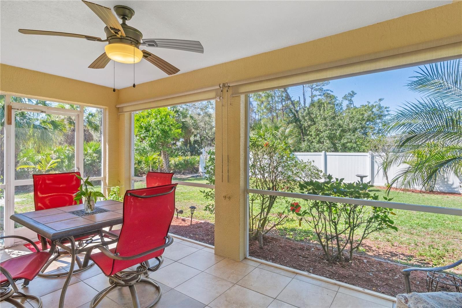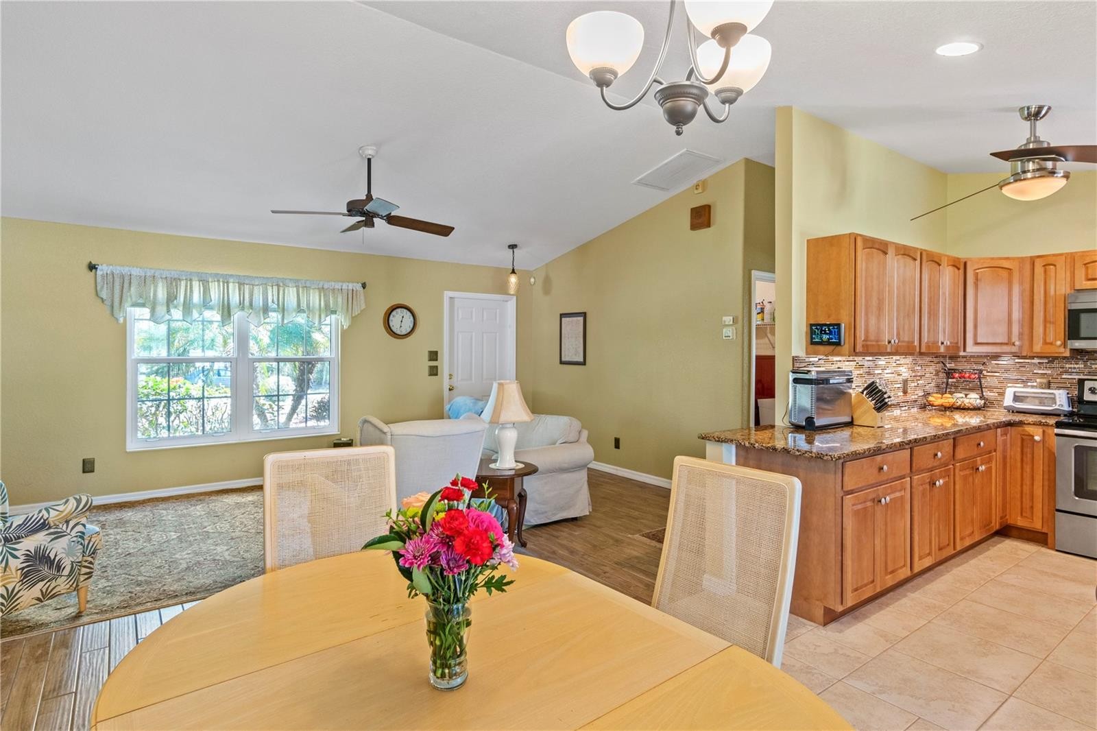 Rare opportunity in North Port, OUT OF THE FLOOD ZONE. Nestled on an expansive ¾-acre lot, this charming 3-bedroom, 2-bath home offers the perfect blend of space, privacy, and modern comfort. Whether you need room for pets, kids, or extra storage for your toys, this property provides endless possibilities—including the potential to create your own outdoor oasis! Step inside to an inviting open-concept living area, where vaulted ceilings in the living room and kitchen create a bright, airy feel. The beautifully updated kitchen features stainless steel appliances, granite countertops, a stylish tile backsplash, and a convenient pass-thru window to the lanai—perfect for entertaining or enjoying outdoor dining. The split floor plan ensures optimal privacy, with the spacious primary suite on one side and the guest bedrooms on the other. The primary bedroom boasts a walk-in closet and an en-suite bathroom with a tiled shower and modern vanity. The guest bedrooms offer peaceful views of the surrounding vacant land, adding to the home’s sense of tranquility. Enjoy the convenience of whole-house reverse osmosis, providing crisp, clean drinking water straight from the tap. The fenced-in yard enhances privacy, while mature trees and plantings create a serene atmosphere. A shed (10x16) offers additional storage, and with plenty of space for equipment, parking, or workspace, this property is an excellent option for a small business owner. Additional updates include a NEW ROOF (2019), HVAC system (2019), GUTTERS (2020), and FENCE (2018), ensuring peace of mind for years to come.