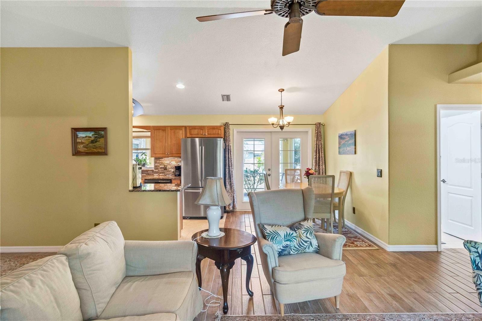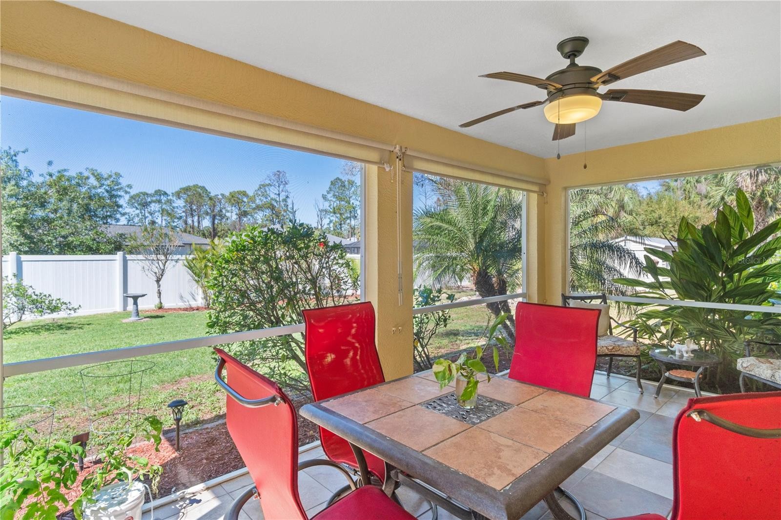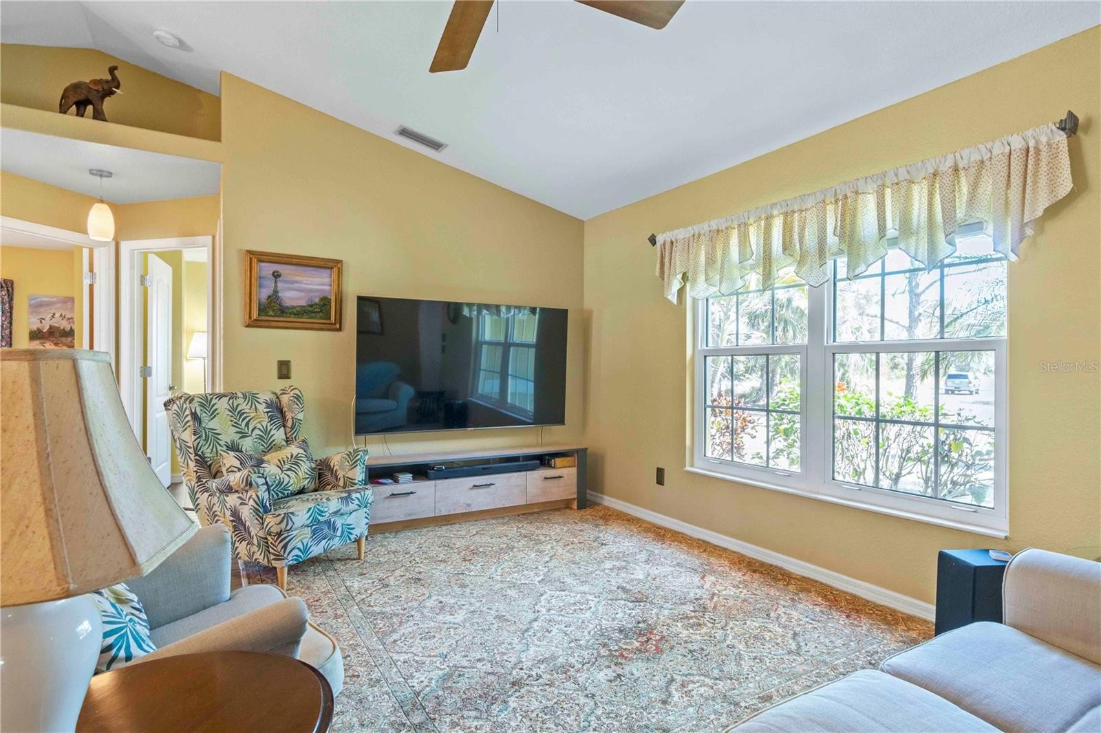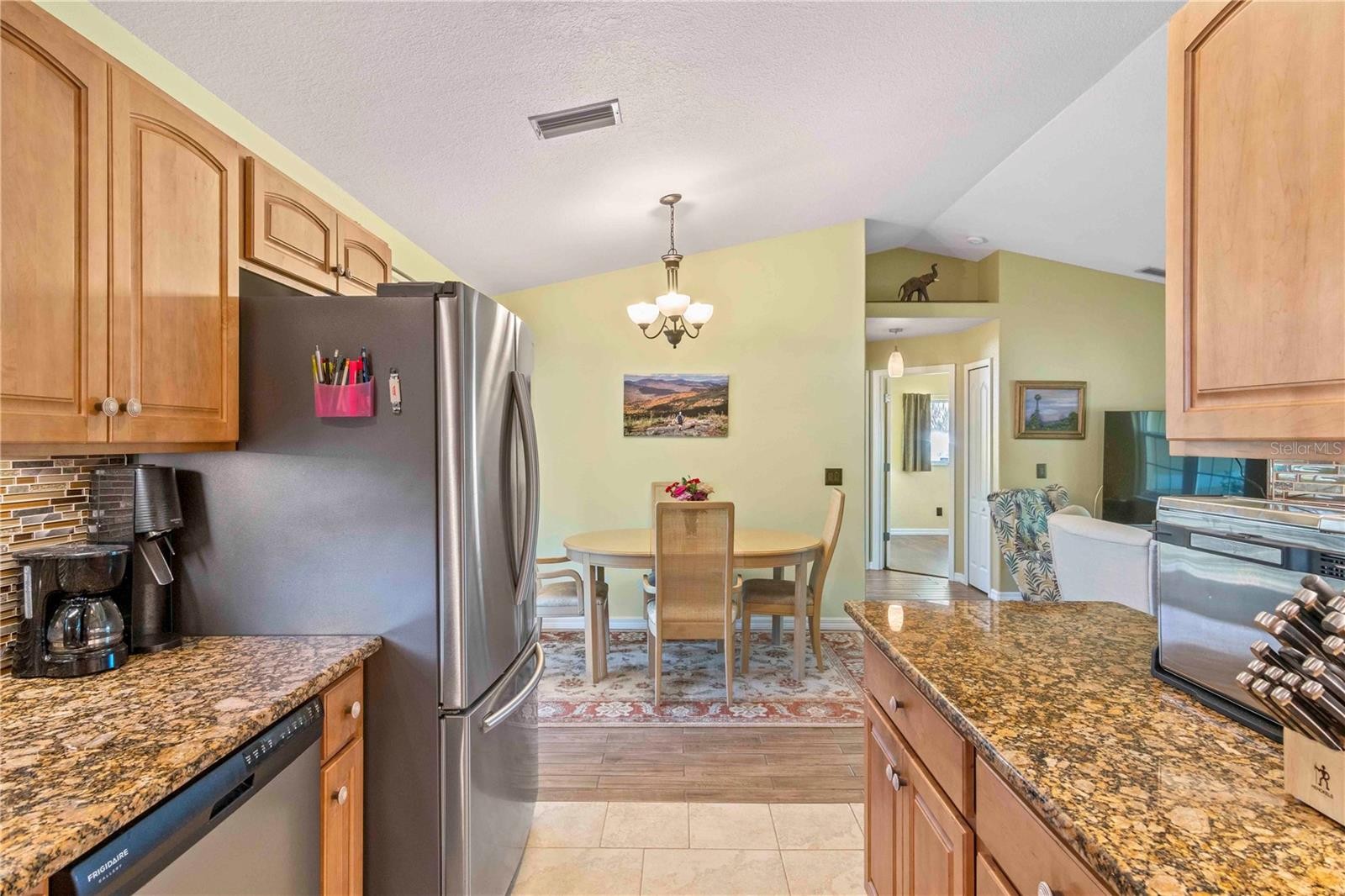Rare opportunity in North Port, OUT OF THE FLOOD ZONE. Nestled on an expansive ¾-acre lot, this charming 3-bedroom, 2-bath home offers the perfect blend of space, privacy, and modern comfort. Whether you need room for pets, kids, or extra storage for your toys, this property provides endless possibilities—including the potential to create your own outdoor oasis! Step inside to an inviting open-concept living area, where vaulted ceilings in the living room and kitchen create a bright, airy feel. The beautifully updated kitchen features stainless steel appliances, granite countertops, a stylish tile backsplash, and a convenient pass-thru window to the lanai—perfect for entertaining or enjoying outdoor dining. The split floor plan ensures optimal privacy, with the spacious primary suite on one side and the guest bedrooms on the other. The primary bedroom boasts a walk-in closet and an en-suite bathroom with a tiled shower and modern vanity. The guest bedrooms offer peaceful views of the surrounding vacant land, adding to the home’s sense of tranquility. Enjoy the convenience of whole-house reverse osmosis, providing crisp, clean drinking water straight from the tap. The fenced-in yard enhances privacy, while mature trees and plantings create a serene atmosphere. A shed (10x16) offers additional storage, and with plenty of space for equipment, parking, or workspace, this property is an excellent option for a small business owner. Additional updates include a NEW ROOF (2019), HVAC system (2019), GUTTERS (2020), and FENCE (2018), ensuring peace of mind for years to come.