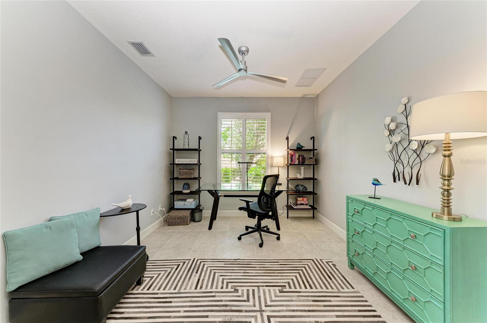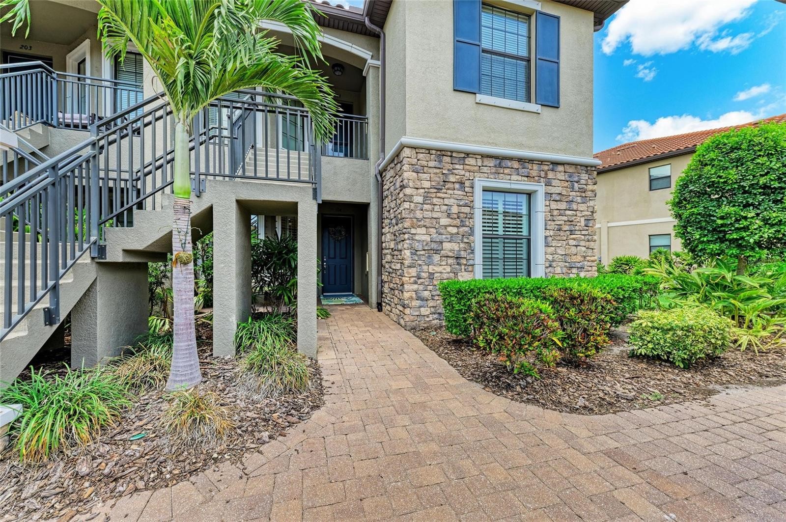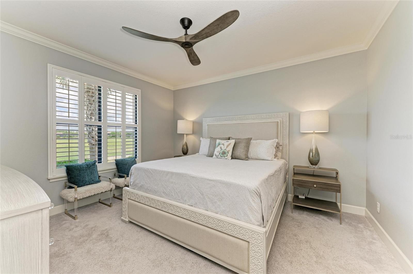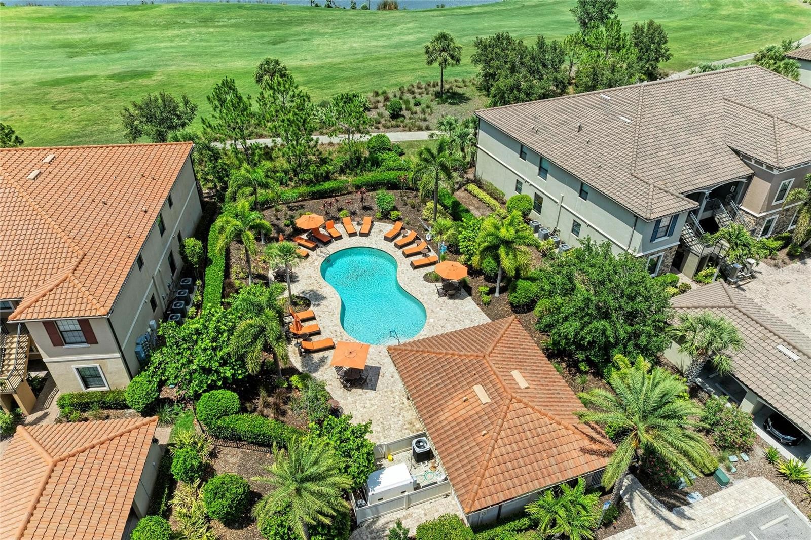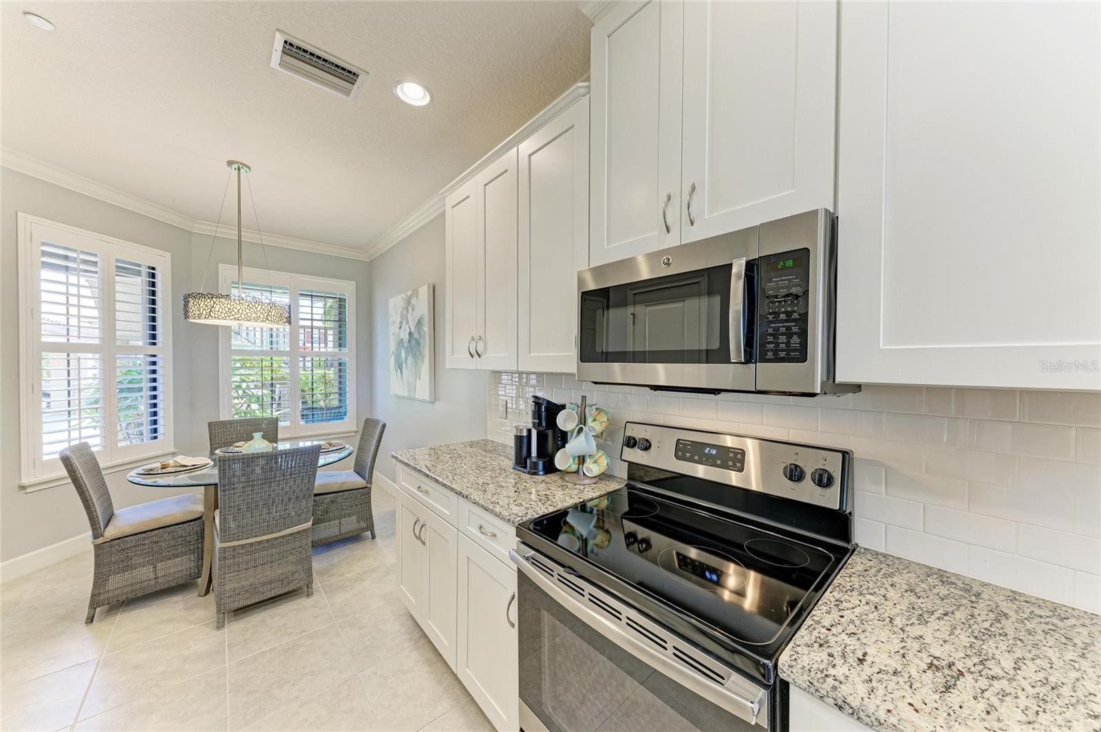 Experience resort-style living in this first floor condominium with a DEEDED GOLF MEMBERSHIP included to Esplanade Lakewood Ranch Golf & Country Club. This luxurious two bedroom, two bath plus office/den is within the gates of Esplanade Golf & Country Club at Lakewood Ranch. The open-concept design end unit allows for a large amount of extra natural lighting, highlighted by high ceilings, modern decorative faux wood panel accent wall, high-end ceiling fans, recessed lighting and crown molding, creating an atmosphere of sophistication and airiness. The kitchen is designed for a culinary enthusiasts and is outfitted with 42-inch cabinets with pullout drawers, granite counters, subway tile backsplash, motion activated under cabinet lights, a pantry with custom shelving and premium GE stainless steel appliances, making meal preparation a pleasure, while overlooking the combined living and dining room and serene golf course views of hole #3 provide a tranquil backdrop for everyday living. Electric shades on the three-panel glass slider offer convenience and privacy at the touch of a button, while elegant plantation shutters adorn the additional windows throughout the unit, enhancing the overall aesthetic. The screened-in balcony is the ideal retreat for savoring your morning coffee or unwinding in the evening, with delightful glimpses of the golf course. Retreat to the primary suite, featuring dual closets with custom built shelving and an ensuite bath with dual sinks, granite counters, private toilet room and a spacious walk-in shower. The guest bedroom offers serenity and tranquility, with a pocket sliding door for privacy and adjacent bath with granite counters and luxurious tub. Enjoy the interior laundry room with built-in cabinetry and extra storage. Benefit from the ease of a one car covered carport, extra guest parking and storage closet, conveniently located near your front door. The furniture is optional to purchase separately. This condominium is just minutes from one of the community’s many inviting pools, the Esplanade Golf & Country Club at Lakewood Ranch offers an ideal blend of luxury and comfort. The association fees include a deeded golf membership, gated community with 24-hour guard, building and landscaping exterior maintenance, water, sewer and trash, and is a pet-friendly community. Residents enjoy access to two gorgeous clubhouses that serve as the heart of social and leisure activities. The 18-hole championship golf course provides a stunning backdrop for perfecting your swing under blue skies, complemented by professional instruction and a pro shop with resort-style service. The Amenity Center features a grand ballroom, library, billiard room, aerobics and fitness facilities, and a catering kitchen. With a full-time director on-site to attend to your needs, you can indulge in the two heated lagoon pools and spa, relax at the tiki bar or enjoy friendly competition on the bocce ball, tennis and pickleball courts. The resistance pool, adventure playground, and canoe and kayak launch provide endless opportunities for fun and fitness, while the barbecue space is ideal for social gatherings. Dining options are equally impressive, with the Barrel House Bistro, Tap Room and fine dining Dodici 951, providing excellent venues to unwind and savor delicious meals. Only a short distance to Lakewood Ranch Main Street, Waterside Place and UTC Mall, allowing for additional entertainment, dining and shopping.