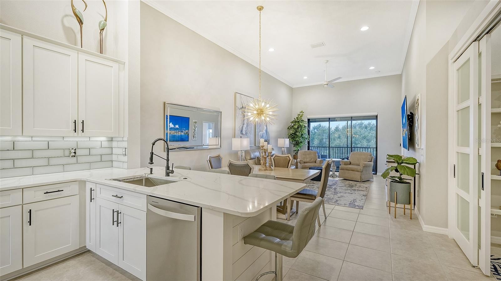 Imagine coming home to a place that feels more like a private retreat than a condo. Tucked inside the resort-style, guard-gated Esplanade Golf & Country Club of Lakewood Ranch, this beautifully renovated home offers a FULL GOLF MEMBERSHIP and one of the most peaceful settings in the community—only eight units per building and serene water views right outside your door. Built in 2020 by Taylor Morrison and upgraded throughout, this residence makes a stunning first impression with its Spanish barrel tile roof and extended paver driveway. Inside, over 1,500 square feet of thoughtfully designed space gives you the flexibility and comfort you’ve been looking for. There are two bedrooms, two bathrooms, and a versatile flex room with frosted sliding doors that can serve as a private office, den, or guest space. Step through the shiplap-accented entry and you’re greeted with 13-foot ceilings, ceramic tile flooring across the entire home, and an open layout perfect for everyday living and entertaining. The kitchen feels like it belongs in a model home—quartz countertops, stainless steel appliances, glass tile backsplash, under-cabinet lighting, white cabinetry, and not one but two pantry spaces, including one with pull-out shelves. A cozy breakfast nook completes the picture. The living area features crown molding and fresh paint, adding just the right touch of sophistication. The owner’s suite is a peaceful sanctuary, offering lake and golf course views, dual walk-in closets, and a spa-inspired ensuite with a seamless glass shower, dual sinks, and a private water closet. The split floor plan places the guest bedroom and bathroom on the opposite side for added privacy. Whether you start your day with coffee or end it with a sunset, the screened-in balcony is the perfect spot to relax and soak in the water views and evening skies while golfers pass by in the distance. Living in Esplanade means every day feels like a vacation. Your golf membership is already included, and you’ll have access to a championship course, a state-of-the-art clubhouse with a fitness and wellness center, the Koquina Sand Spa, four resort-style pools (including a lagoon-style heated pool and resistance pool), and endless activities—pickleball, tennis, bocce, dog park, and more. Dining options abound with the Bahama Bar, Culinary Center, and Barrel House Bar and Bistro just a golf cart ride away. All of this is minutes from A-rated schools, Waterside Place, UTC Mall, dining, entertainment, and some of Florida’s best beaches. Luxury, convenience, and lifestyle come together seamlessly—this is the one you’ve been waiting for.