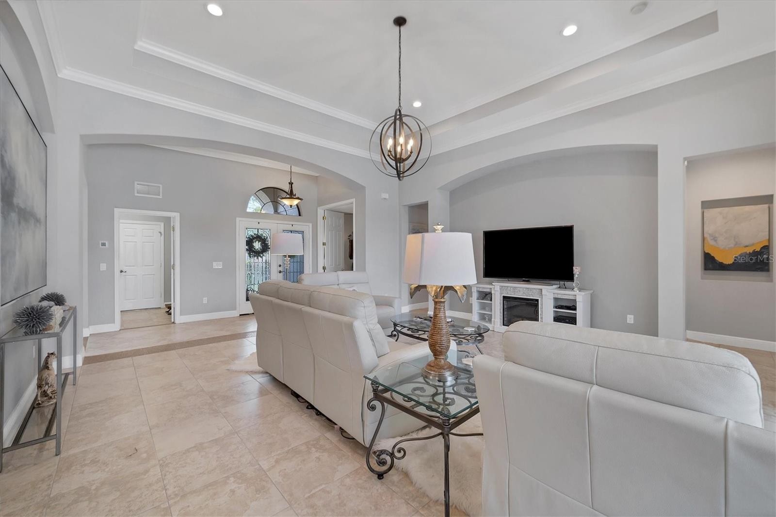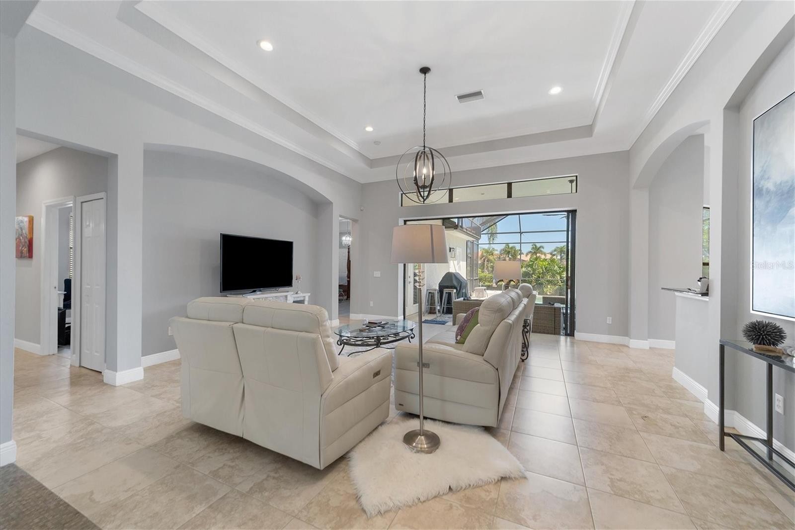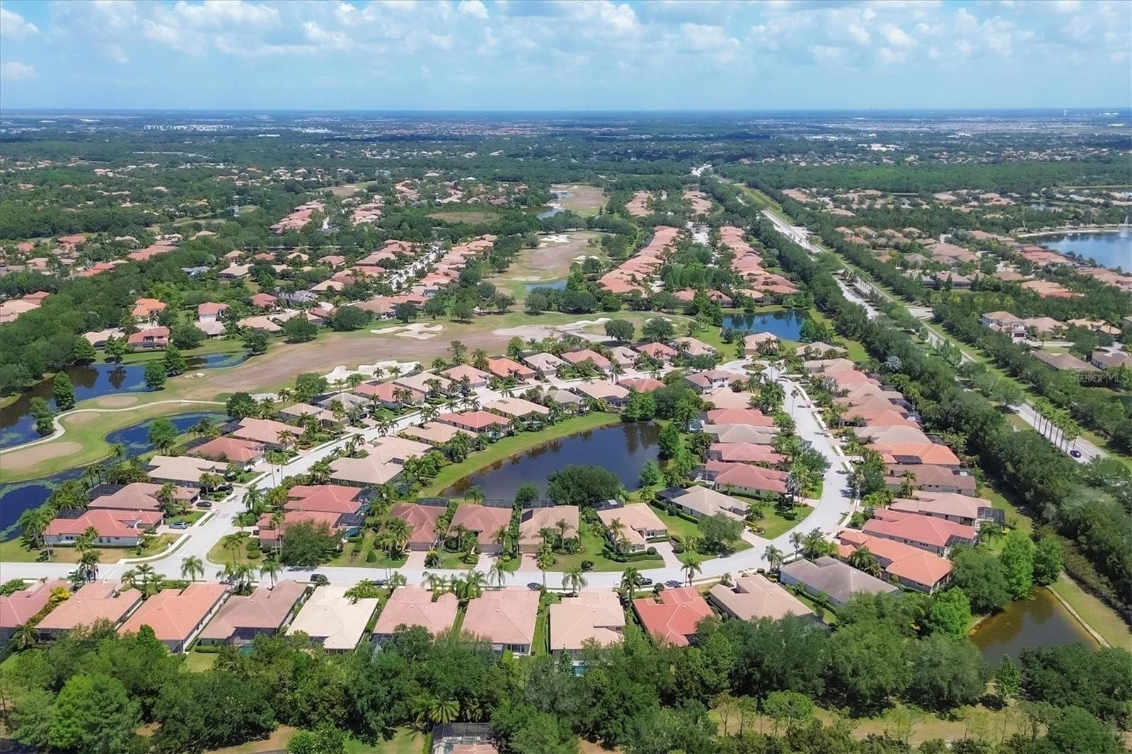 This beautifully appointed three-bedroom, two-bath plus office, maintenance-free Neal-built home offers serene water views and is ideally in the prestigious Lakewood Ranch Country Club, just one block from the main clubhouse. Designed for effortless Florida living, the home blends refined upgrades with a prime golf course community lifestyle. A newly painted exterior, manicured landscaping and a paver walkway welcome you to this beautiful home. Inside, the residence showcases thoughtful enhancements throughout, including new designer light fixtures, tile, and luxury vinyl flooring that add warmth and timeless appeal. Architectural arches, double glass doors, and pocketing sliding glass doors enhance the open, airy design while creating a seamless transition between indoor and outdoor living spaces. The spacious great room features high ceilings with tray detailing, abundant natural light and pocketing sliders that open to the lanai, making it ideal for entertaining and everyday living. Just off the great room, a private home office with French doors provides a quiet and functional workspace. At the heart of the home, the chef’s kitchen is stylish and functional, featuring abundant wood cabinetry, newly updated appliances, and generous counter space designed for cooking and entertaining. A charming eat-in breakfast nook offers a spot for casual dining while enjoying views of the outdoor living area, making this kitchen a welcoming hub for daily living and gatherings alike. The primary suite serves as a peaceful retreat, complete with French doors leading to the lanai and an en-suite bath featuring double vanities, a garden tub and a large walk-in shower. Two additional bedrooms and a guest bath offer comfortable accommodations for family and visitors. Go outside to the expansive covered lanai, ideal for outdoor dining or relaxing while enjoying tranquil water views. The saltwater heated pool overlooks the picturesque pond, creating a private backyard oasis. Recent upgrades include washer and dryer, recently installed HVAC and water heater, and a re-screened lanai. Residents of Lakewood Ranch Country Club enjoy access to exceptional amenities including championship golf, tennis, pickleball, a fitness and wellness center, resort-style pools, and multiple dining and social options. Ideally in one of America’s top-selling planned communities with A-rated schools, this home is just minutes from UTC shopping and dining, SRQ Airport, and a short drive to downtown Sarasota and world-class Gulf beaches.