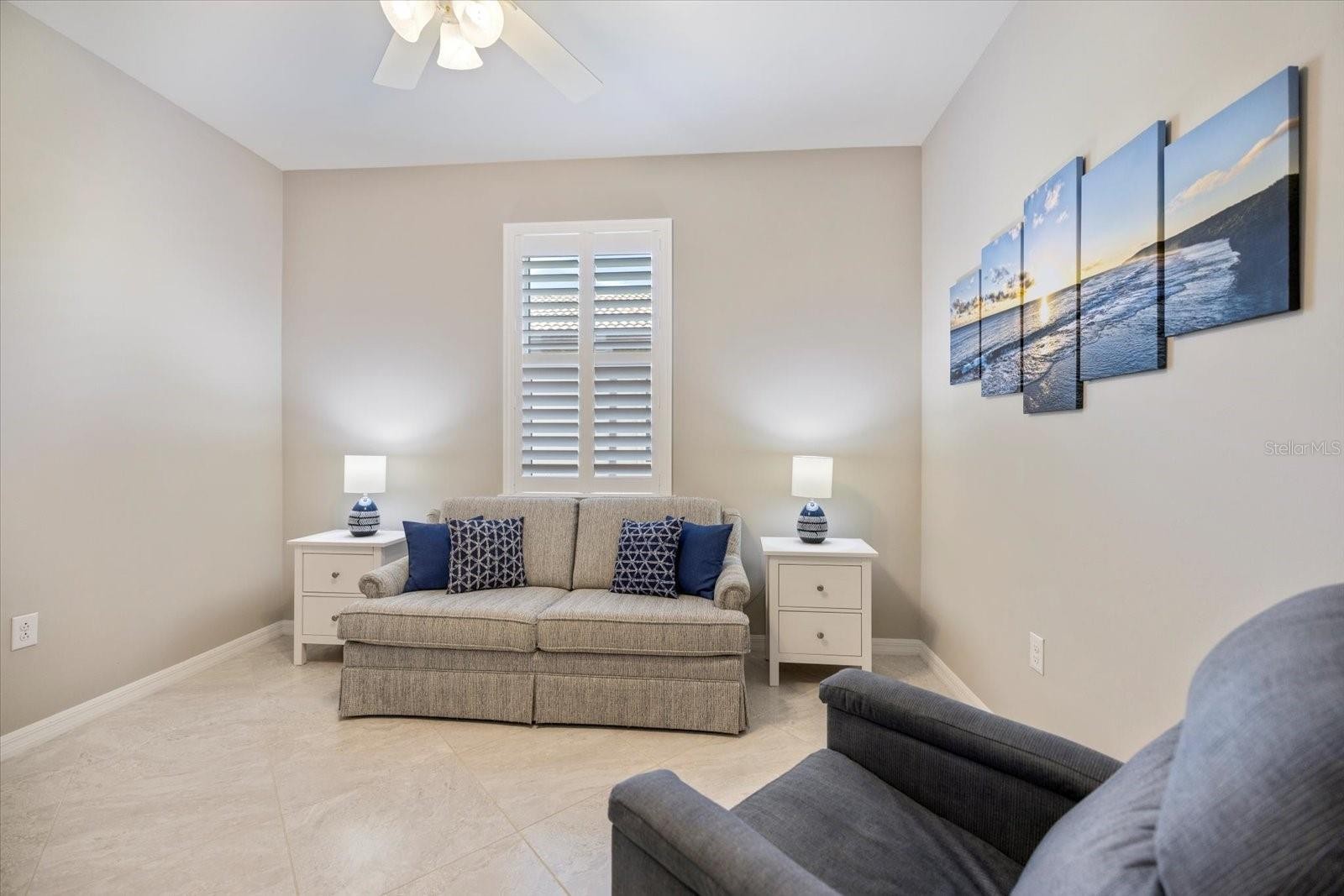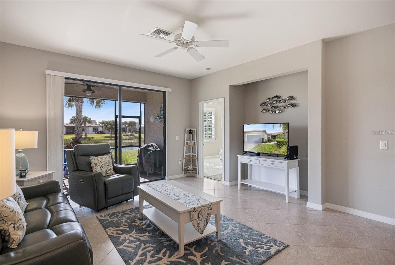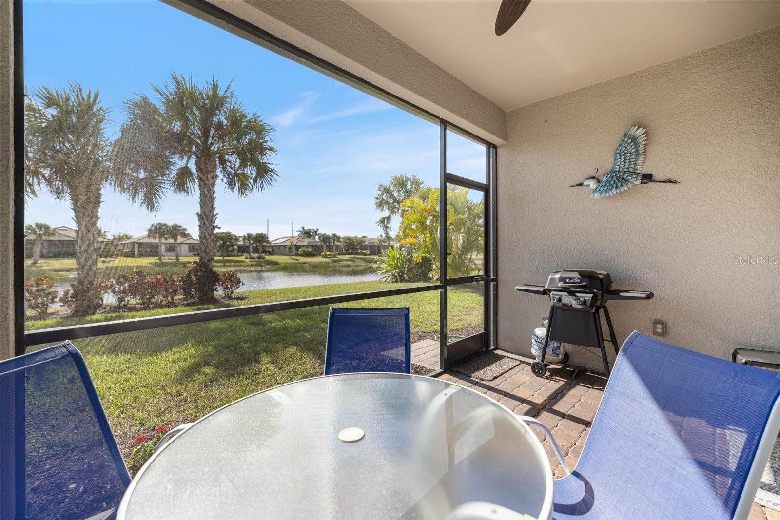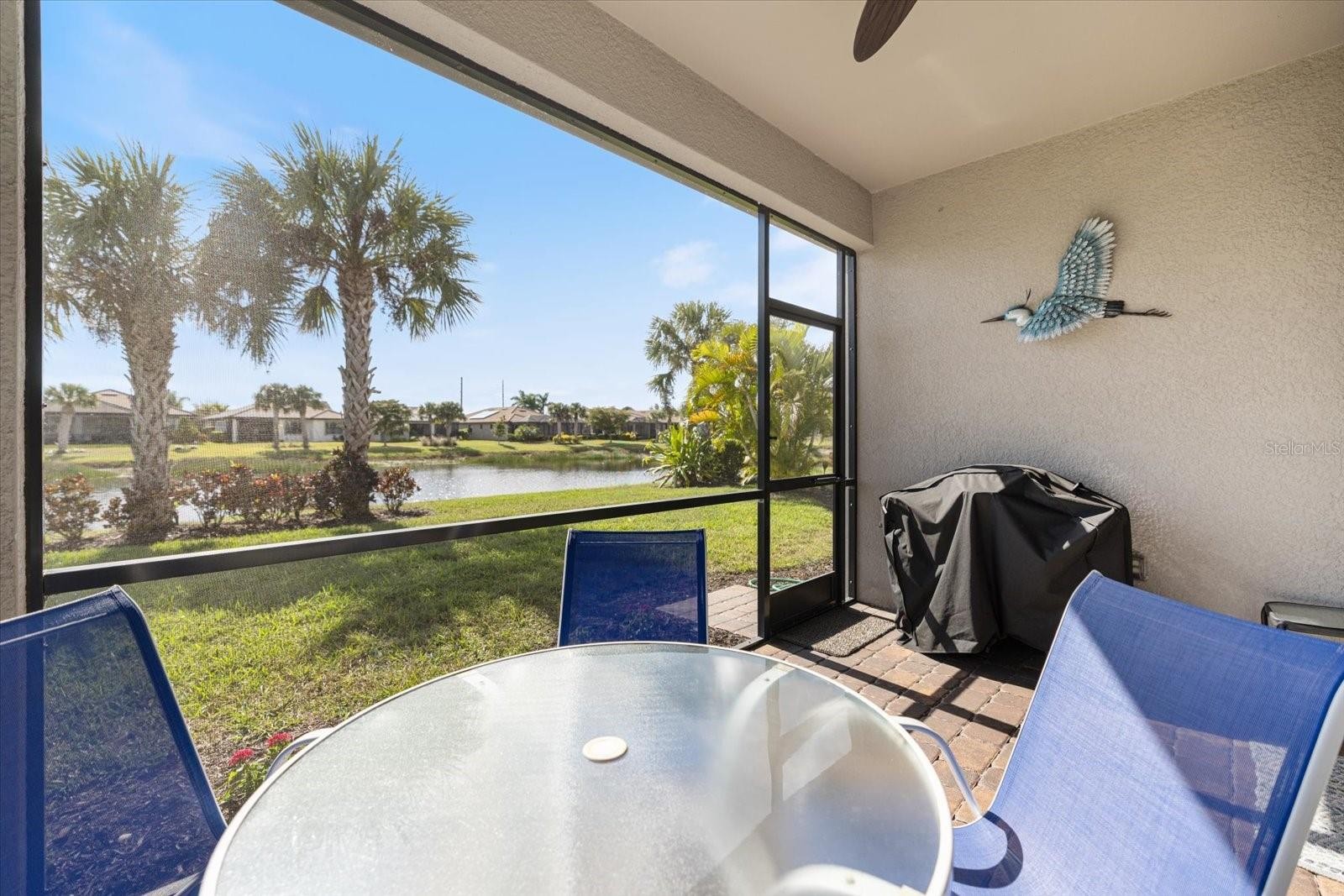 Beautifully upgraded CASCADIA model with IMPACT WINDOWS! HIGHLY desirable SOUTHERN EXPOSURE! This desired TURN KEY/Furnished model is spacious and well appointed with two bedrooms PLUS a den/office, two full bathrooms and an attached two car garage. This end unit villa is situated on a quiet cul de sac. With lots of light and a beautiful view of the lake off the serene covered lanai(patio set and grill stay with the house), this home is ready for it's next owner! Some of the many upgrades include quartz counters in kitchen and baths, plantation shutters, accordion blind on slider, oversized 21" porcelain tiles, wood cabinets throughout and much more! Kitchen has stainless steel appliances, tile backsplash, room to eat, closet pantry and breakfast bar. Primary bedroom is spacious and looks out onto the lake. The primary bathroom has a large walk in shower with glass door and tile with an inlay of decorative tile, and upgraded vanity. This split plan is the perfect winter home or full time residence for the couple looking to live in one of the most popular communities in the West Villages! IslandWalk features a Resort Center with world-class amenities and full time activities director-there isn't a more active community than this! HOA fees cover maintenance of grounds (lawn, mulching), basic cable and all amenities!