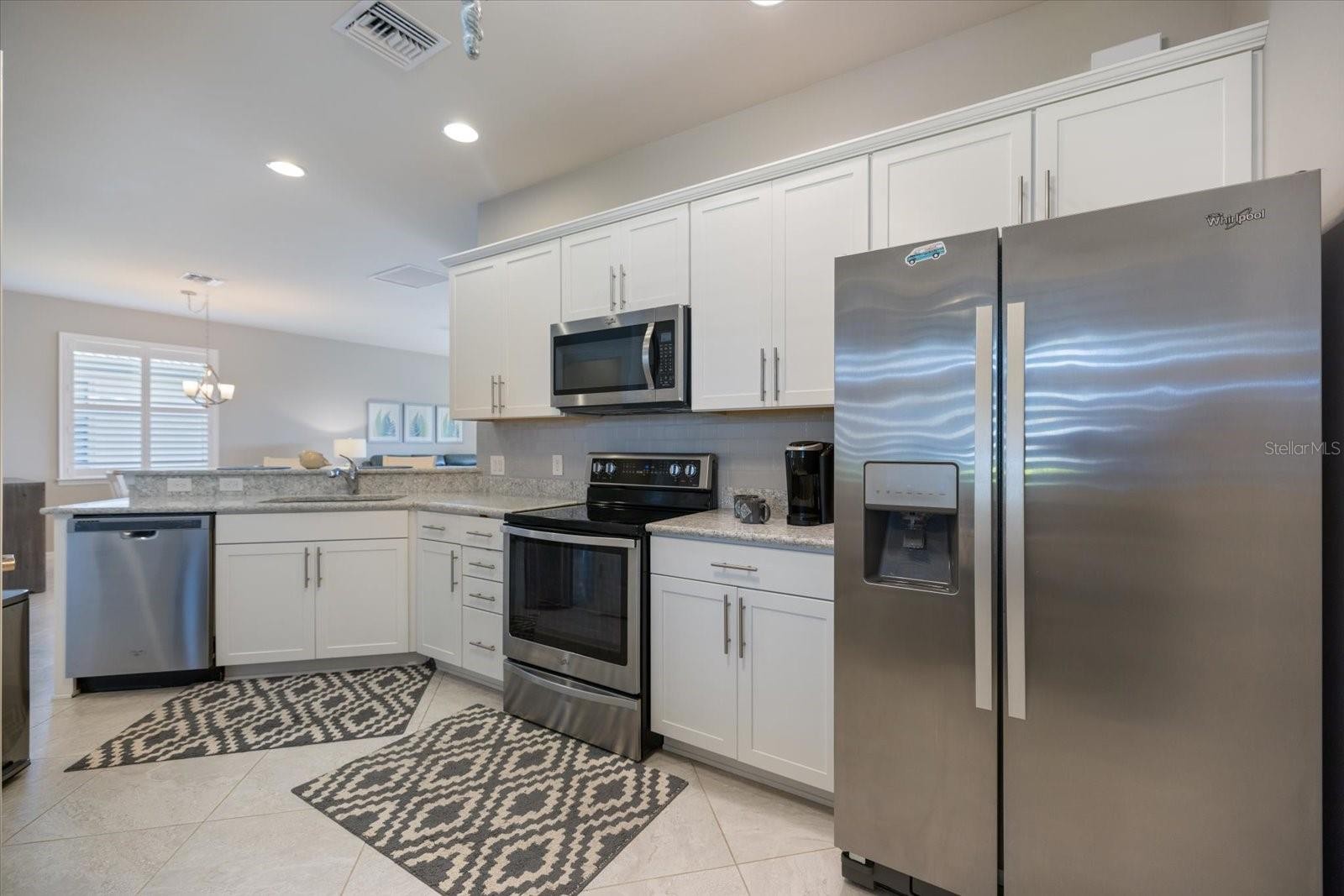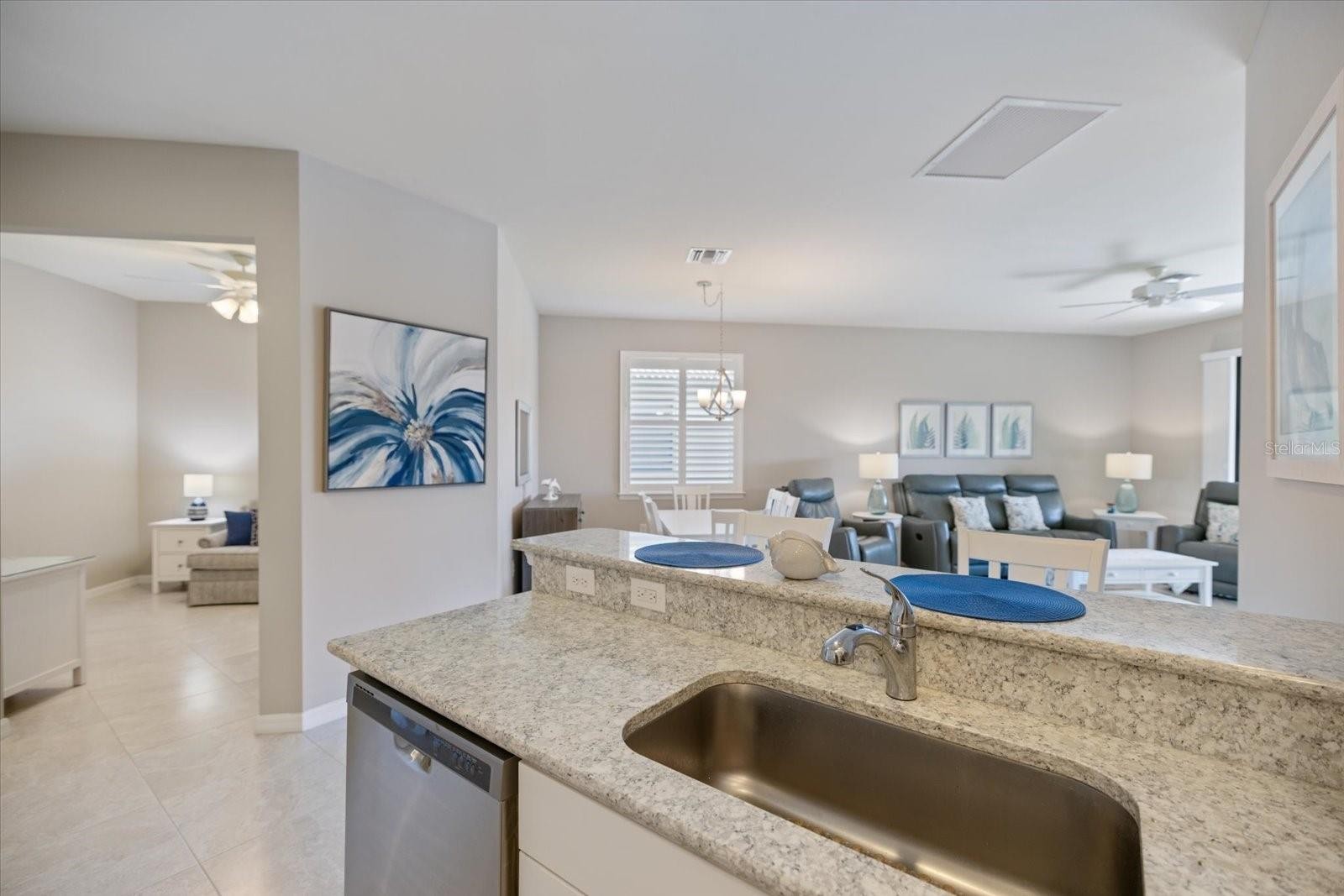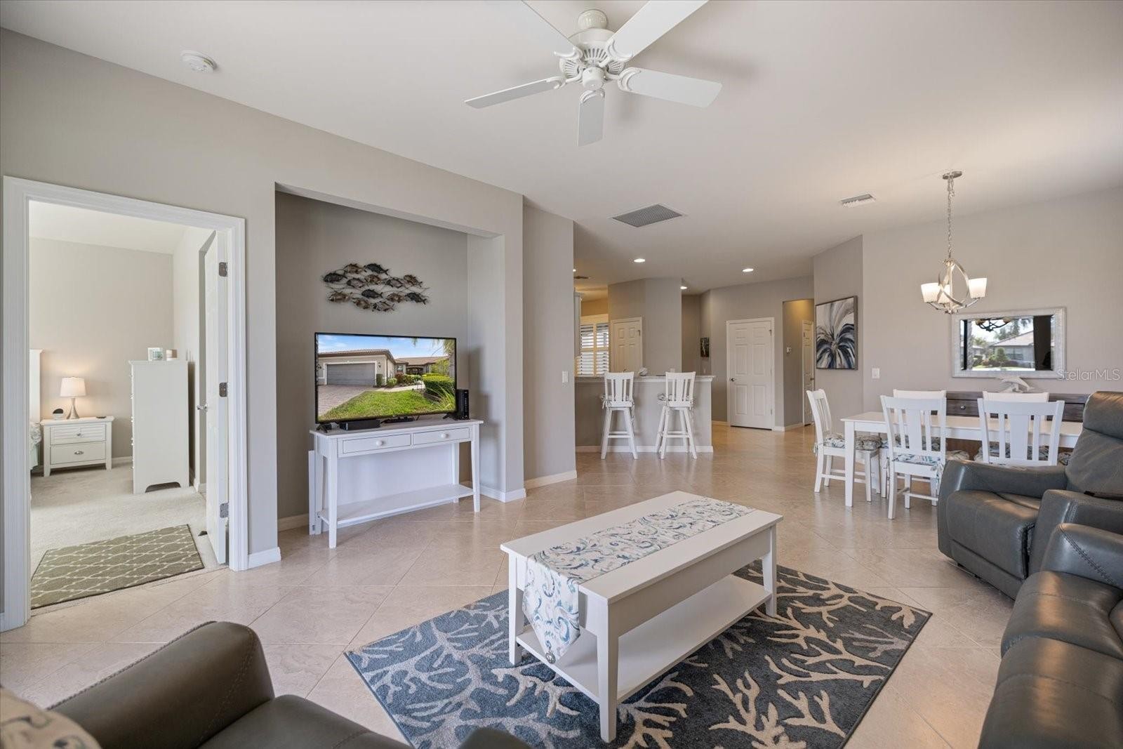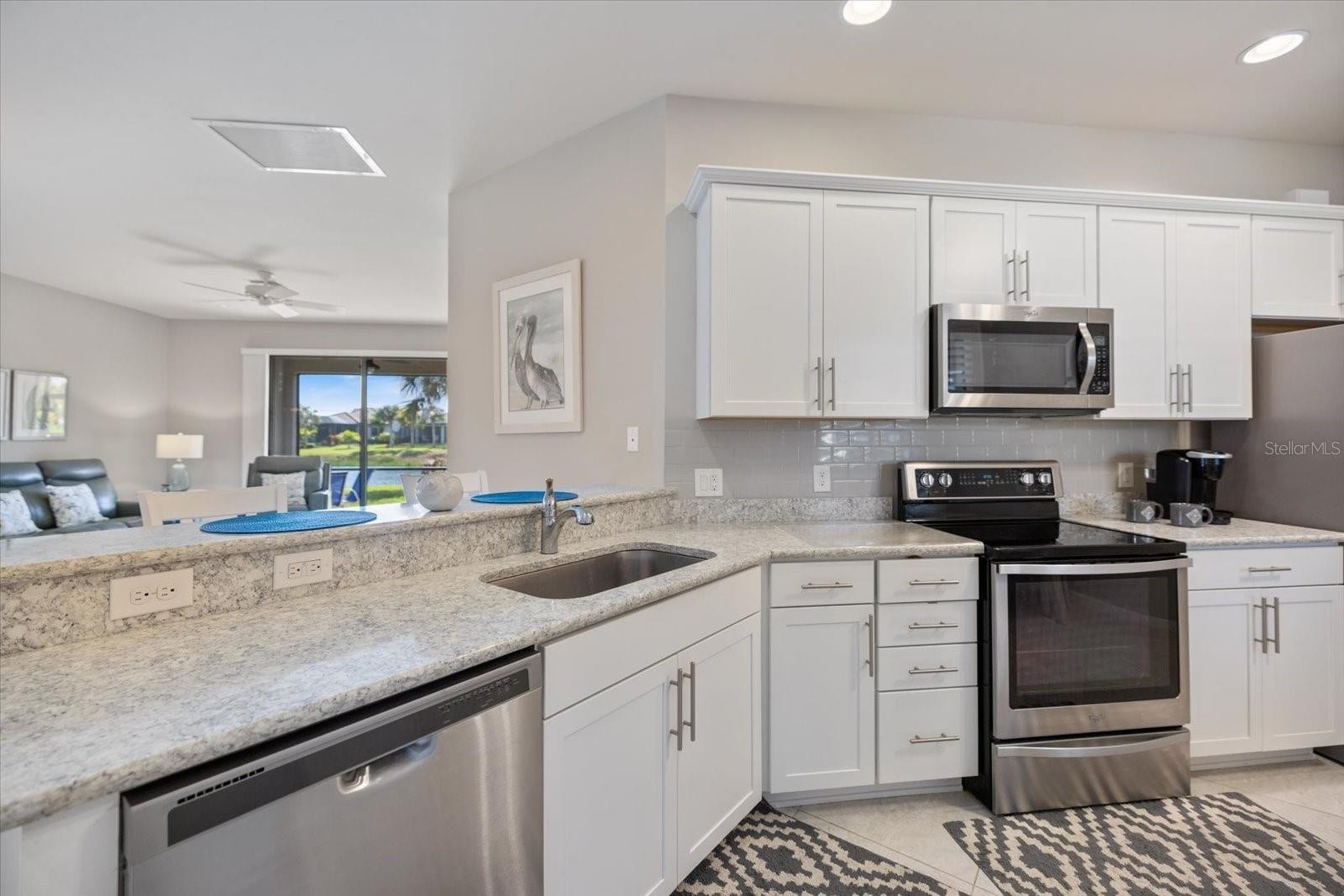 Beautifully upgraded CASCADIA model with IMPACT WINDOWS! HIGHLY desirable SOUTHERN EXPOSURE! This desired TURN KEY/Furnished model is spacious and well appointed with two bedrooms PLUS a den/office, two full bathrooms and an attached two car garage. This end unit villa is situated on a quiet cul de sac. With lots of light and a beautiful view of the lake off the serene covered lanai(patio set and grill stay with the house), this home is ready for it's next owner! Some of the many upgrades include quartz counters in kitchen and baths, plantation shutters, accordion blind on slider, oversized 21" porcelain tiles, wood cabinets throughout and much more! Kitchen has stainless steel appliances, tile backsplash, room to eat, closet pantry and breakfast bar. Primary bedroom is spacious and looks out onto the lake. The primary bathroom has a large walk in shower with glass door and tile with an inlay of decorative tile, and upgraded vanity. This split plan is the perfect winter home or full time residence for the couple looking to live in one of the most popular communities in the West Villages! IslandWalk features a Resort Center with world-class amenities and full time activities director-there isn't a more active community than this! HOA fees cover maintenance of grounds (lawn, mulching), basic cable and all amenities!