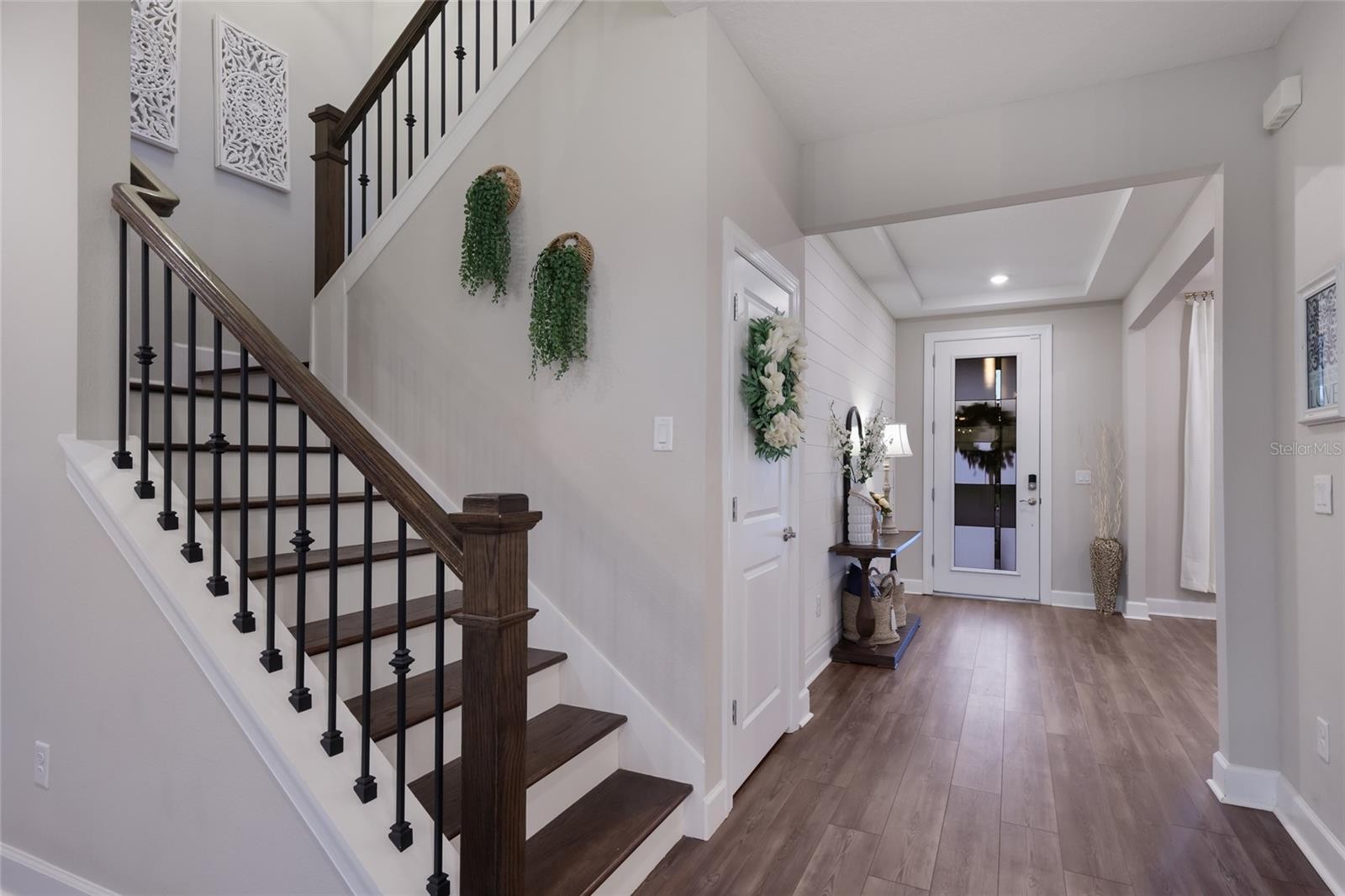 This STUNNING five bedroom, three bathroom Meritage home offers 2,988 sq. ft. of thoughtfully designed living space with a two car garage, located within the sought-after gated community of Savanna in Lakewood Ranch. From the moment you enter, you’re welcomed by a BEAUTIFUL entryway featuring TRAY ceilings and a striking modern wood ACCENT wall, setting the tone for the rest of the home. A versatile front room can be used as a FORMAL dining area or flex space and offers lovely views of the outdoors. The open concept floor plan flows seamlessly into the kitchen and living room combination, making it perfect for entertaining. The kitchen is a chef’s dream with UPGRADED cabinetry, TILED backsplash, BUILT-IN oven, cooktop, stainless steel hood, stainless steel appliances, an island with seating, modern pendant lighting, and a walk-in pantry. Just off the kitchen is a casual dining area with sliders overlooking the pond and backyard. The living room is both inviting and serene, featuring windows with lanai views and another MODERN WOOD ACCENT wall. The first floor also includes a convenient bedroom or office, along with a beautifully upgraded full bathroom featuring a modern vanity, tub/shower combo, stylish wood detailing, and DESIGNER wallpaper. LUXURY VINYL plank flooring runs throughout the entire first floor. Upstairs, updated WOOD STAIRS AND RAILINGS lead to an open media room, ideal for movie nights or a game room. The primary suite is bright and spacious, with pond views, tray ceilings, a wood accent wall, and an ensuite bath offering dual sinks and a walk-in glass enclosed tiled shower. Three additional generously sized bedrooms share a full bath with dual sinks and a tub/shower combo. The laundry room is conveniently located upstairs and includes cabinetry and a utility sink. All bedrooms feature upgraded carpet. Step outside to a PEACEFUL, fully FENCED backyard with a covered paved lanai, sealed pavers, and tranquil pond views, creating the perfect setting for entertaining, relaxing, or enjoying breathtaking sunsets. The home is enhanced by UPGRADED LANDSCAPING with PALM TREES and white STONE accents, adding to its curb appeal. A new humidifier system has also been installed. This move-in-ready home is truly a GEM, with every detail thoughtfully designed. Savanna is a fabulous community with LOW HOA resort-style amenities such as a clubhouse, swimming pool, state-of-the-art fitness center, basketball courts, playground, dog park and numerous walking paths. Lakewood Ranch is known for their A+ rated school system and is perfectly located just a short ride to downtown Sarasota, St. Pete, world class shopping, fine dining and the FAMOUS Gulf beaches! Don't wait to make this your HOME and begin your FLORIDA Lifestyle!
