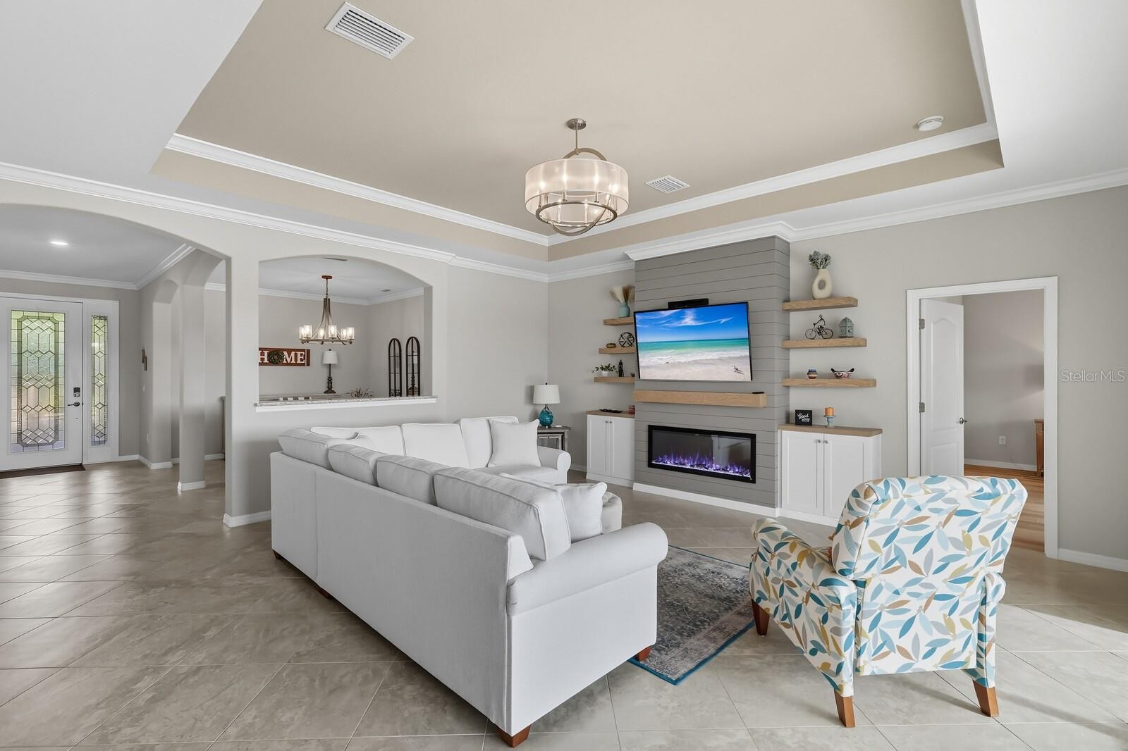 WELCOME to this STUNNING Princeton II model by Lennar featuring 4 bedrooms, 2 baths, and a 3 car garage, located in the highly sought after community of Savanna in Lakewood Ranch. As you enter through the ELEGANT front door, you are greeted by a SPACIOUS open floor plan and a FORMAL dining area that flows seamlessly into the large great room. The living area features a tray ceiling, a CUSTOM built-in electric fireplace with shelving and cabinetry, and glass sliders that open to your peaceful lanai making it perfect for COZY nights or relaxing with family. The kitchen is BEAUTIFULLY designed with stainless steel appliances, a tile backsplash, granite countertops, and a large island with a sink which is ideal for entertaining guests. It also includes a REVERSE OSMOSIS WATER FILTRATION SYSTEM under the sink and a separate casual dining area with glass doors and windows overlooking the sparkling pool. The PRIVATE primary suite offers tranquil views of the pool and pond, with its own lanai access through a glass door. This RETREAT features a tray ceiling, a CUSTOM walk-in closet system, and an ensuite bath complete with dual sinks, granite countertops, a garden tub, and a walk-in glass tiled shower. On the opposite end of the home, three additional bedrooms and a full bathroom with a tub/shower combo provide plenty of space for family and guests. Step outside into your own outdoor OASIS featuring a custom HEATED SALTWATER POOL and SPA with an automatic in-floor cleaning system. The Hayward pool equipment includes remote controls for easy operation. The pool pump was recently replaced, and the salt cell was updated in 2024. The screened lanai is surrounded by LUSH landscaping and overlooks a serene pond, creating the perfect backdrop for entertaining or simply enjoying the Florida sunsets. This home is loaded with upgrades, including a WHOLE-HOUSE WATER SOFTENER, Wi-Fi compatible LG refrigerator and Bosch dishwasher, CROWN MOLDING throughout, LUXURY VINYL plank flooring in all bedrooms, UPGRADED lighting and remote controlled ceiling fans, Hunter Douglas motorized shade on the sliding doors, a custom BUILT-IN office workspace with additional storage, smart home features such as Wi-Fi front door lock and camera, thermostat, and Ethernet connections in bedrooms, office, and family room, an AC PURIFICATION system with dual GERMICIDAL UV lights, and an overhead storage rack in the 3 car garage. This METICULOUSLY maintained home is truly move-in ready, combining comfort, style, and modern functionality in one perfect package. Savanna is a fabulous community with LOW HOA resort-style amenities such as a clubhouse, swimming pool, state-of-the-art fitness center, basketball courts, playground, dog park and numerous walking paths. Lakewood Ranch is known for their A+ rated school system and is perfectly located just a short ride to downtown Sarasota, St. Pete, world class shopping, fine dining and the FAMOUS Gulf beaches! Don't wait to make this your home and begin your FLORIDA Lifestyle!