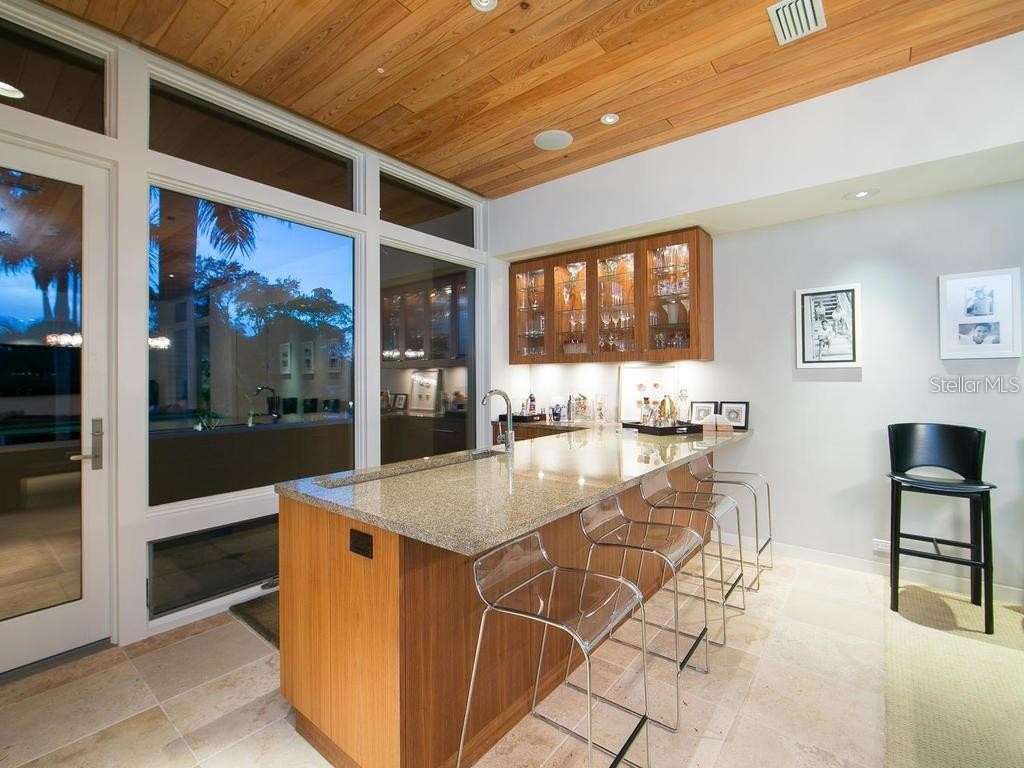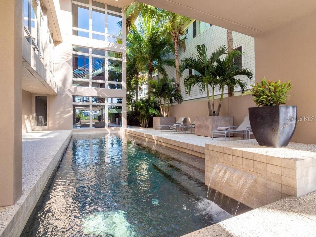 Privately positioned in gated Oyster Bay Landings with limitless water views stretching down a short canal to Sarasota Bay, this stunning iconic masterpiece from world-renowned architect Guy Peterson is a breathtaking example of the Sarasota School of Architecture’s style and vision. A comfortable modernistic ambiance flows freely throughout the 5,428 sq. ft. of open living where walls of glass capture spectacular displays of the cerulean blue water and evening skies of fiery beauty. No detail has been overlooked. No expense has been spared. Architecturally striking, this 4-bedroom, 4.5-bath waterfront residence is the ultimate indulgence offering rarity, cachet and grandeur. A shared dock with 2 lifts is conveniently situated on a waterway unencumbered by any bridge. Floor to ceiling windows frame expansive vistas and abundant natural light complements the thoughtfully-appointed and expertly-planned space. Over 4,000 square feet of outdoor area is inviting and festive, and presents unique vantage points to deliver an exhilarating experience. Expansive terraces promote seamless indoor-outdoor living. Covered entertaining is abundant among the verdant tropical gardens and immaculately manicured grounds. Resort-style amenities including an elevator, courtyard with fire pit and heated pool/spa, and breathtaking reflecting pool with fountain. The stunning kitchen is a culinary delight and complemented by an extravagant amenities package of top-tier appliances, island with seating for 6, 20-ft. long counter for 2 desk workstations, side-by-side but separate refrigerator and freezer, 2 dishwashers, and deep walk-in pantry. The family room is equipped with built-in entertainment wall and opens to a waterfront patio with outdoor cooking center. The great room has travertine floors and cypress ceiling detail, and the office provides a desk with stone countertops and plenty of solid wood cabinetry. A 400-bottle wine room is the highlight of the gaming area with wet bar, electric shades and unique glass chandelier. On the third level are spa-inspired en-suite bedrooms with custom closet systems and elevated ceilings. A 30-ft. bridge leads to the master wing highlighted by incredible water views, sitting room with morning bar, and home gym/office. The primary bath creates an immersive experience with a 16-ft. long dressing hall with a wall of built-ins and mirrors, large walk-in specialty closet, multi-faceted shower, deep soaker Jacuzzi tub, separate bidet and laundry chute. In addition, there are two laundry areas, an elevator from ground level to the 2nd and 3rd floors, Creston music and lighting system, Generac generator, and 4-car garage. In one of Sarasota’s most coveted locations along the waterfront, this home redefines coastal living is just minutes from beaches, golf, fine dining and downtown Sarasota’s beloved arts and cultural offerings. When scheduling your exclusive tour of this amazing waterfront estate, make sure to allow plenty of time for exploring its incredible features, both inside and out. It must be seen in person to be fully appreciated. Even the most discerning buyer will fall in love!