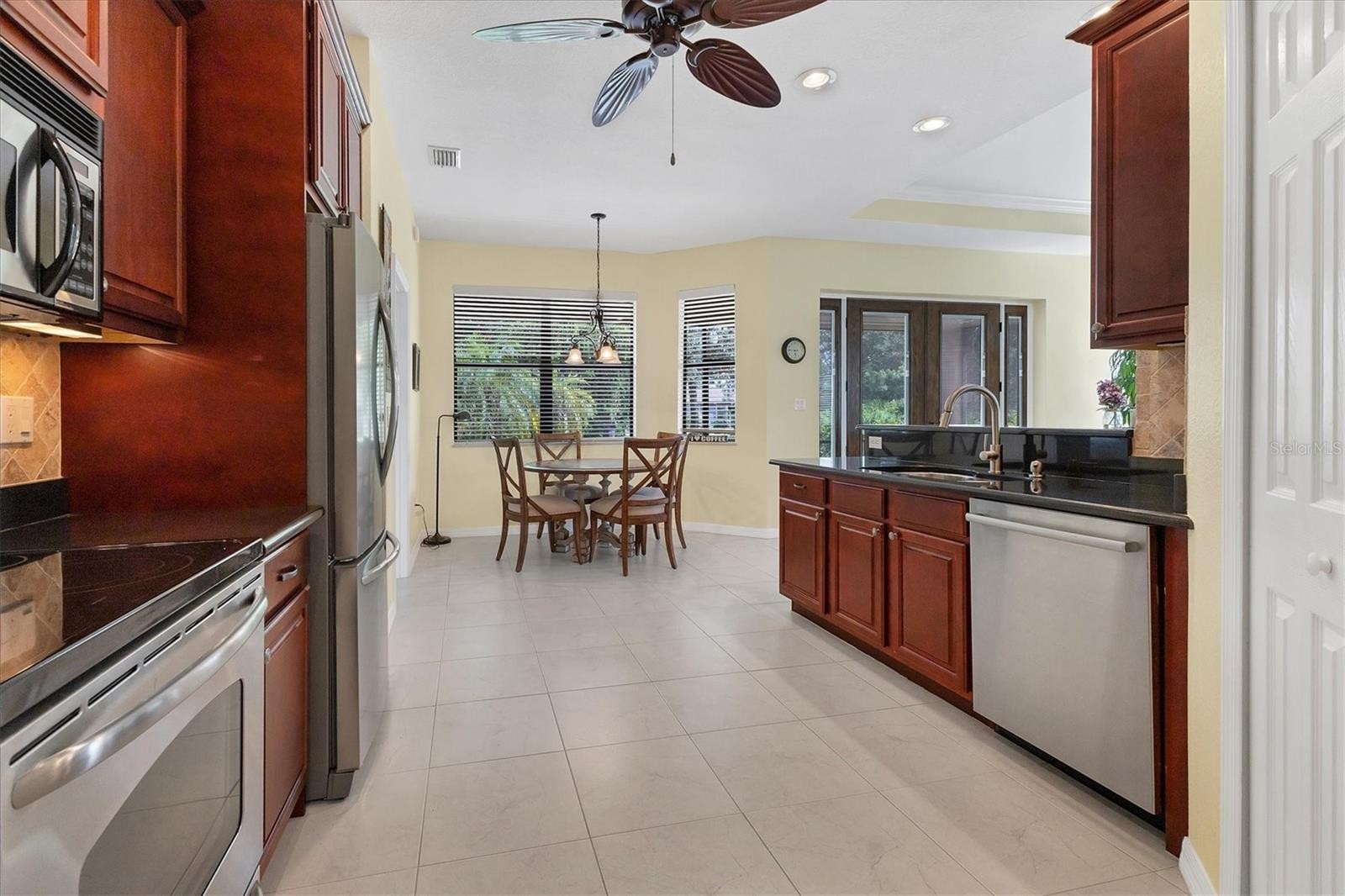 Beautiful 3-Bedroom, 2-Bath Villa in Woodhaven Estates! Discover comfort, space, and style in this larger, newer villa in desirable Woodhaven Estates. Built in 2007 and featuring impact window and doors, this beautifully maintained 3-bedroom, 2-bath home offers 1,616 sq. ft. of air-conditioned living space with a two-car garage and an inviting screened-in front porch. Step inside to find large porcelain tile on the diagonal in the living areas and luxury plank laminate flooring in the bedrooms, coffered and tray ceilings (some with crown molding), and a bright open great room design with high ceilings. The primary suite features a tray ceiling, French doors that open to the oversized pavered lanai and extra rear patio—perfect for relaxing or entertaining. The ensuite primary bath has dual vanities and granite counters, a huge walk-in shower, separate water closet and linen closet. Private, roomy 2nd bedroom wing along with the guest bath which includes granite counters and a tub/shower combo. The third bedroom/office features elegant French doors, a closet and a bump out for more space and light. The spacious kitchen features wood cabinetry (including 42” upper cabinets with crown molding), granite countertops, double stainless-steel sink, stainless appliances and a breakfast bar that flows seamlessly into the great room living area; perfect for both casual meals and entertaining. The casual dining area includes a convenient bump-out that fills the space with natural light. Enjoy mature landscaping that provides privacy, adjacent green space. More thoughtful details throughout—gutters all around, instant hot water, and an inside utility room with washer and dryer included. The oversized two-car garage offers a workshop area and a new garage storage system with a durable epoxy floor. Recent updates include a new roof (2023) and air conditioner (2017) water heater with instant hot water (2021). This home is being offered fully furnished—including dishes, cookware, and small appliances (seller reserves the right to exclude personal property and will provide an exclusion list). Beautifully located in a quiet neighborhood with public water and sewer and great access to I75 and US 41! Just off Toledo Blade Blvd which offers all the amenities you love; Aldi, Publix, new Chipotle under construction, emergency medical, Library, car maintenance, WaWa and restaurants all within a mile. Located between two Spring Training Baseball stadiums and about 45 minutes to multiple beautiful area beaches and Ft Myers Regional airport. Perfect for a winter retreat or your year round enjoyment! Don’t miss this rare opportunity to own one of the most spacious and well-appointed villas in Woodhaven Estates—ready for you to move right in and start living the Florida lifestyle!