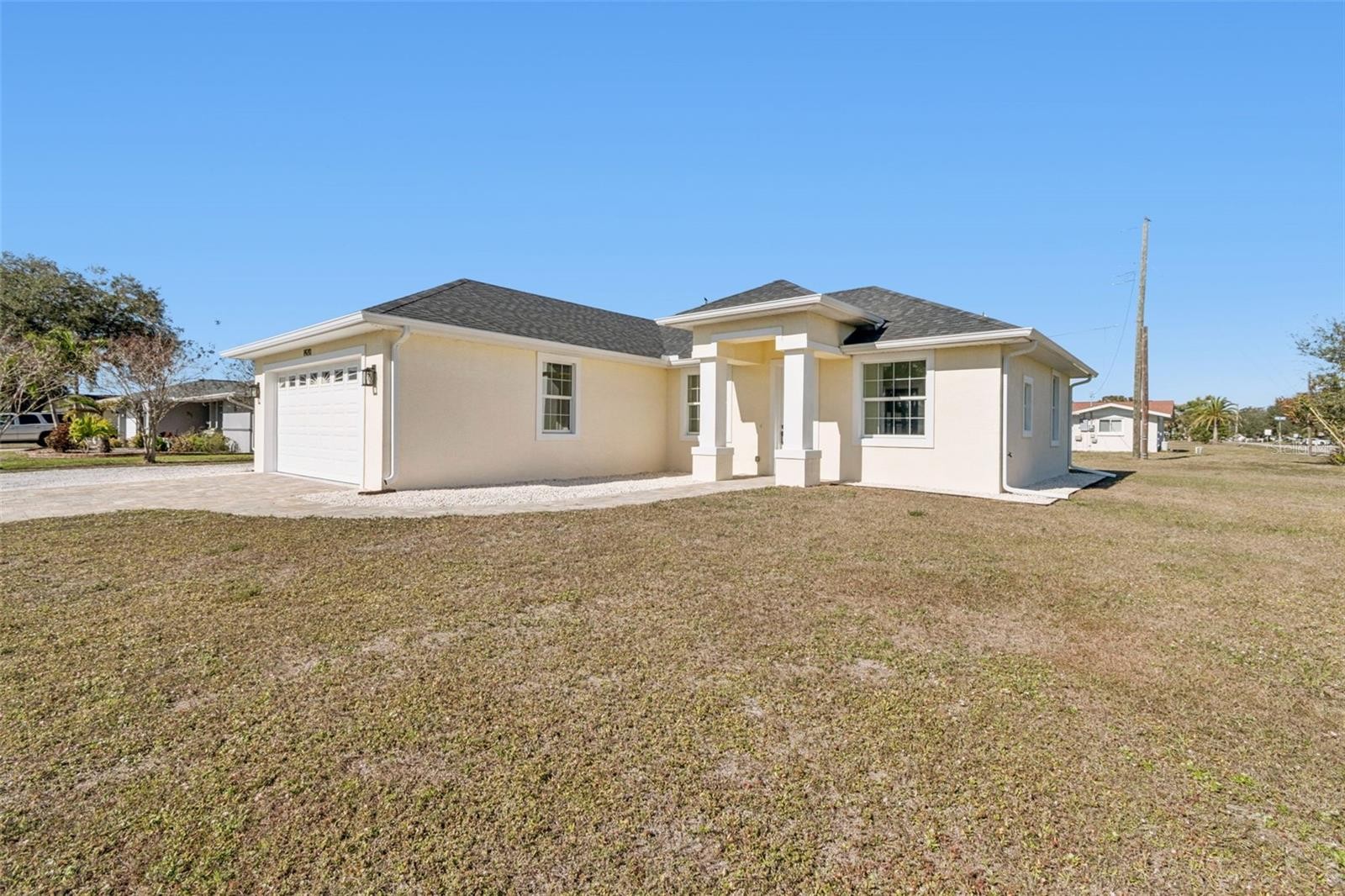 One or more photo(s) has been virtually staged. Looking for a Single Family Home That "Looks Like Brand New Construction" Just 5 Minutes from Venice Island? You Say it Doesn't Exist? Take a Look at this Property . . . Built in 2020 and Barely Lived in, this Delightful 2 Bed, 2 Bath Home Has that NEW HOME FEELING, as the Sellers were Snowbirds Who Rarely Occupied this Bright Contemporary Home. HURRICANE IMPACT WINDOWS, IMPACT FRONT DOOR, IMPACT FRENCH DOOR Leading to the Covered Lanai, and HURRICANE IMPACT GARAGE DOOR for Your Complete Protection from Inclement Weather. Porcelain Plank Tile Flooring Throughout this Sleek, Crisp, Fresh Home, Sets the Stage for Effortless Cleaning and Easy Maintenance! NO HOA FEES and NO CDD FEES. You are Free to Add a Pool, Fencing, Whatever You Desire to Make this Amazing Property Your Own. Along with the Great Location, You are on City Water and Sewer with Street Lights and UNDERGROUND Utilities. A Large Graveled Parking Pad Accommodates Additional Parking, an RV or a Boat. Who Could Ask for Anything More . . . SO CLOSE to VENICE ISLAND at an Affordable Price. Shopping, Dining, Entertainment, Restaurants, Outdoor Cafes, Beaches, Boating, Golf, Tennis, Pickleball and Medical Facilities are ALL within a 10 Minute Drive from Your Front Door. Don't Let this One Get Away. Call for an Appointment Today to Make this FEELS LIKE NEW Home Your Own!
