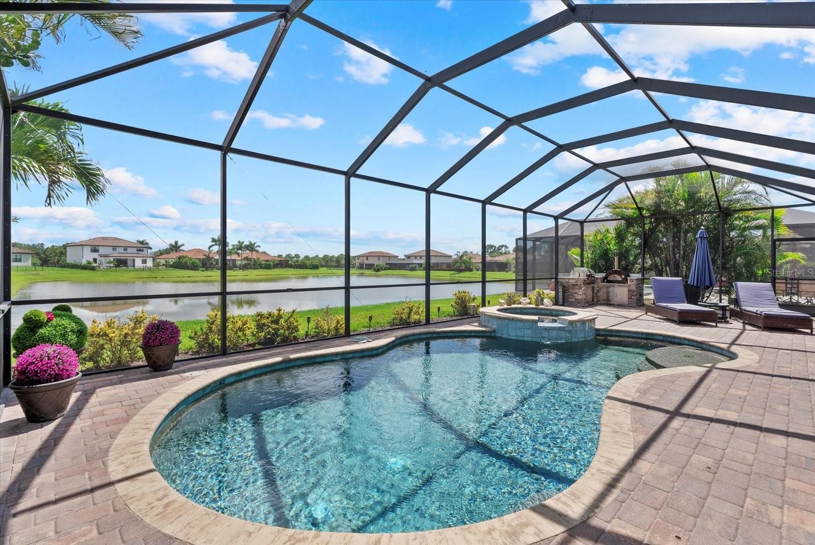 Welcome to the Beautifully Appointed Lennar Princeton II in Savanna at Lakewood Ranch. This highly desirable model offers the perfect blend of comfort, design, and functionality. With 4 bedrooms and 2 baths arranged as a split floor plan, you’ll enjoy privacy and quiet separation between the primary suite and guest rooms, ideal for families or hosting visitors. The modern kitchen features solid wood cabinetry, granite countertops, and a layout that’s perfect for preparing meals or entertaining guests. Elegant design details throughout the home include tray ceilings in the living room, architectural niches, and a formal dining space enhanced by classic columns, creating a comfortable and inviting atmosphere. From the kitchen and breakfast nook, your view opens up to the sparkling pool, large paver patio, and screened lanai, all set against a backdrop of gleaming lake views and breathtaking tropical sunsets. As you arrive, the stacked stone accents on the upgraded front elevation, along with the three-car garage, immediately make a strong impression. The approach to the home is equally appealing, with lush landscaping and a perfectly manicured lawn—all maintained by the community for low-maintenance living. Located in the gated neighborhood of Savanna at Lakewood Ranch, you’ll be just minutes from everything this vibrant master-planned community has to offer—including Waterside, Lakewood Ranch Country Club, top-rated schools, and everyday conveniences. This newer construction home provides added peace of mind, knowing the structural and mechanical components are in excellent condition. Don’t miss this opportunity to own a piece of paradise in one of the most sought-after neighborhoods in Lakewood Ranch. Schedule your private showing today.