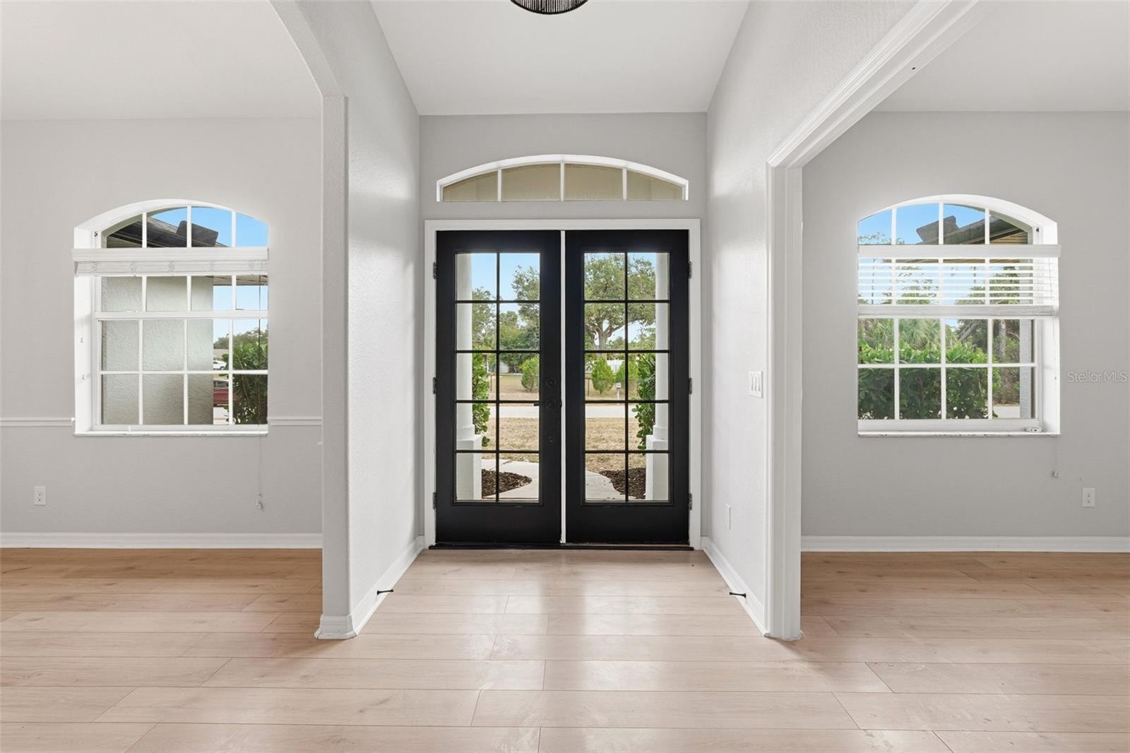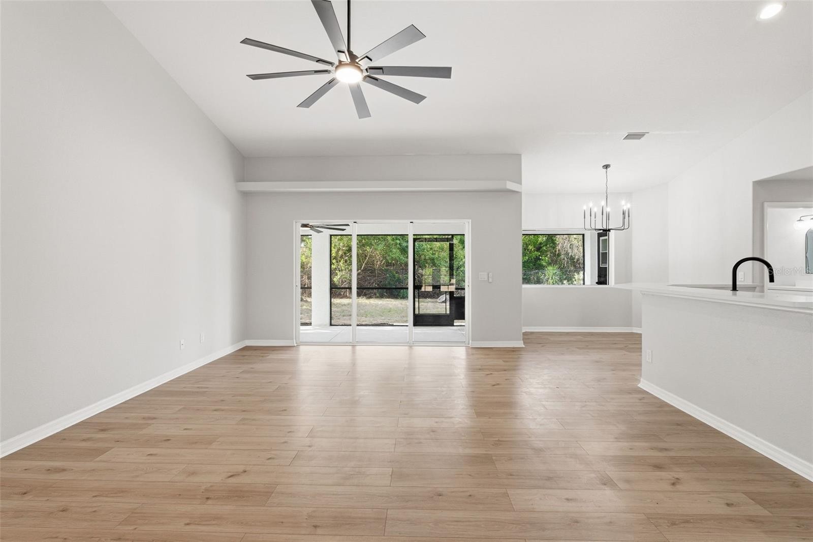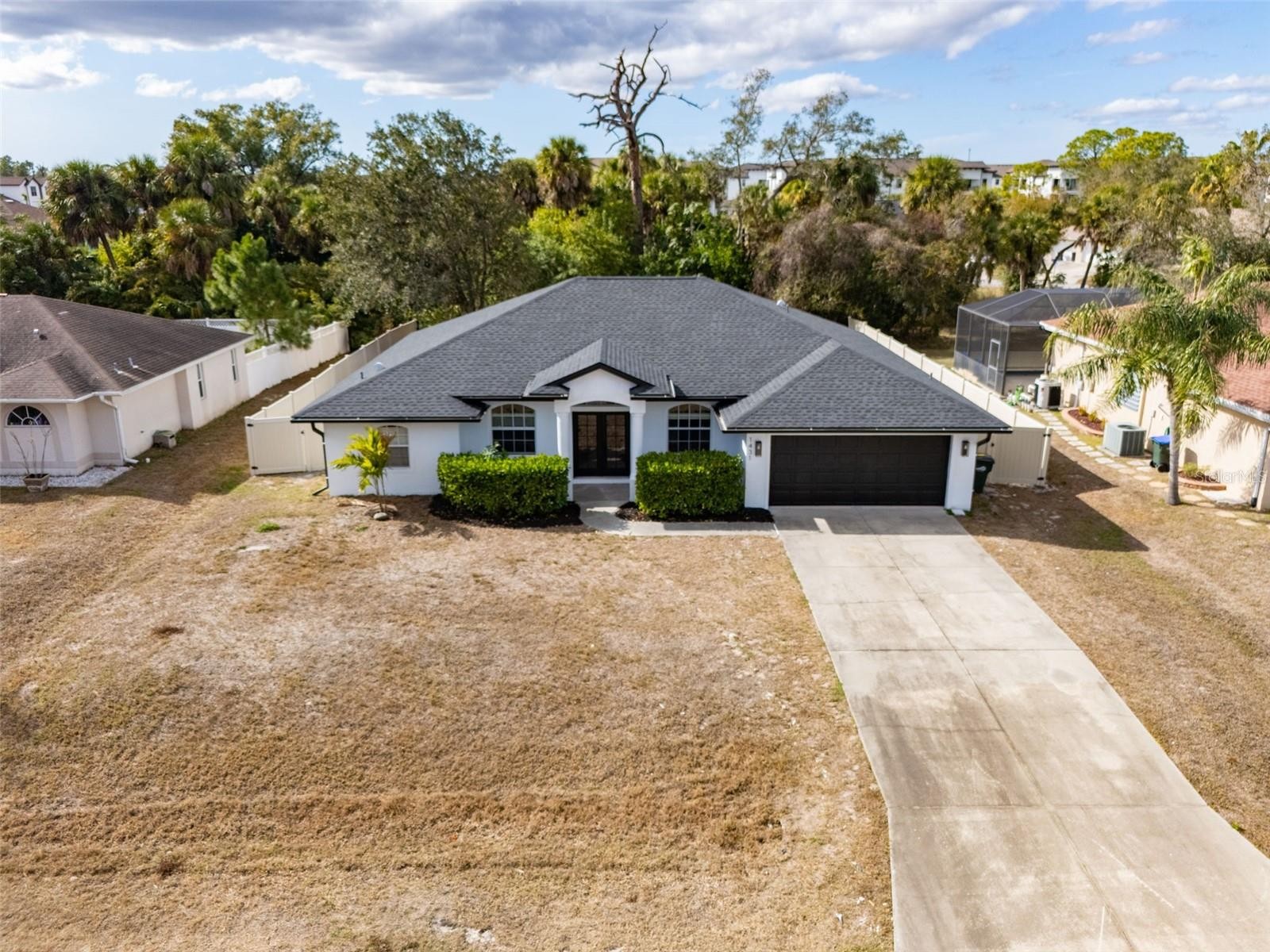 From the moment you arrive, this beautifully remodeled 3/2/2 (plus den) home feels inviting, bright, and thoughtfully designed. A striking double French door entry sets the tone and welcomes you inside with an abundance of natural light. Freshly painted inside and out, the home showcases updated light and plumbing fixtures, brand-new kitchen appliances, laminate wood flooring, and tile in all wet areas. The well-designed layout offers a formal dining room, den, and a spacious living room that opens to the kitchen and breakfast nook, highlighted by an aquarium glass window. High ceilings enhance the open feel, while ceiling fans in every bedroom, the living room, and lanai add comfort throughout. The primary suite is a true retreat, featuring a tray ceiling, walk-in closets, and a beautifully finished bath with subway tile, a glass-enclosed shower, separate soaking tub, and dual sinks. The guest bath is equally well-appointed with modern lighting and a shower/tub combination. A generously sized laundry room adds everyday convenience. Step out to the large lanai and enjoy peaceful wooded views, a fully fenced backyard, and gutters throughout the exterior of the home. Not located in a flood zone, this property also features a 2025 roof, offering peace of mind and potential insurance savings. Perfectly set in the heart of North Port, just minutes to Cocoplum Shoppes, schools, I-75, and the upcoming Sarasota Memorial Hospital.