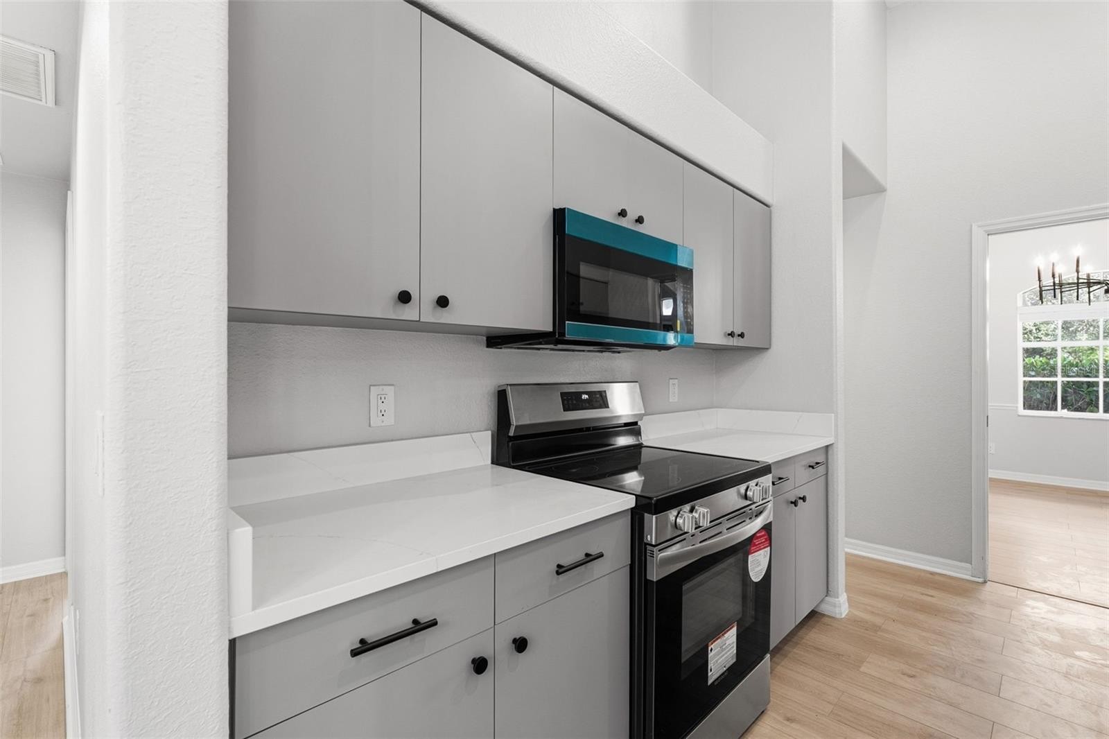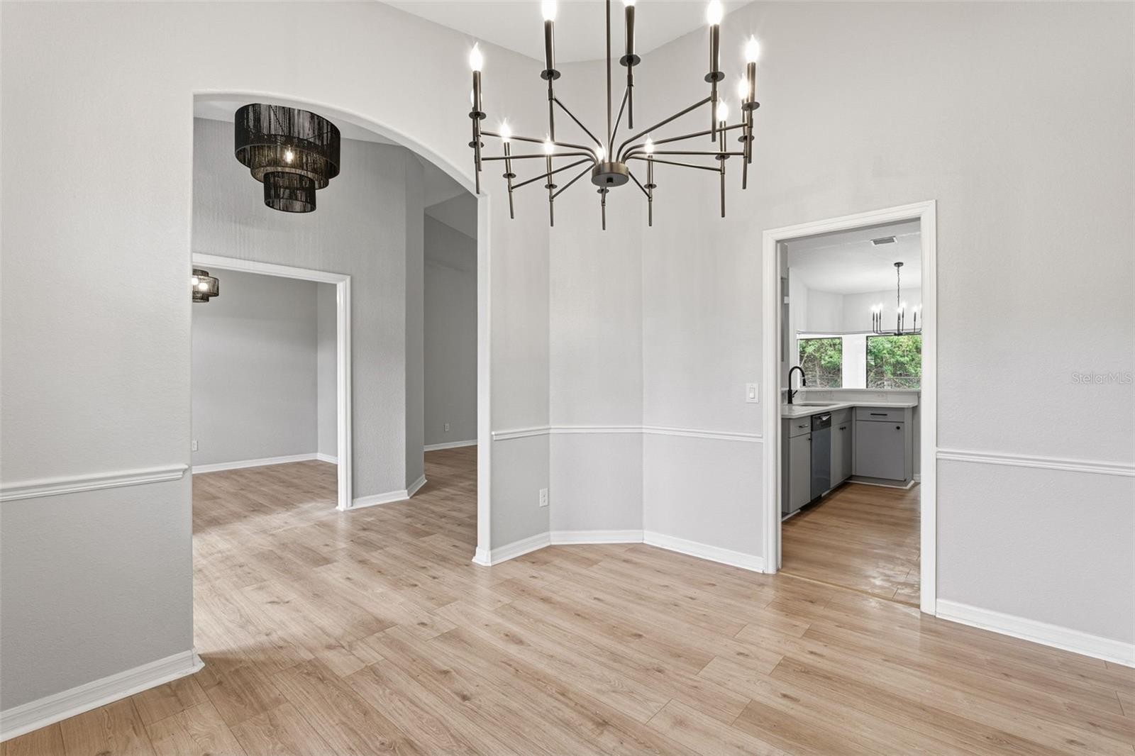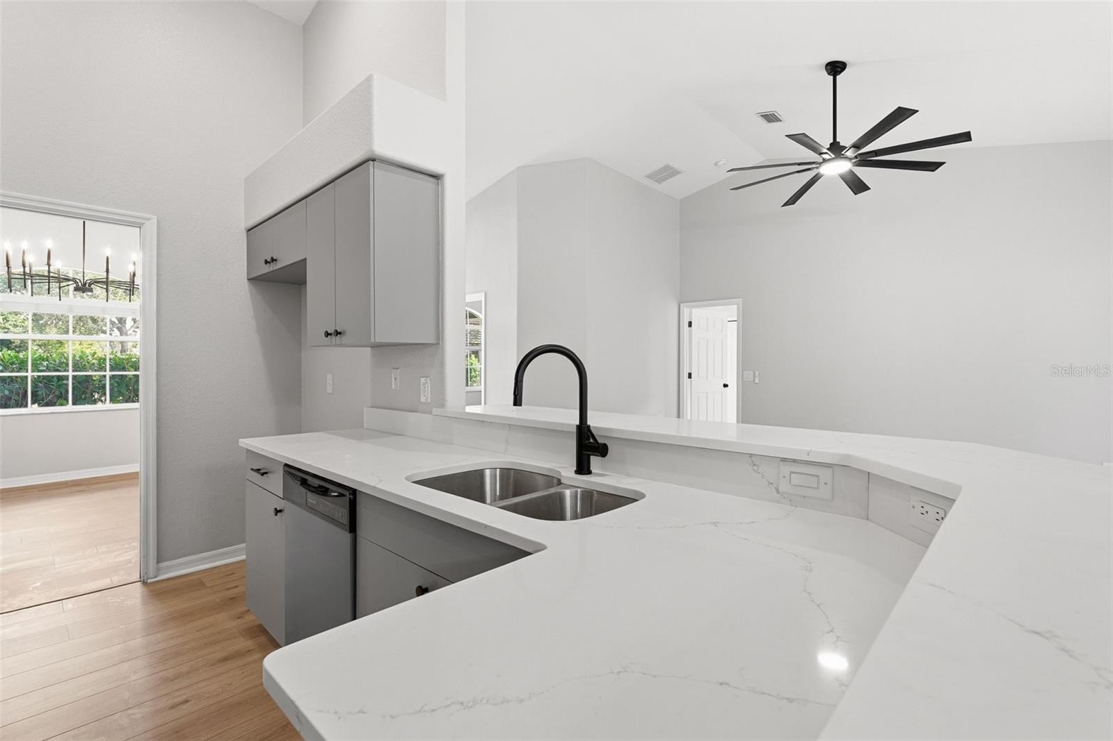 From the moment you arrive, this beautifully remodeled 3/2/2 (plus den) home feels inviting, bright, and thoughtfully designed. A striking double French door entry sets the tone and welcomes you inside with an abundance of natural light. Freshly painted inside and out, the home showcases updated light and plumbing fixtures, brand-new kitchen appliances, laminate wood flooring, and tile in all wet areas. The well-designed layout offers a formal dining room, den, and a spacious living room that opens to the kitchen and breakfast nook, highlighted by an aquarium glass window. High ceilings enhance the open feel, while ceiling fans in every bedroom, the living room, and lanai add comfort throughout. The primary suite is a true retreat, featuring a tray ceiling, walk-in closets, and a beautifully finished bath with subway tile, a glass-enclosed shower, separate soaking tub, and dual sinks. The guest bath is equally well-appointed with modern lighting and a shower/tub combination. A generously sized laundry room adds everyday convenience. Step out to the large lanai and enjoy peaceful wooded views, a fully fenced backyard, and gutters throughout the exterior of the home. Not located in a flood zone, this property also features a 2025 roof, offering peace of mind and potential insurance savings. Perfectly set in the heart of North Port, just minutes to Cocoplum Shoppes, schools, I-75, and the upcoming Sarasota Memorial Hospital.