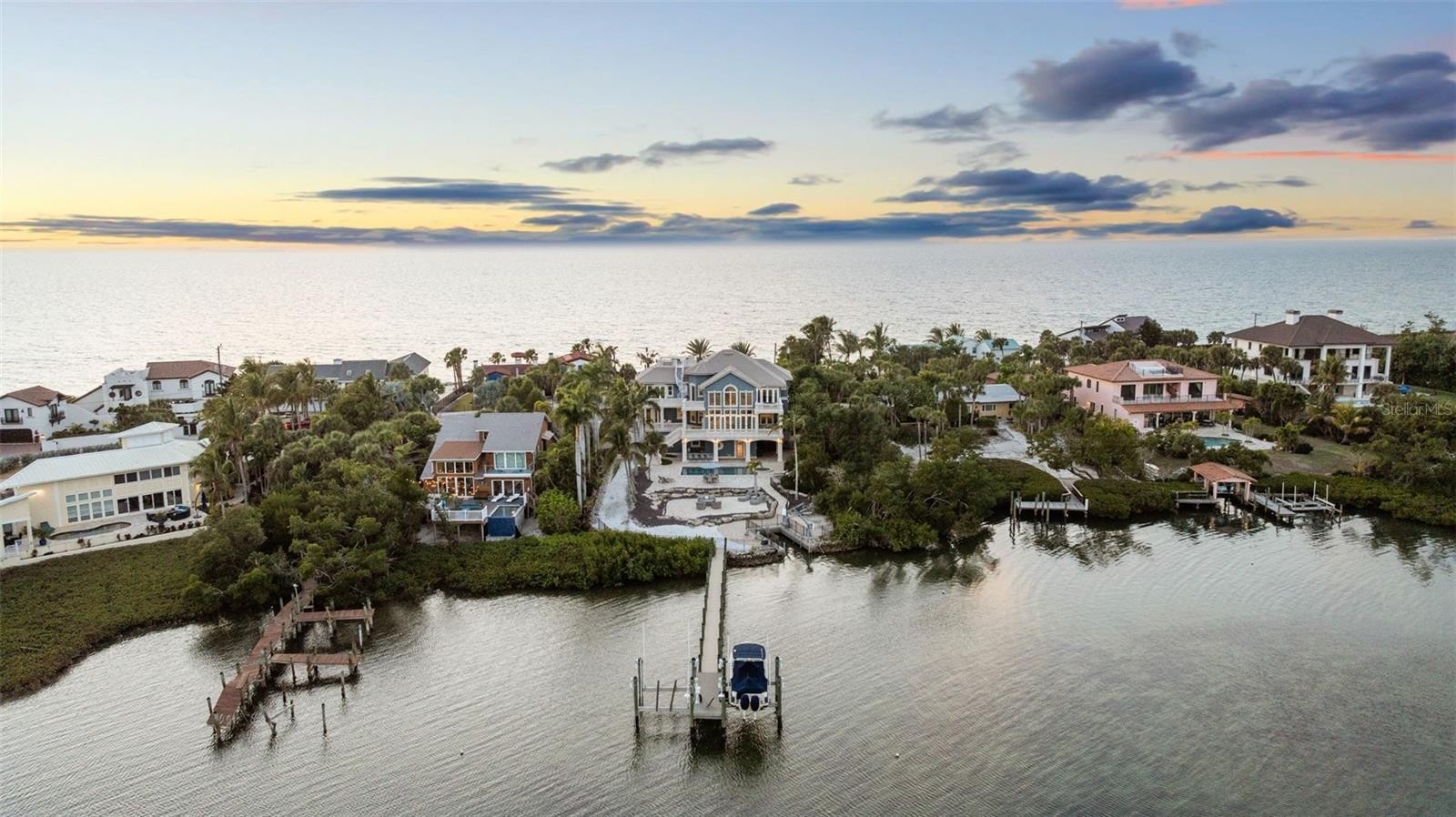 Located on the exclusive stretch of North Casey Key, this private waterfront estate offers a rare blend of resort-style living, protected boating water, and direct Gulf beach access in one of Sarasota County’s most coveted coastal enclaves. Set on over half an acre along Little Sarasota Bay, this durably constructed residence, engineered for strength and storm protection, delivers a private, resort-style waterfront lifestyle defined by mature tropical landscaping, sweeping views of the Intracoastal Waterway and the Gulf of America, and exceptional privacy. With a private beach easement providing direct Gulf access and a 100-foot dock featuring dual 12,000-lb lifts, water, electric, and deep-water Intracoastal access, this property is truly a boater’s dream offering the best of both Gulf and bay living. Inside, dramatic water views greet you through expansive windows, filling the home with natural light and anchoring the open great room with coffered ceilings, custom millwork, and seamless indoor-outdoor living. The 2020-renovated kitchen showcases Cambria quartz countertops, custom cabinetry, premium stainless appliances, and an entertainer’s bar complete with wine refrigerator and ice maker. Designed for both comfort and retreat, the home offers two luxurious primary suites with spa-inspired baths and private terraces, additional guest suites, a dedicated office, elevator, and impact-rated windows and doors throughout. Outdoor spaces evoke a boutique resort experience, featuring a refinished pool, expanded travertine patios, tiered terraces, lush tropical plantings, and a rooftop deck with panoramic Gulf and bay views—perfect for sunset entertaining. Additional highlights include a three-car garage, whole-house generator, and extensive interior and exterior updates. Ideally located just minutes from Downtown Venice and Sarasota, residents enjoy easy access to renowned dining, shopping, cultural events, and convenient regional and international airports. A rare opportunity to own a private waterfront estate on North Casey Key combining private beach access, effortless boating, and refined coastal living.