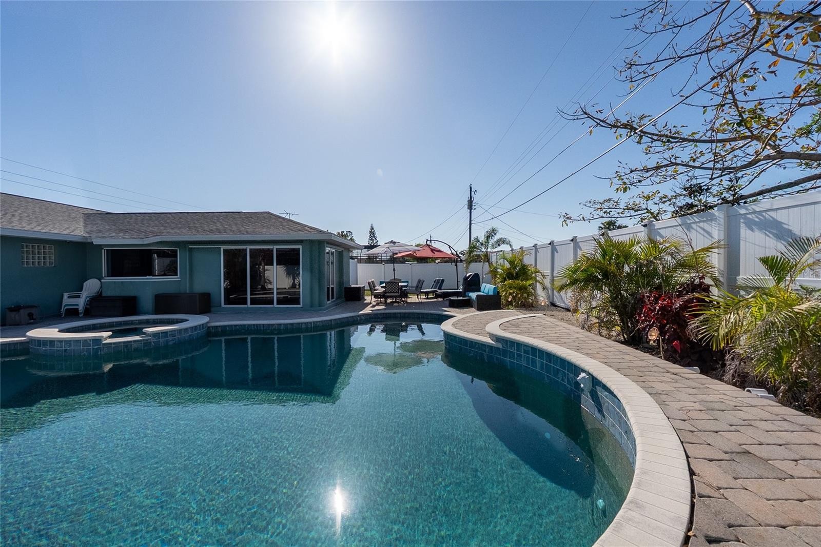 The focal point of this beautiful home is the kitchen/great room/dining area that you step into when you open the double front doors. The chef will love the kitchen with granite counters and wood cabinets with soft close drawers. The kitchen island is home to the cooktop stove and there's a separate counter with a pantry and drink refrigerator. The travertine tile all laid on the diagonal makes the open floor plan pop! The great room features a tray ceiling plus 2 set of IMPACT glass sliders plus in the dining area there is an aquarium glass window overlooking the TO DIE FOR POOL AREA. There's plenty of room for a big family or lots of guests in this 4 bedroom home. The first guest room is on the opposite end of the house from the other bedrooms, so guests can have privacy. You'll also enjoy having an INSIDE LAUNDRY on that side of the house. Just off the kitchen is a den/office that closes off with double doors if you need privacy. All the bedrooms have Bamboo flooring and the primary bedroom has a walk in closet and an IMPACT SLIDER to the pool area. The primary bath has a large walk in shower with ceramic tile and a shower seat. Let's talk about the OUTSIDE OASIS that is an entertainer's DREAM! The large HEATED SALT WATER POOL WITH WATER FEATURES is just the beginning, not to mention the large ATTACHED SPA! The controls for the pool/spa/heater/lighting/water features are all on a remote control system so you can turn you spa on while at dinner and have it warm when you get home. The multi-level patio with all pavers provides several seating areas around the pool including a separate area for a firepit and a cute little sand area with palm tree! The back yard is FULLY FENCED WITH VINYL FENCING making it totally private. But wait there's more...The ROOF IS JUST 2 YEARS OLD and up to the most recent codes. The home is completely wired and ready for a generator and the A/C is just 5 years old. ALL THE SLIDERS ARE IMPACT GLASS and there's shutters for the windows. The home has been re-plumbed and has a hurricane rated garage door for the OVERSIZED GARAGE! This home had no flooding with the recent hurricane's and is in an X500 FLOOD ZONE, meaning no flood insurance is required by your lender. It's not over yet...Overbrook Gardens is a WATERFRONT COMMUNITY with a PRIVATE BOAT RAMP on Forked Creek with NO BRIDGES TO THE INTRACOASTAL WATERWAY. There are no deed restrictions, so you can leave your boat in your EXTRA PARKING and drive less than a mile to the boat launch where there is parking for your trailer. SITUATED JUST 1 MILE TO MANASOTA BEACH, this home is great for so many uses, whether you have a big family, lots of guests, or want to use it as an income producing rental because, it can be sold turnkey furnished. It is also a smart home with door lock, thermostat, and 3 camera's around the outside of the home can all be controlled with an app on your phone. This home truly has it all!