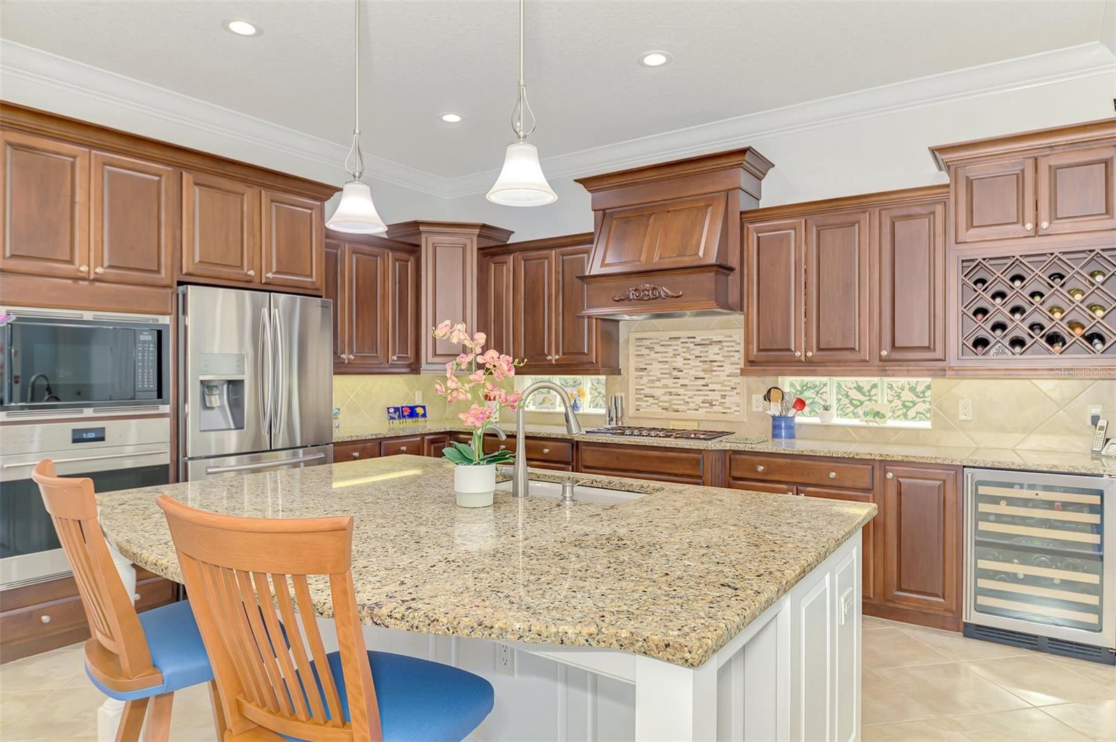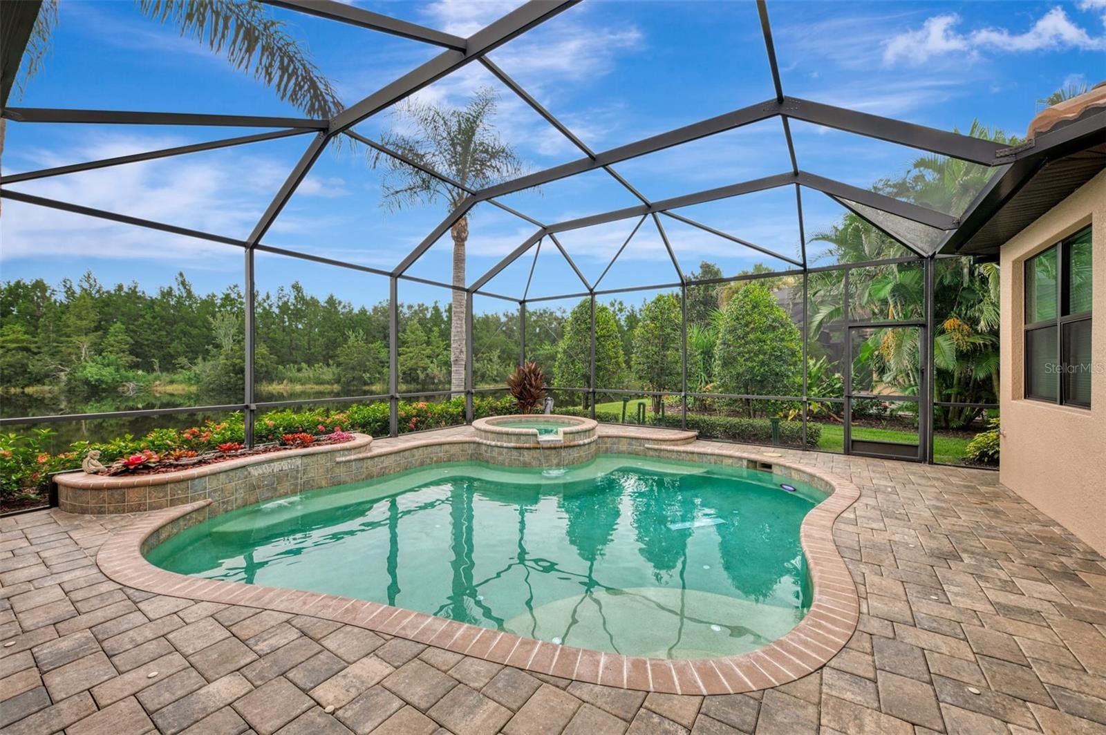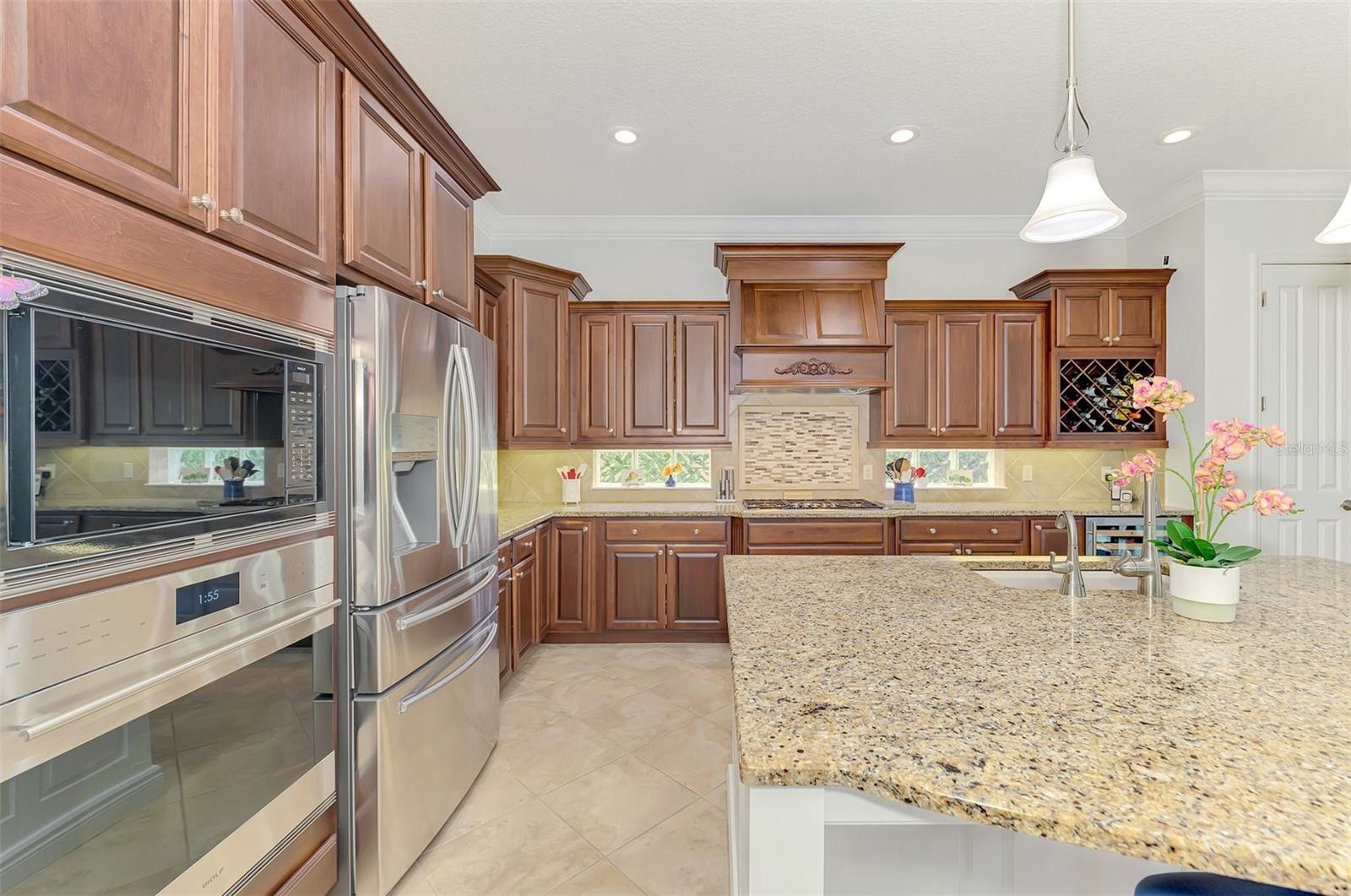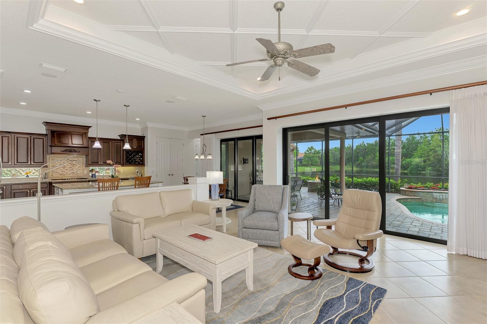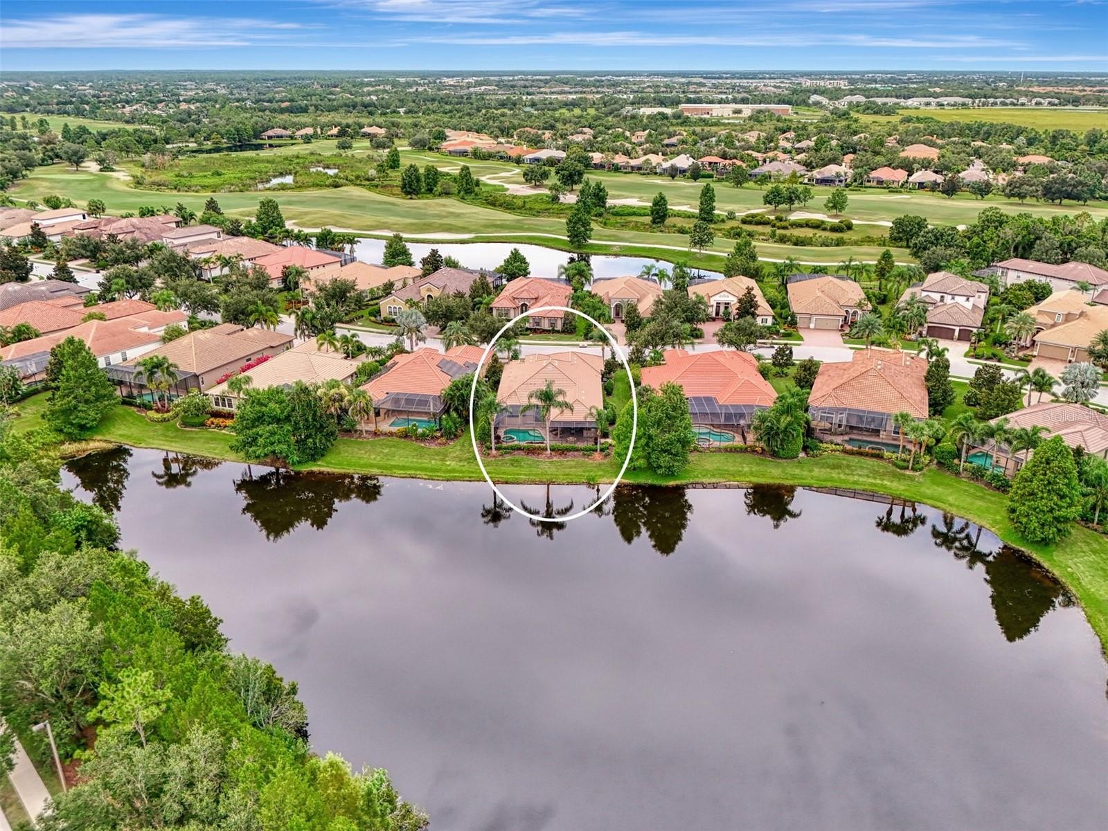 Welcome to luxury living in the exclusive gated community of Country Club East! This impeccably maintained 2,934 sq ft custom Lee Wetherington home is nestled on a serene and private homesite with breathtaking water views, offering 3 bedrooms, an office, a separate workout room/flex space and 2.5 baths. Perfectly blending refined indoor living with a true resort-style outdoor experience, this home is ideal for entertaining or relaxing in total privacy. Designed with quality and comfort in mind, the home features HIGH IMPACT DOORS & WINDOWS, a whole-house generator, tankless hot water heater (2023), and a Trane AC system (2023), whole house water refining system and Reverse Osmosis. DeHart Security Camera System monitors the entire perimeter, complete with a command center and video monitor to be used with Zuum app that is discreetly located in the hall closet. The heart of the home is the gourmet chef’s kitchen, boasting custom cabinetry and top-tier appliances: Wolf oven and microwave, Thermador gas cooktop, Bosch dishwasher, and Uline dual-zone wine chiller. Solid wood shelving in the pantry & wood shelving in all closets elevates organization with a clean, luxurious aesthetic. The spacious primary suite is filled with natural light and offers serene views, custom closet systems & Duette double view blinds with custom coordinating window treatments. The secondary bedrooms features a Jack & Jill bathroom with double sinks. The large den is perfect as a home office or additional flex space for all of today’s lifestyle needs. The grand great room showcases a stunning coffered ceiling with accent lighting. All lighting in the home has been upgraded to LED. Natural light floods in from the double set of triple sliding doors leading to the lanai. Step outside to your own private retreat featuring a sparkling saltwater pool and spa, raised irrigated planters, natural gas fire pit and color changing pool lighting. The lanai is an entertainer’s dream, complete with a fully equipped outdoor kitchen featuring a Lynx grill and Proline hood and convenient dedicated pool bath. The 3rd-car garage space has been thoughtfully converted into a home gym with its own EcoBee/Thermostat Energy Saver system. The bonus space can be converted back into garage space. The garage has a separate ductless mini-split system (2023) to keep you and your garage items cool, NewAge garage cabinet system, ceiling-mounted storage, and a chainless LiftMaster door opener (2022) along with a dedicated breaker and switch for the garage refrigerator. The impressive laundry room has an abundance of additional cabinets, and a huge walk in closet along with an additional storage closet. Luxury finishes extend throughout the home with lit tray ceilings, detailed crown molding, surround sound in the great room, and thoughtfully curated designer touches. This home has been maintained with pristine care and is an opportunity to own a turnkey, high-end home in the heart of Lakewood Ranch. Country Club East offers the perfect blend of luxury and lifestyle, with resort-style community pools including The Retreat—featuring a spa, fitness center, outdoor kitchen, and scenic nature trails all in a beautiful and pristine community. This private, gated community provides an unparalleled experience with nearby top-rated schools, world-class dining, shopping, medical facilities, and easy access to I-75. Close to the #1 beaches in the country, Sarasota, St. Pete and Tampa!