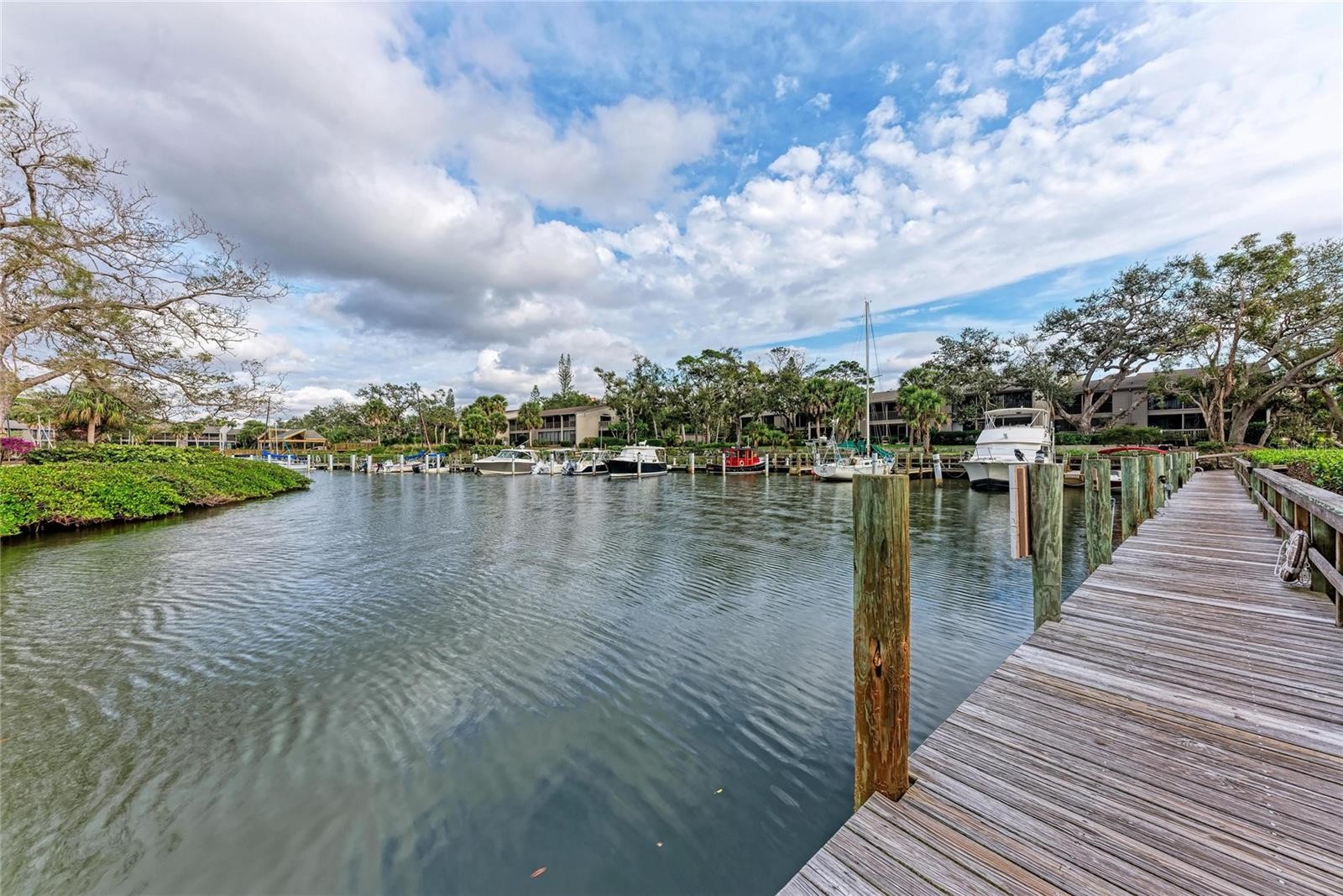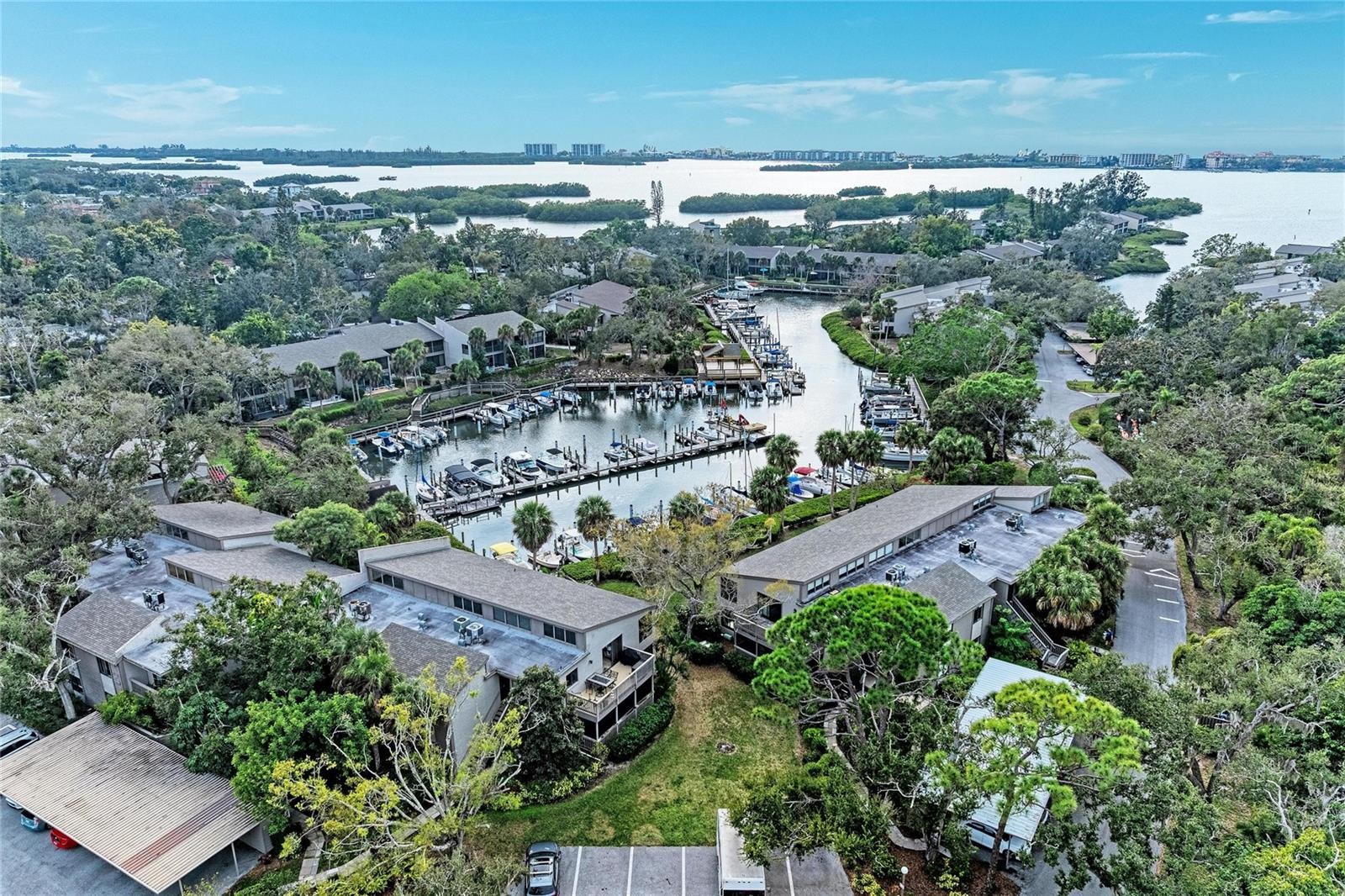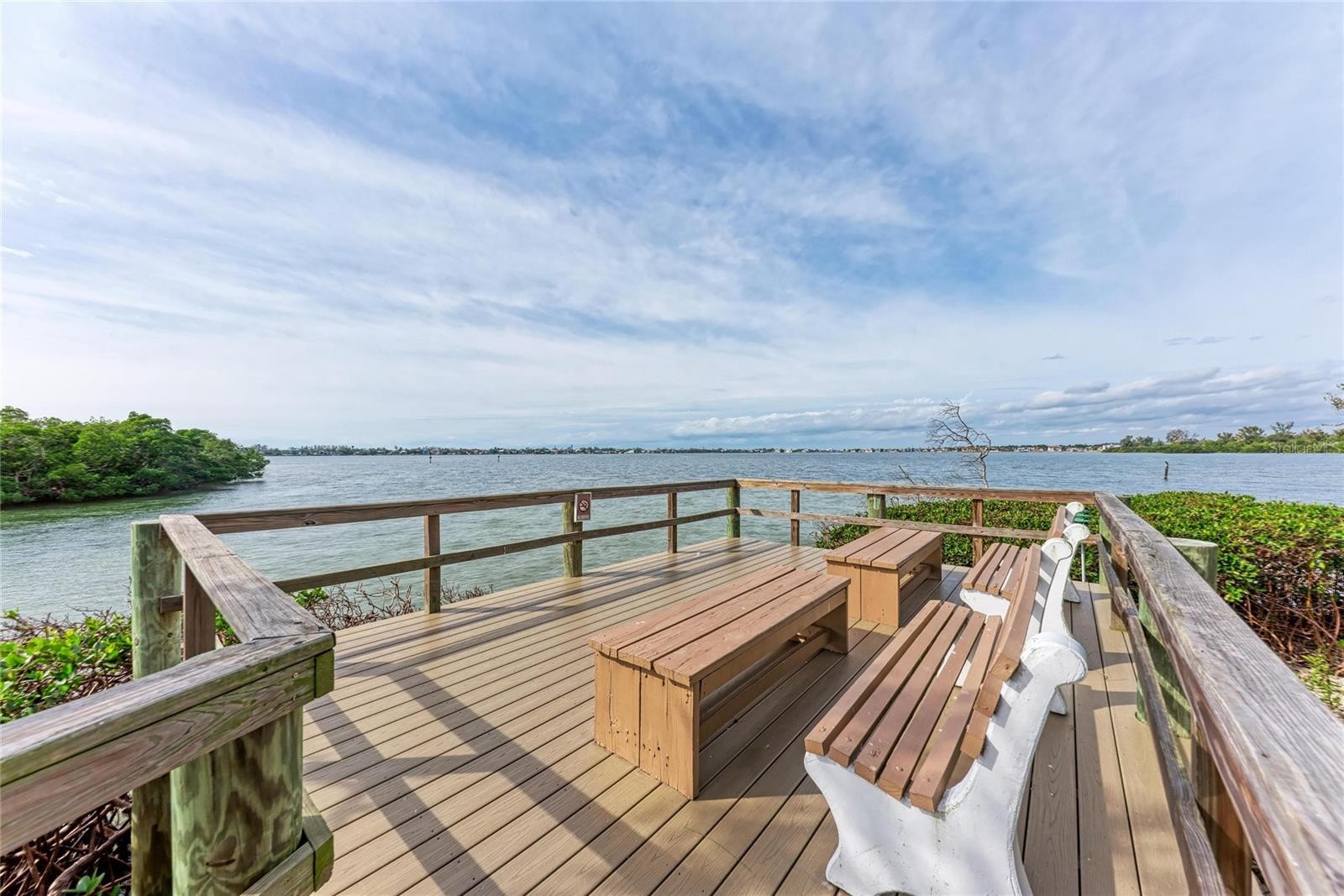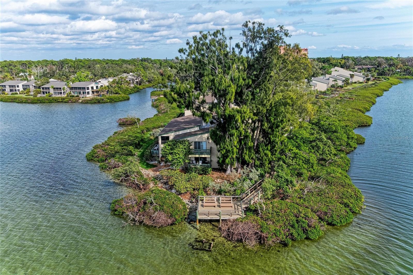 Positioned as the last and most western unit on the point in Pelican Cove, this largely private residence offers breathtaking 270° water views of Little Sarasota Bay, Pelican Cove, and the marina. With no neighboring unit beyond it, this exceptional location provides unmatched privacy, light, and water vistas from nearly every angle. Water views are enjoyed from every room, complemented by three distinct terraces one fully open-air and two screened and glassed creating seamless indoor-outdoor living. The expansive living and dining areas are filled with beautiful natural light and feature open access to a north-facing terrace, where sliding glass doors frame stunning bay views. A subtle step-down into the terrace and slightly lower dining ceilings create an inviting setting ideal for both entertaining and relaxed conversation. The kitchen offers a functional layout with a pass through window for entertaining, fresh paint, and connectivity to the main living spaces. This flexible floor plan includes two possible primary bedroom suites, along with an additional guest bedroom or office. The west wing primary suite showcases sweeping views of Little Sarasota Bay and Siesta Key, a walk-in closet, and access to two terraces one enclosed and one fully open air with sunset views. High moldings, clerestory windows, and privacy doors enhance the space, while the en suite bath features separate his-and-hers sinks and a private toilet and bath area. The east wing bedroom offers exceptional privacy with north-facing marina channel views, sliding glass doors, and a quiet interior location. A separate guest bedroom or office includes a built-in desk console and porch overlooking Pelican Cove waters. A southeast bathroom has received recent plumbing upgrades. Recent improvements include hurricane-rated glass on the main lanai, new clerestory windows replaced by the association, new sliding glass doors (Spring 2025), fresh paint throughout, drywall and trim replacement, new carpeting (2025), a recently replaced A/C system (August 2024), and updated electrical panel access. A small enclosed attic area provides additional storage. Residents enjoy Pelican Cove’s resort-style amenities, including multiple swimming pools, clubhouses, a fitness center, art studio, and marina access. The HOA covers water, grounds maintenance, exterior building maintenance, pest control, and community insurance for the exterior of the building (lanai window coverage obtained separately). This rare offering combines a premier end-of-point location with privacy, panoramic water views, and the best of coastal Sarasota living.
