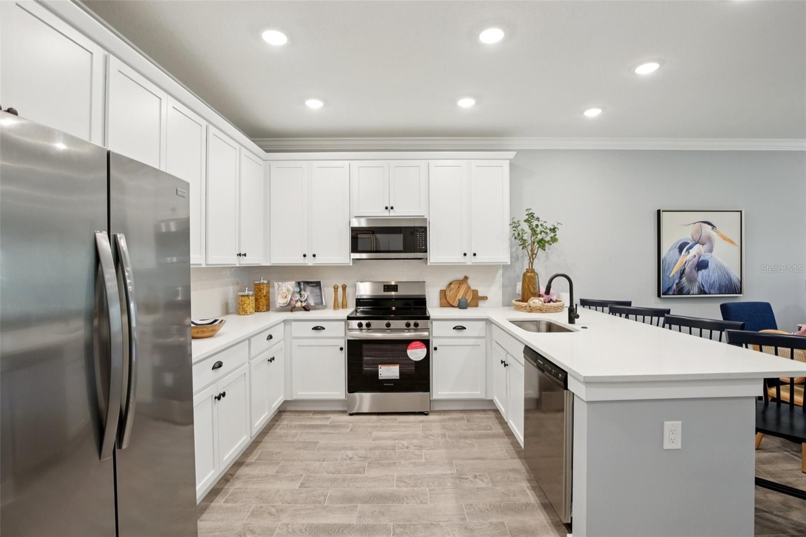 Beautifully designed townhome featuring 42” grey cabinets with crown molding, modern black hardware, quartz countertops, subway tile backsplash, stainless steel appliances, and a farmhouse-style single basin sink. Designer lighting enhances the open-concept living space. Beige ceramic tile runs throughout the main living areas, paired with a hardwood staircase and open railing for a modern, upscale feel. Both bathrooms showcase floor-to-ceiling tiled showers and dual vanities. Impact glass windows and doors provide added efficiency and peace of mind. Enjoy indoor-outdoor living with a private balcony off the owner’s suite—perfect for taking in the serene water views.