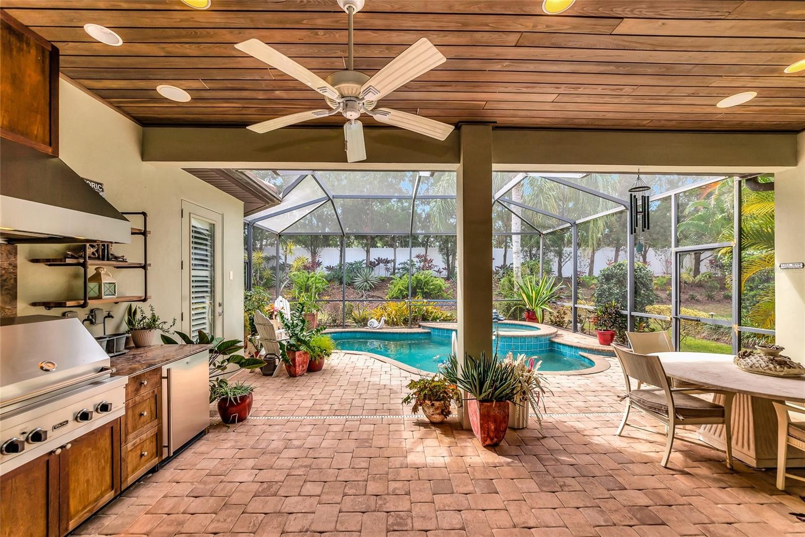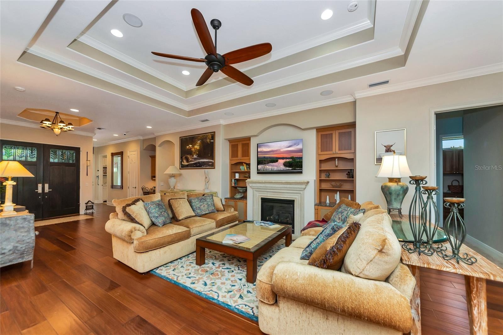 Experience refined living in the highly sought-after Country Club East Golf Course Community. This St. Charles model showcases exceptional craftsmanship, thoughtful design, and premium upgrades throughout. This exceptional home features three bedrooms plus a dedicated office, combining elegance, comfort, and functionality.From the moment you arrive, the charming front porch, and grand double-door entry set the tone for what awaits inside. With 10 Ceilings, step into the main living areas enjoying beautiful hand-scraped hardwood flooring accented with decorative tile inlays. The spacious open-concept Great Room is designed for both comfort and elegance, featuring a built- in office nook, double tray ceiling with crown molding, Gas Fireplace & Custom Built-Ins. The Gourmet Kitchen is a chef’s dream, equipped with high-end Viking Stainless Steel Appliances, Pot Filler Faucet, Solid Wood Cabinetry, Granite Countertops, Custom Glass Tile Backsplash, and an Expansive Island with seating. Adjacent to the kitchen, the Breakfast/Dining Nook offers additional space for a dining set. Blending indoor & outdoor living with 3 pocketed sliding glass doors which open to a professionally landscaped backyard, Private Pool, & a tropical oasis. This outdoor retreat features Brick Pavers, Ceiling Speakers, and a fully equipped Outdoor Kitchen complete with a SS Viking Grill & Exhaust Fan & Lights, Mini Refrigerator, Bar Sink, & Counter with storage. Relax in the kidney shaped Pebble-Tec Pool with Custom Inlays & Spa. The primary suite is highlighted with tray ceiling & crown molding, Plantation Shutters for filtering the sunshine, and a private escape into the lanai. The en-suite bathroom includes a Soaking Garden Tub, Dual Vanities with Solid Wood Cabinetry, and a tiled walk-in shower. Dual walk-in closets with built in cabinetry and Granite Tops accentuate the elegance of the home. This exceptional home features two additional Bedrooms sharing a Jack & Jill Bathroom plus a Bedroom/Office alongside a half bathroom. Come join us and live the Florida Lifestyle i