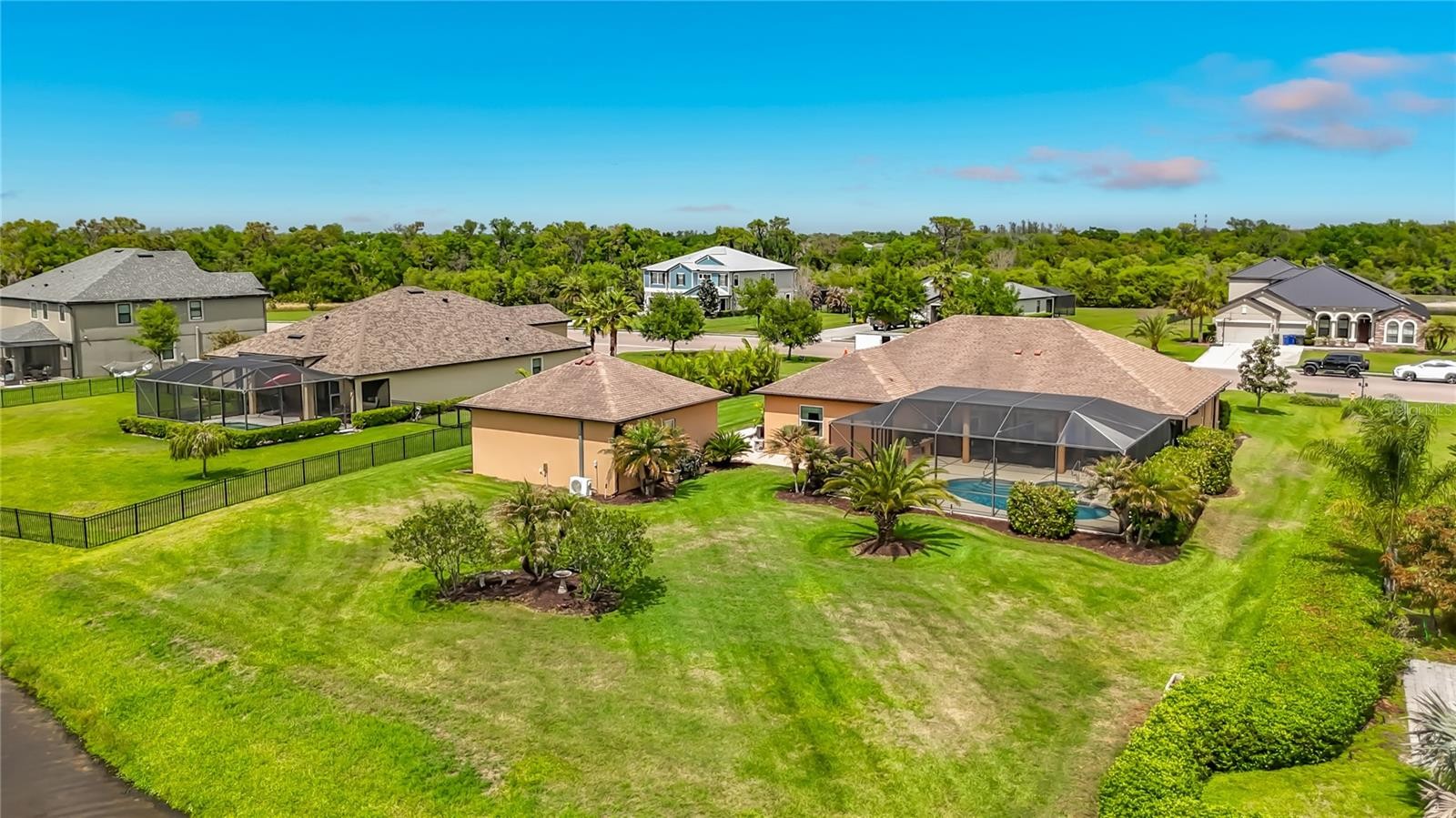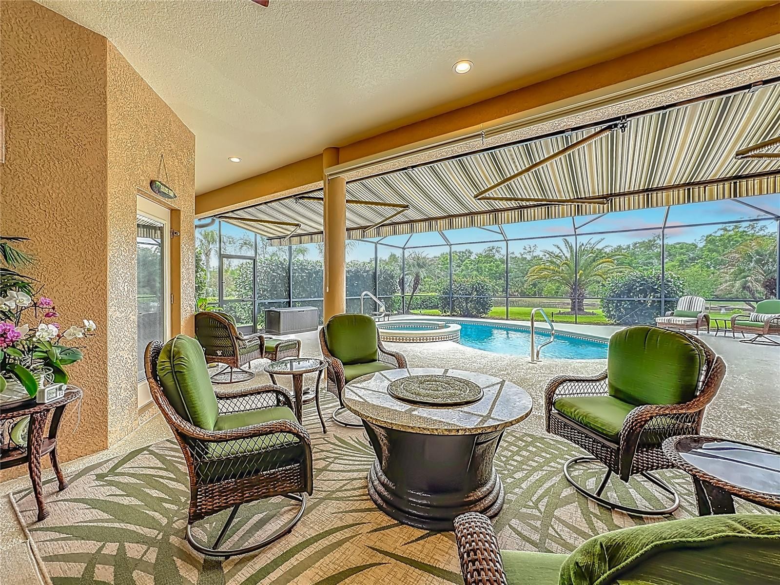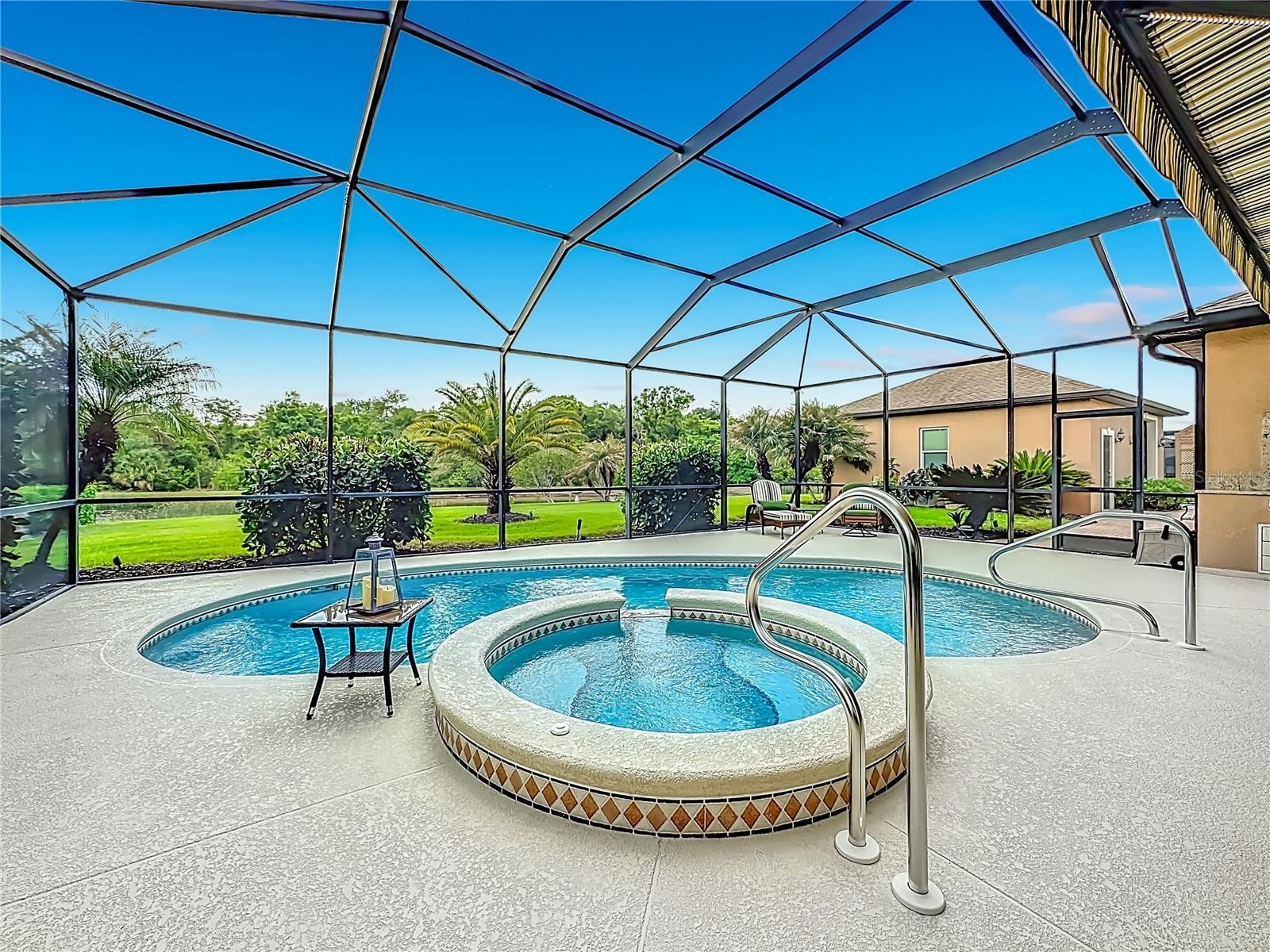 Welcome to this beautiful, over-the-top custom home situated on just over a half-acre of meticulously maintained property. This exceptional 3-bedroom, 3-bath residence offers luxury, privacy, and thoughtful design at every turn. Step through the custom double front doors into an expansive great room featuring elegant tray ceilings and an open-concept layout that seamlessly connects the living area, gourmet kitchen, breakfast nook, and formal dining room—perfect for both everyday living and entertaining. Designed with both style and peace of mind, all windows and doors are hurricane-rated. The gourmet kitchen serves as the heart of the home, showcasing premium appliances, custom cabinetry, and abundant granite counter space. A second refrigerator in the laundry room adds extra convenience, along with upgraded shelving throughout the laundry, pantry, and office spaces. The home also features a whole-house water filtration system with reverse osmosis in the kitchen. The luxurious primary suite offers a spa-like retreat with a large soaking tub, walk-in shower, and heated towel bars, while all bathrooms include walk-in showers and upscale finishes. Each bedroom is enhanced with custom closets by design, and upgraded soundproofing in the walls ensures added privacy. Beautiful upgraded tile flooring flows throughout the home. Enjoy true indoor-outdoor living with triple sliding glass doors that open the great room to the lanai, creating an expansive entertaining space. The outdoor area is equally impressive, featuring a fully equipped outdoor kitchen with custom cover, a propane firepit with stone and granite accents, and a heated pool and spa enclosed with a no-see-um screen. The backyard is enhanced with professional landscape lighting for a stunning evening ambiance. Car enthusiasts and hobbyists will appreciate the air-conditioned and heated 3+ car garage with attic storage, as well as a separate, climate-controlled 676 sq. ft. workshop/RV garage—perfect for additional vehicles, storage, or projects. With two attic storage spaces and countless high-end upgrades throughout, this is truly a one-of-a-kind custom property offering luxury living at its finest.