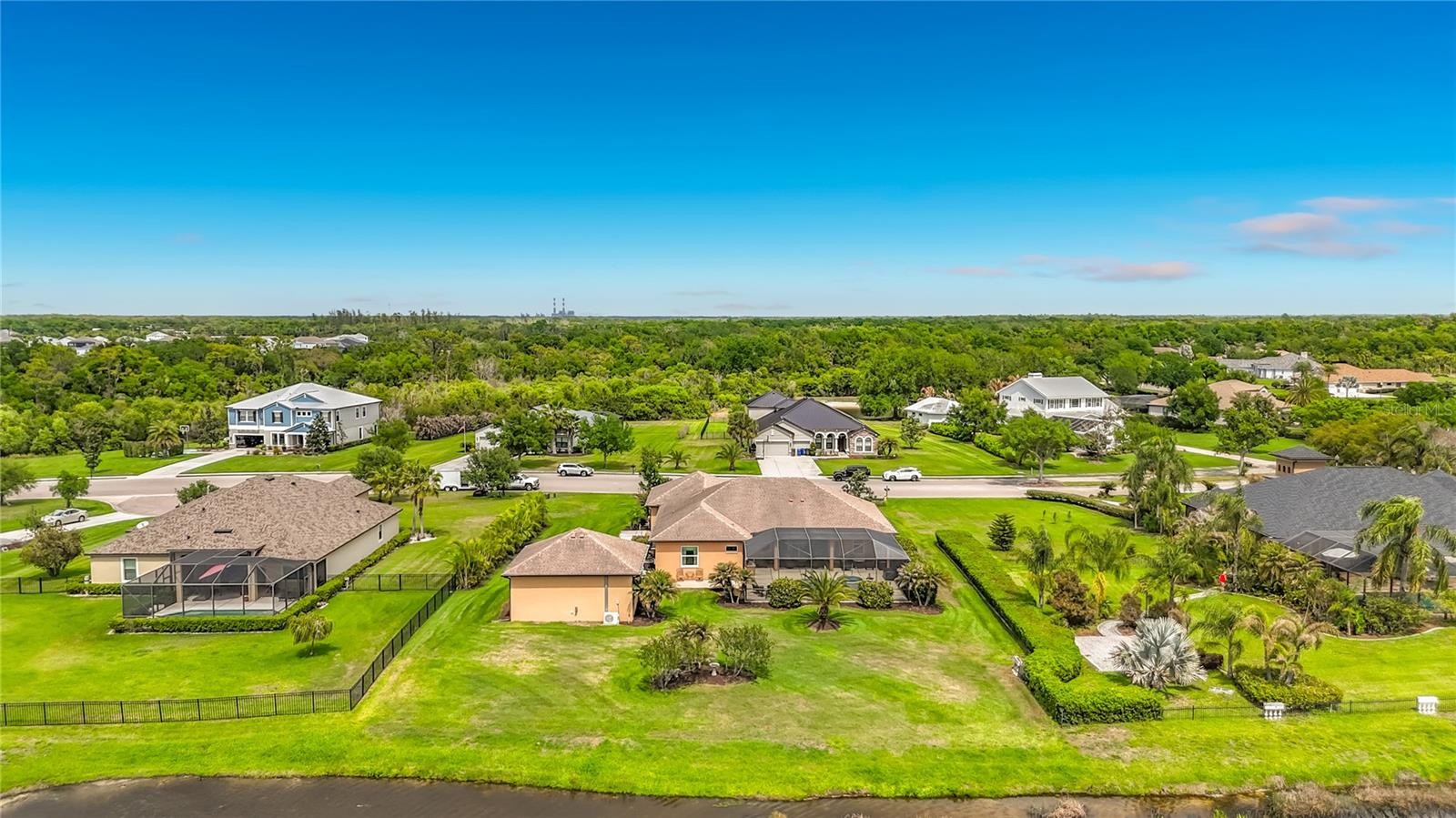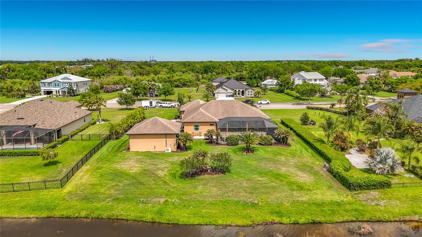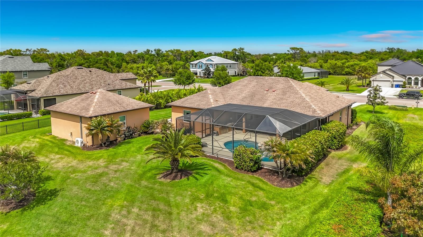 Welcome to this beautiful, over-the-top custom home situated on just over a half-acre of meticulously maintained property. This exceptional 3-bedroom, 3-bath residence offers luxury, privacy, and thoughtful design at every turn. Step through the custom double front doors into an expansive great room featuring elegant tray ceilings and an open-concept layout that seamlessly connects the living area, gourmet kitchen, breakfast nook, and formal dining room—perfect for both everyday living and entertaining. Designed with both style and peace of mind, all windows and doors are hurricane-rated. The gourmet kitchen serves as the heart of the home, showcasing premium appliances, custom cabinetry, and abundant granite counter space. A second refrigerator in the laundry room adds extra convenience, along with upgraded shelving throughout the laundry, pantry, and office spaces. The home also features a whole-house water filtration system with reverse osmosis in the kitchen. The luxurious primary suite offers a spa-like retreat with a large soaking tub, walk-in shower, and heated towel bars, while all bathrooms include walk-in showers and upscale finishes. Each bedroom is enhanced with custom closets by design, and upgraded soundproofing in the walls ensures added privacy. Beautiful upgraded tile flooring flows throughout the home. Enjoy true indoor-outdoor living with triple sliding glass doors that open the great room to the lanai, creating an expansive entertaining space. The outdoor area is equally impressive, featuring a fully equipped outdoor kitchen with custom cover, a propane firepit with stone and granite accents, and a heated pool and spa enclosed with a no-see-um screen. The backyard is enhanced with professional landscape lighting for a stunning evening ambiance. Car enthusiasts and hobbyists will appreciate the air-conditioned and heated 3+ car garage with attic storage, as well as a separate, climate-controlled 676 sq. ft. workshop/RV garage—perfect for additional vehicles, storage, or projects. With two attic storage spaces and countless high-end upgrades throughout, this is truly a one-of-a-kind custom property offering luxury living at its finest.