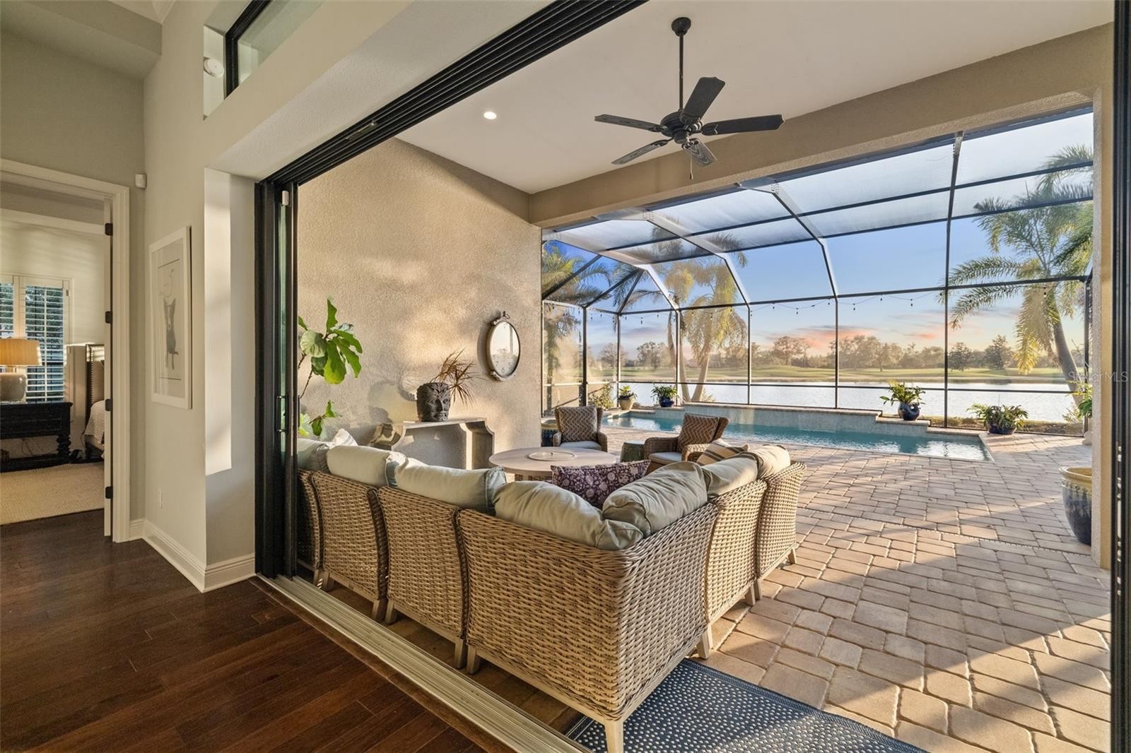 Located within the prestigious gated community of Country Club East, this custom Neal Signature home defines luxury, offering stunning panoramic vistas of expansive lakes and the 7th hole of the Royal Lakes golf course. Highlighting its prime location and breathtaking views, privacy is ensured with no neighboring homes visible from the expansive lanai. Meticulously crafted with contemporary flair and meticulous attention to detail, this residence is designed for sophisticated living. Enter through grand double doors with iron inlay into a spacious great room adorned with soaring ceilings and intricate tray ceilings featuring exposed beams. The gourmet kitchen features a large central island with Kohler farmer's sink complemented by 42" high wood cabinetry, lower drawers, and pull-out cabinets. Under-cabinet accent lighting and tiled backsplash walls enhance the aesthetic, while built-in ovens, a natural gas cooktop, walk-in pantry, and a convenient wet bar make entertaining effortless. The dining room, adjacent to the kitchen, features an aquarium window overlooking the pool area, perfect for elegant dining experiences. Disappearing sliding glass doors seamlessly connect indoor and outdoor living spaces. Outside, a covered entertainment area includes an OUTDOOR KITCHEN with a sink, grille, and beverage refrigerator. Relax in the SALTWATER HEATED POOL with sitting bench, all while enjoying serene views of the lake and golf course. Retreat to the luxurious primary suite offering a sitting area, dual walk-in closets with custom built-ins, and a spa-like bathroom with a walk-in shower and dual vanity sinks. Two additional ensuite guest bedrooms featuring full private bathrooms and closets with built-in organizers, ensuring comfort and privacy for family and guests. French doors lead to a generously sized den, ideal for a home office, library or bonus room. Enjoy peace of mind with IMPACT WINDOWS AND DOORS plus a WHOLE HOUSE GENERATOR. Additional features not to be missed include motorized sunscreen, a 3-car side load garage with epoxy flooring, engineered hardwood flooring, in all living areas and porcelain tile floors in bathrooms and laundry room, tray ceilings, crown moldings, neutral decor, tile roof, extensive lush tropical landscaping on all sides, outdoor accent landscaping lights, and this home is in the maintenance-free section of Country Club East. Discover unparalleled luxury and modern living in this meticulously crafted home, perfectly situated for discerning buyers seeking elegance and comfort in a premier golf community setting. Residents of Country Club East enjoy a resort lifestyle with access to The Retreat an amenity center offering a resort-style pool, fitness facility, social spaces, an outdoor kitchen, nature trails for biking and walking—all included with HOA fees. Optional memberships available at the LWR Golf and Country Club: golf, fitness and social. Conveniently located near shopping, like Waterside Place, UTC Mall and many superb restaurants, A-rated schools, cultural venues and renowned beaches.