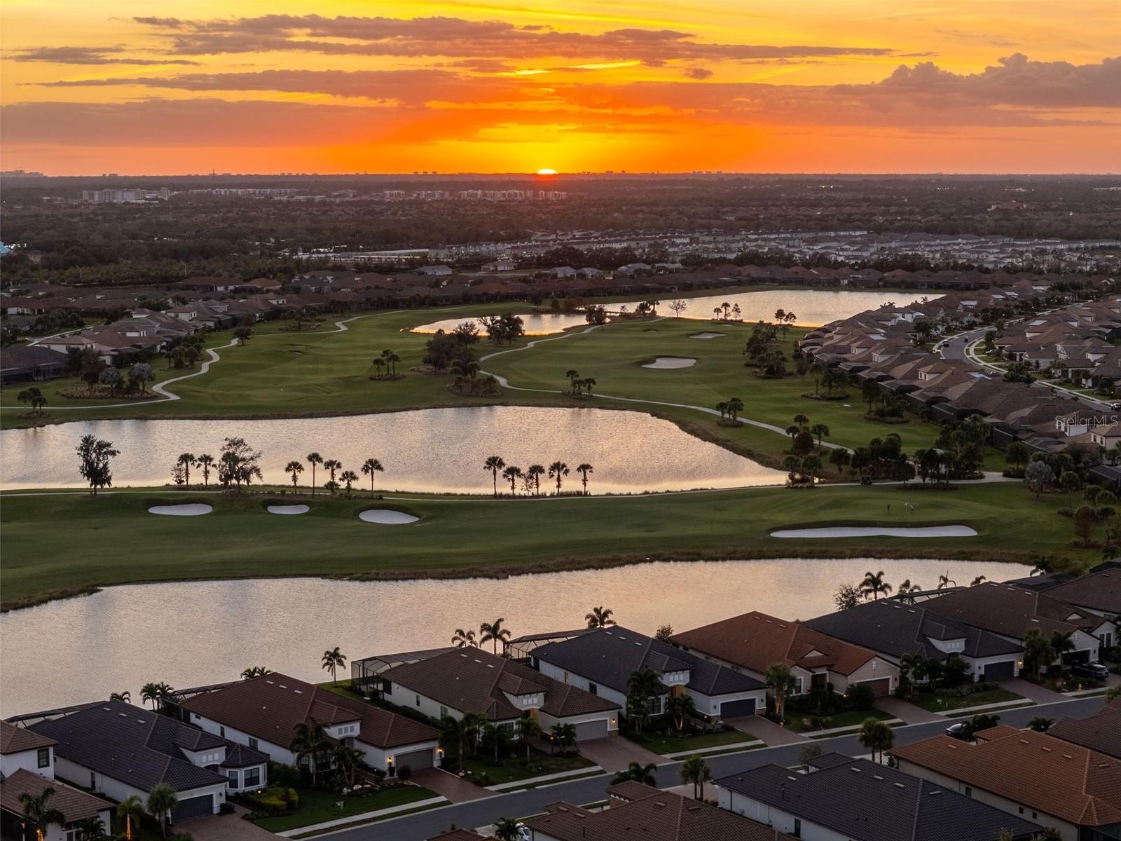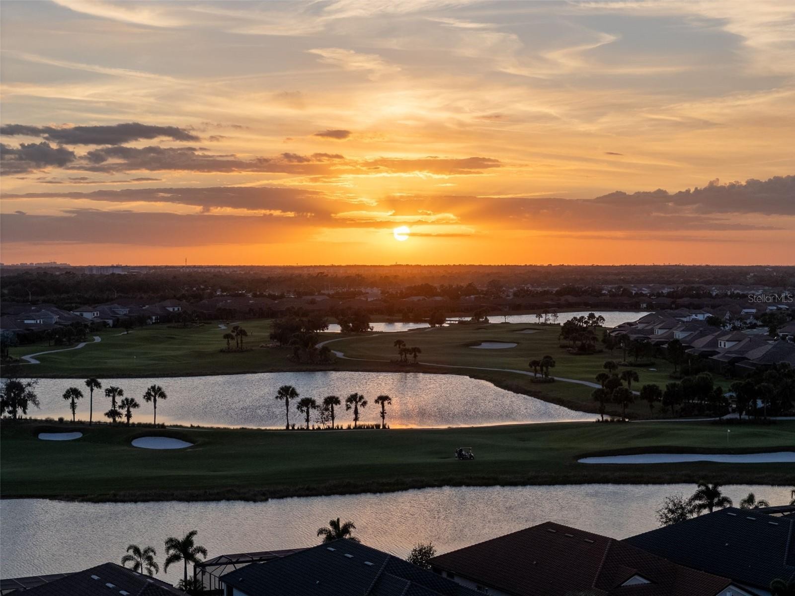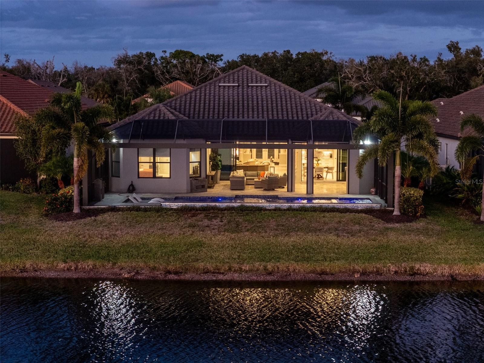 Welcome to you.r Fully Furnished Sunset Home!! Discover the perfect blend of luxury, comfort, and breathtaking views in this move-in-ready Pallazio floor plan, beautifully situated on a prime lake and golf homesite in Esplanade at Azario. From the moment you arrive, the upgraded landscaping and outdoor lighting set an inviting tone. Step through the elegant double glass doors and into a spacious three-bedroom, three-bath residence with a den, thoughtfully designed with high-end custom finishes throughout. All major furniture conveys; accessories, décor, artwork, small kitchen appliances, dishes etc. and personal items will be at the seller’s discretion. All bikes, wine and liquor does NOT convey. The enclosed office with glass doors provides a quiet workspace, while both guest suites offer ideal privacy. A custom wine wall and bar create a warm, stylish focal point in the dining area—perfect for entertaining. The gourmet kitchen features stainless steel Monogram appliances, abundant storage, and a layout designed for effortless hosting. Indoor living flows seamlessly to the stunning outdoor retreat, complete with an expansive pool and spa, travertine decking, outdoor kitchen, and fireplace. The panoramic screen showcases serene lake and golf views and unforgettable sunsets. This true smart home allows you to control lighting, security, Sonos audio, thermostat, pool, spa, and more directly from your phone. Upgrades include impact windows, lanai sunshades, a tankless Rinnai water heater, designer tile flooring, upgraded baths, custom closets and pantries, security cameras, and a spacious three-car tandem garage. Located in the resort-style community of Esplanade at Azario, residents enjoy a championship golf course, resort pool, poolside bar, spa, fitness center, tennis, and pickleball. ($1000 annual food & beverage minimum and $5,000 capital contribution due at closing. Golf membership included.)