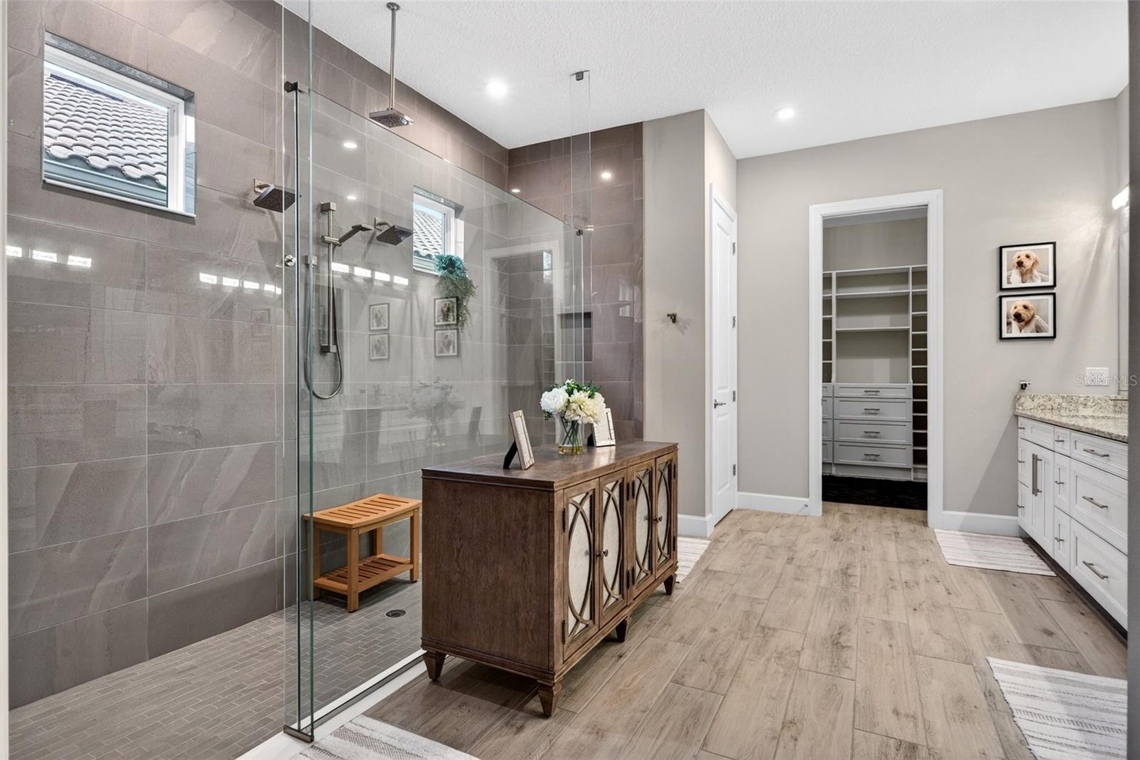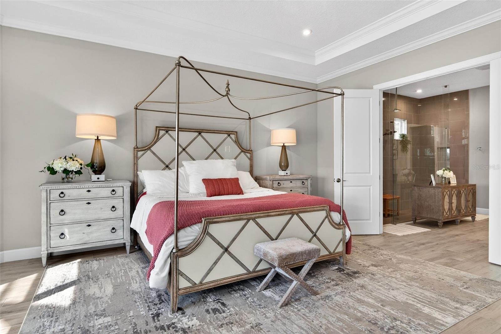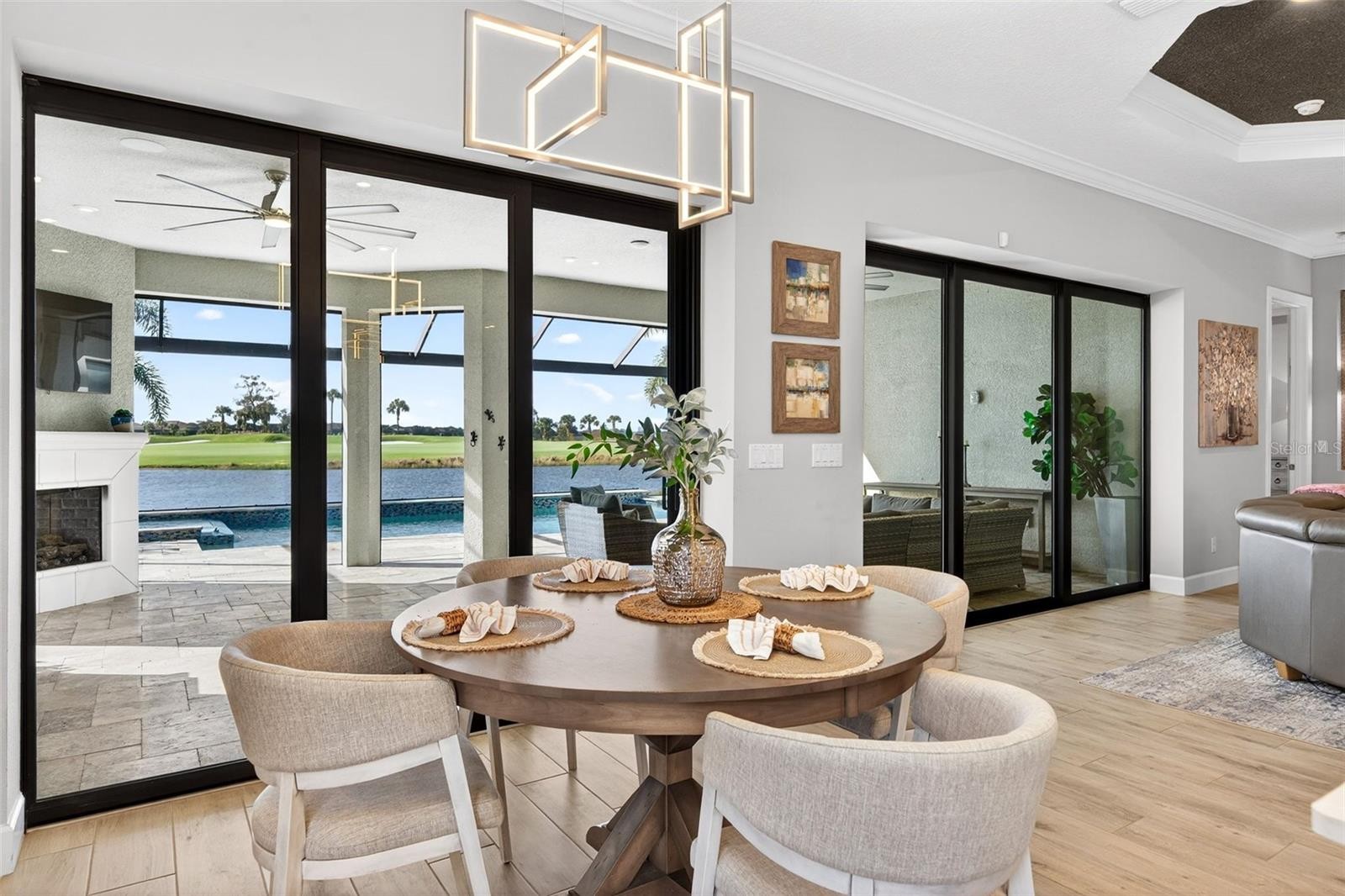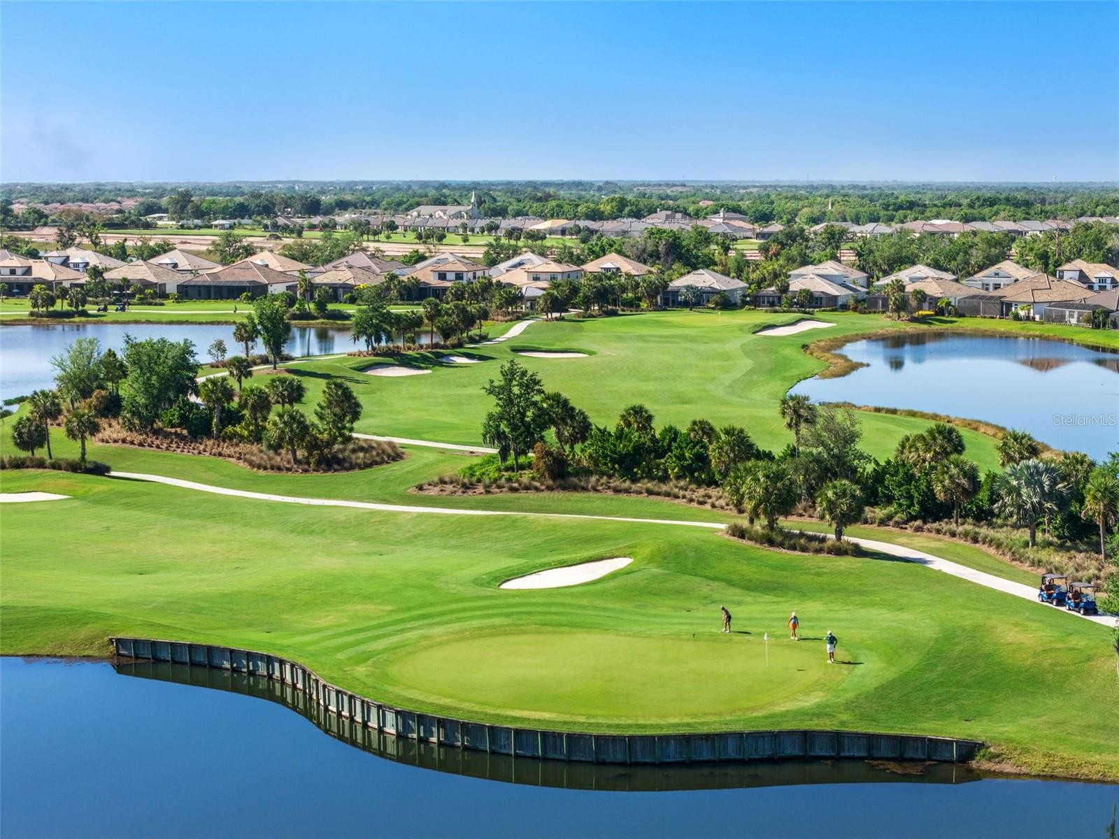 Welcome to you.r Fully Furnished Sunset Home!! Discover the perfect blend of luxury, comfort, and breathtaking views in this move-in-ready Pallazio floor plan, beautifully situated on a prime lake and golf homesite in Esplanade at Azario. From the moment you arrive, the upgraded landscaping and outdoor lighting set an inviting tone. Step through the elegant double glass doors and into a spacious three-bedroom, three-bath residence with a den, thoughtfully designed with high-end custom finishes throughout. All major furniture conveys; accessories, décor, artwork, small kitchen appliances, dishes etc. and personal items will be at the seller’s discretion. All bikes, wine and liquor does NOT convey. The enclosed office with glass doors provides a quiet workspace, while both guest suites offer ideal privacy. A custom wine wall and bar create a warm, stylish focal point in the dining area—perfect for entertaining. The gourmet kitchen features stainless steel Monogram appliances, abundant storage, and a layout designed for effortless hosting. Indoor living flows seamlessly to the stunning outdoor retreat, complete with an expansive pool and spa, travertine decking, outdoor kitchen, and fireplace. The panoramic screen showcases serene lake and golf views and unforgettable sunsets. This true smart home allows you to control lighting, security, Sonos audio, thermostat, pool, spa, and more directly from your phone. Upgrades include impact windows, lanai sunshades, a tankless Rinnai water heater, designer tile flooring, upgraded baths, custom closets and pantries, security cameras, and a spacious three-car tandem garage. Located in the resort-style community of Esplanade at Azario, residents enjoy a championship golf course, resort pool, poolside bar, spa, fitness center, tennis, and pickleball. ($1000 annual food & beverage minimum and $5,000 capital contribution due at closing. Golf membership included.)