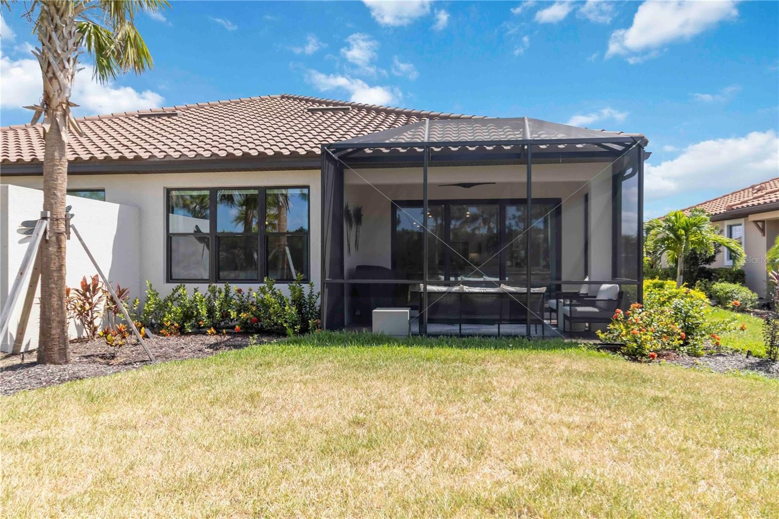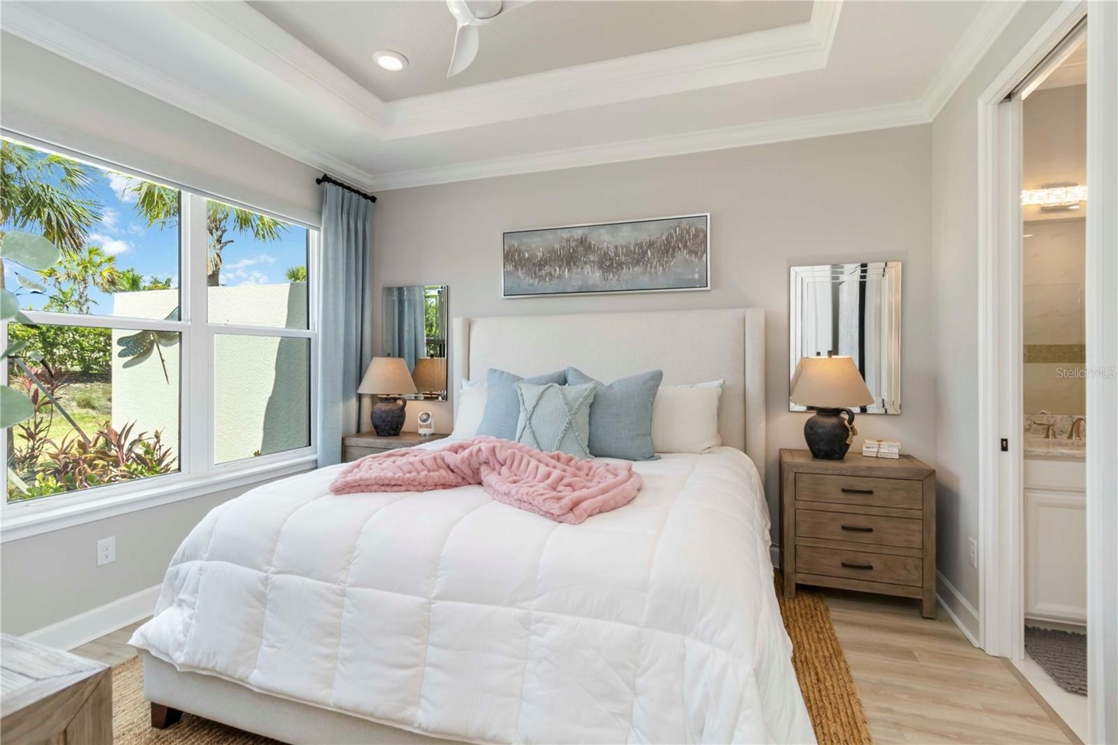 Welcome to effortless luxury in the heart of the sought after Esplanade at Azario community by Taylor Morrison. This impeccably upgraded 2-bedroom + den villa offers the perfect blend of comfort, style, and flexibility. From the moment you enter, you're welcomed into a bright, open-concept layout with high-end finishes that surpass the builder's model. Elegant tray ceilings with crown molding, upgraded lighting and fans, modern fixtures, and expansive sliding glass doors create a seamless indoor-outdoor flow. The gourmet kitchen is a showstopper, featuring stunning quartz countertops, sleek cabinetry, GE Café appliances, a wine refrigerator, tiled backsplash, and an oversized island—perfect for both entertaining and everyday living. The spacious primary suite offers garden views, a large walk-in closet with custom built-ins, and a spa-like ensuite bathroom with dual vanities, quartz counters, and a walk-in glass shower. A separate formal dining space adds sophistication, while the versatile den/office offers flexibility for working from home or relaxing. Notable Upgrades to home are: Tray ceilings, Crown molding throughout, extended screened Patio Cage, 8ft Solid Core Interior doors throughout, Impact Windows throughout, built in Refrigerator, 57 Bottle Wine Chiller Refrigerator, cushion close doors & drawers, upgraded tile in Laundry and baths with shower wall tile extended to ceiling, Closet-Tec Built in primary closet, window treatments included motorized shade in primary bedroom and acrylic seal garage floor. The screened lanai provides a peaceful setting to enjoy your morning coffee or evening breeze while overlooking professionally landscaped greenery—with room to expand your outdoor lifestyle if desired. As a resident of Esplanade at Azario, you’ll enjoy maintenance-free living and access to world-class amenities, including: Clubhouse & social events with a full-time activities director, Resort-style pool & fitness center, Tennis & pickleball courts, Walking trails & wellness services, Three on-site restaurants: Bahama Bar, Barrel Bistro & Olive & Vine, Optional golf available Located near shopping, dining, and top-rated schools, this villa is the perfect combination of location, luxury, and lifestyle.
