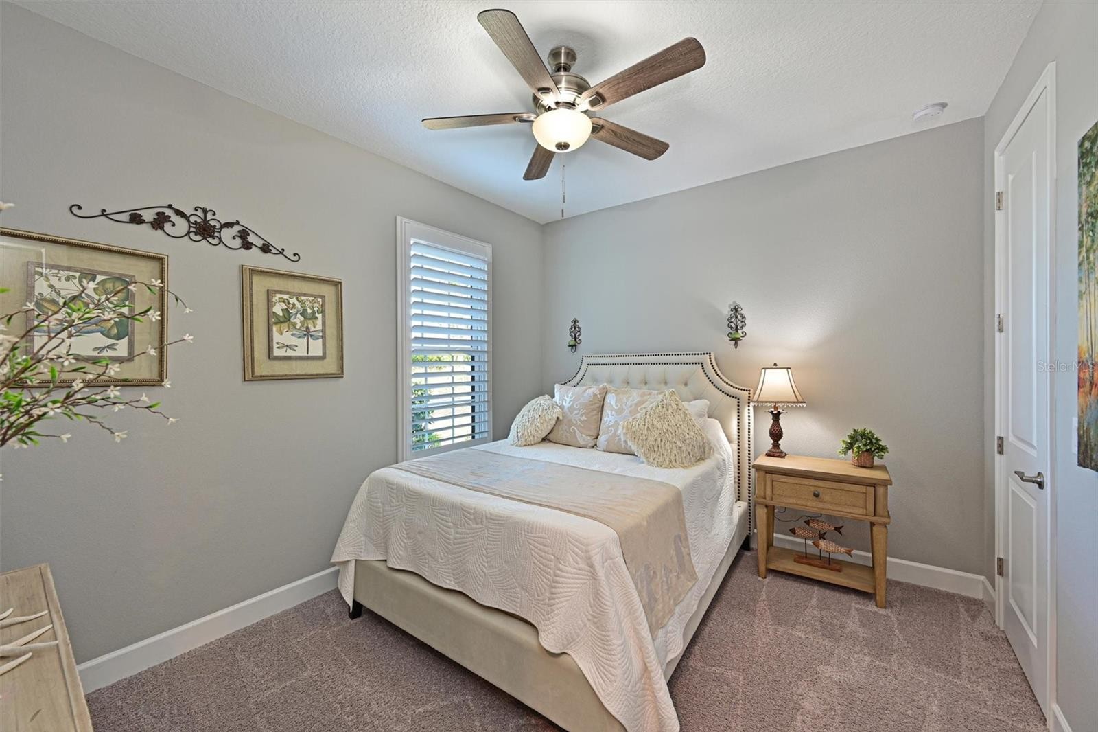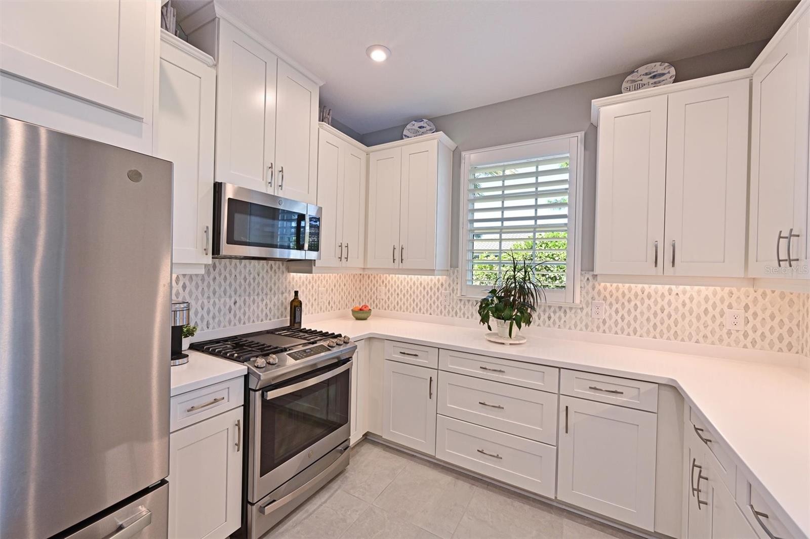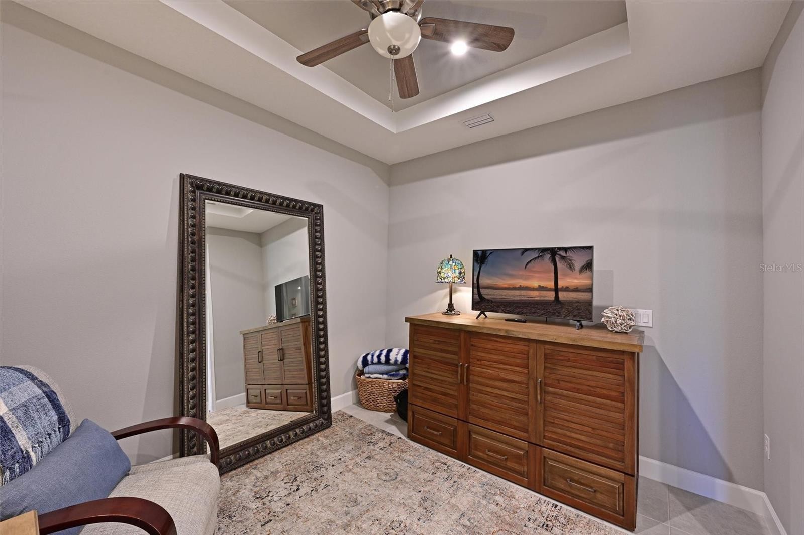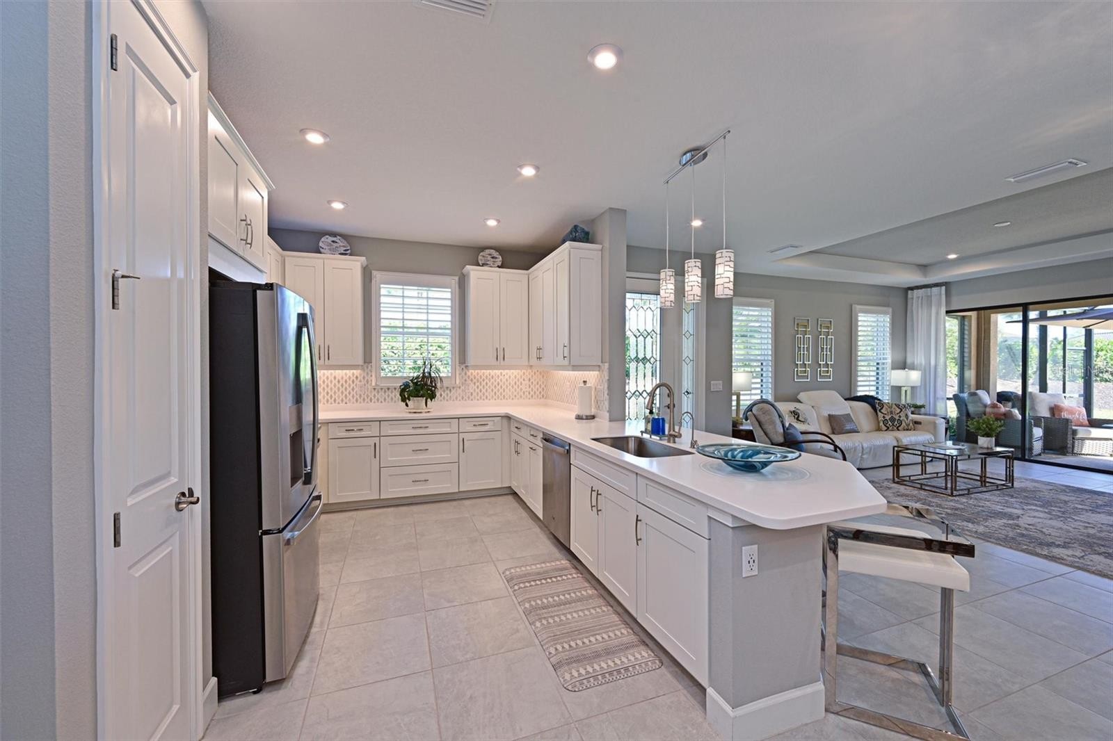 Welcome to resort-style living in Esplanade at Azario. This beautifully maintained private corner-lot villa offers 2 bedrooms, 2 bathrooms, and a private office/den with French doors—perfect for working from home or accommodating guests. The open-concept kitchen features a gas oven, stunning backsplash, and overlooks the spacious living room, creating an ideal space for entertaining. The primary suite is designed for comfort with dual sinks, a glass-enclosed walk-in shower, and a walk-in closet with custom built-in shelving. Step outside to your extended screened lanai with pavers, where you can relax and enjoy peaceful lake views. A gas line has already been installed, making it easy to add your dream outdoor kitchen. Additional upgrades include an insulated garage door and overhead garage storage. Living in Esplanade at Azario means access to exceptional resort-style amenities including an 18-hole first-class golf course (at a resident rate), resort-style pool and spa, fitness and wellness center, tennis and pickleball courts, walking trails, and a vibrant clubhouse featuring dining at the Culinary Center and outdoor Bahama Bar. With a full-time lifestyle director organizing events and activities, the community offers an active and social lifestyle in one of Lakewood Ranch’s most amenity-rich neighborhoods.