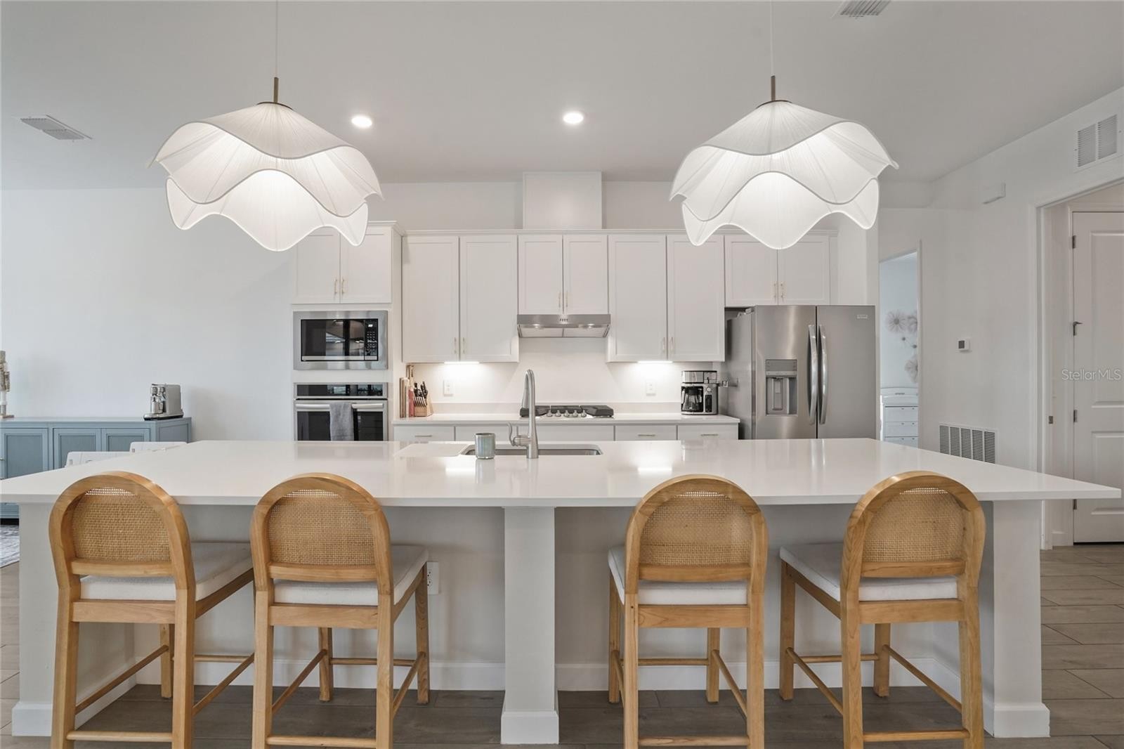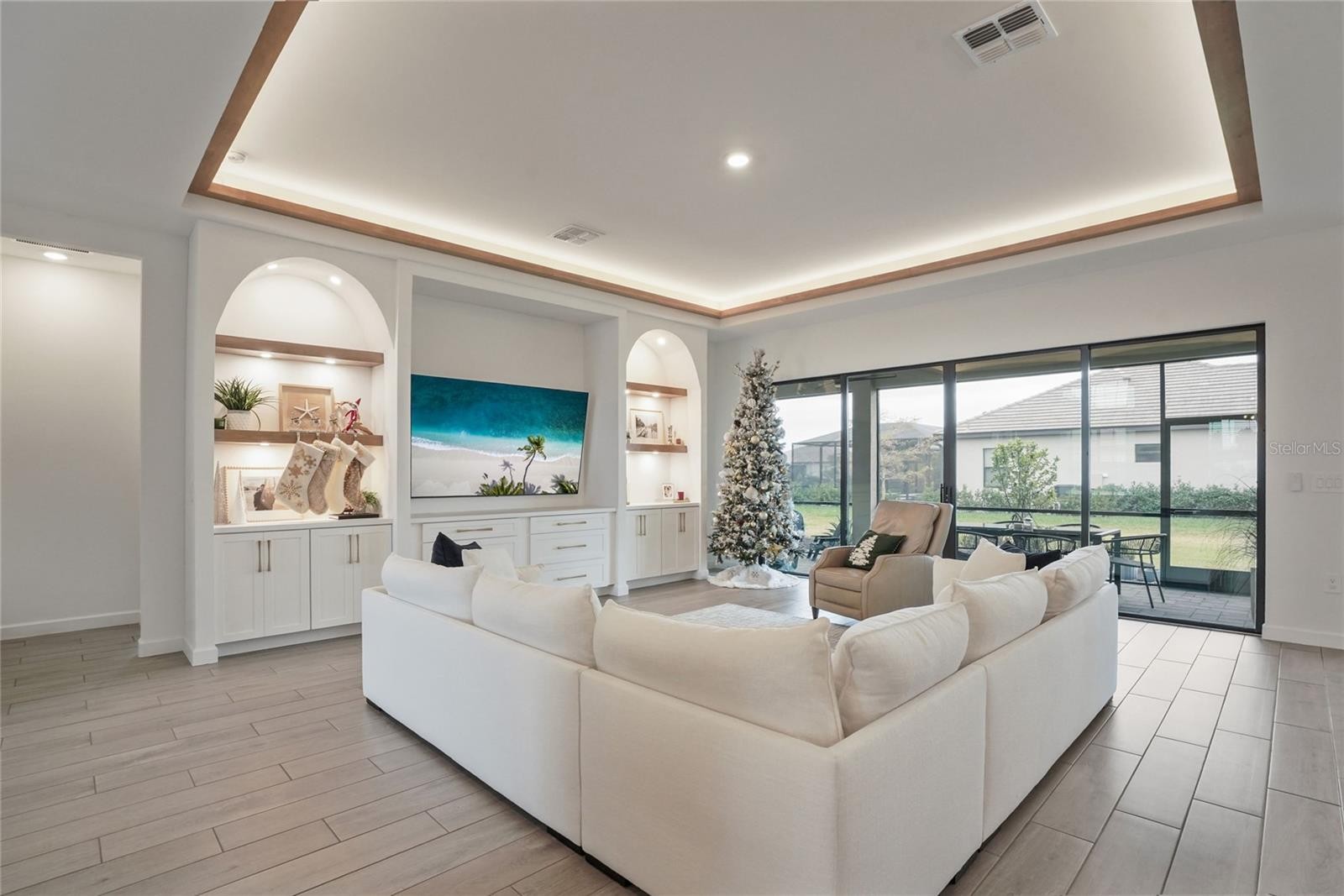 Located on a quiet street in the highly sought-after Lorraine Lakes community, this popular SUNSET model showcases exceptional upgrades and thoughtful design throughout. Upon entry, you’re welcomed by an impressive 12-foot foyer with elegant double glass front doors, setting the tone for this stunning home featuring 10 ft ceilings throughout. The heart of the home is the spacious great room, highlighted by a custom built-in wall featuring lighted floating shelves, graceful arches, and cabinetry offering additional hidden storage. A tray ceiling with custom trim and LED lighting adds a sophisticated touch of elegance. The impressive kitchen has been enhanced with designer gold hardware and a custom range hood, creating a refined yet functional space ideal for entertaining. A dedicated den/office features a striking slat-panel accent wall, upgraded LVP flooring, and an upgraded light fixture. A closet can easily be added, allowing this space to function as an optional fourth bedroom. The primary suite offers a serene retreat with a tray ceiling, two generously sized walk-in closets, and a spa-like ensuite bath complete with a walk-in shower, dual vanities, and a linen closet. Step outside to the spacious lanai, perfect for entertaining or simply relaxing while enjoying the peaceful surroundings. There is also ample room to build your dream pool if desired. Lorraine Lakes is designed to deliver a true resort-style living experience. The low HOA includes your cable, internet, lawn mowing and watering, allowing you to fully enjoy the community’s exceptional amenities. Residents enjoy a 25,000-square-foot clubhouse featuring a coffee lounge, restaurant and bar, aerobic center, basketball court, arcade, and a state-of-the-art fitness center with a children’s play area. Outdoors, you’ll find two resort-style pools, a splash pad, poolside bar, tennis and pickleball courts, putting green, volleyball and bocce ball courts, and a playground. Ideally located in the heart of Lakewood Ranch, this home is just minutes from shopping, dining, A-rated schools, championship golf courses, and a short drive to the world-famous Gulf Coast beaches. Don’t miss this opportunity to own an exceptional home in one of the area’s most desirable communities.