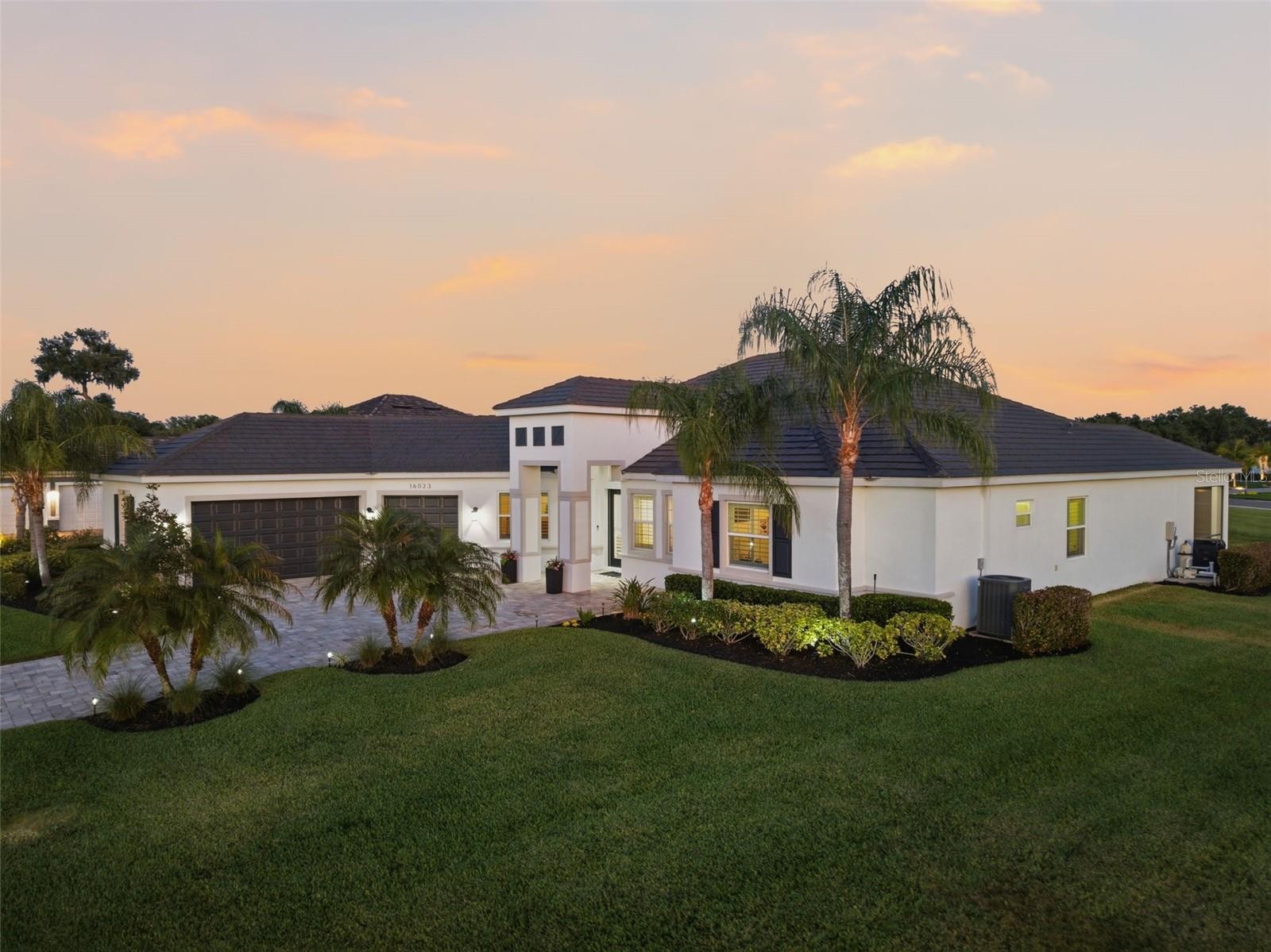 Welcome to the sought-after gated community Reserve at Twin Rivers, a serene neighborhood where luxury, space, and lifestyle come together on an expansive 0.67-acre homesite. This beautifully designed Medallion Homes "Caicos" floorplan offers 2,849 square feet of thoughtfully crafted living space, featuring 3 bedrooms, a private den/office, a dedicated media room and 3.5 bathrooms. The home showcases an open-concept layout ideal for everyday living and entertaining, with its spacious great room that flows seamlessly into the gourmet kitchen and dining areas. Luxury laminate flooring runs throughout the main living spaces, complemented by high-end lighting, and the gourmet kitchen boasts ample cabinetry and a large island. The split-bedroom design ensures privacy, with a well-appointed primary suite separate from guest accommodations. Step outside to your private outdoor retreat, complete with a large screened-in 6' deep, oversized pool with water features and expansive lanai - perfect for enjoying Florida living year-round. The oversized 0.67-acre lot provides exceptional space and features a unique Tee Box with a 50-yard shot to your own putting green, creating a one-of-a-kind backyard experience. Additional highlights include an oversized 3-car garage, fenced side yard with secure pet/dog run, pre-plumbing for an outdoor kitchen, and built-in closets. Situated near highly rated schools, and close-proximity to shopping, dining, and I-75. Come see why this home is the perfect place to enjoy luxury living with a unique blend of privacy and convenience!