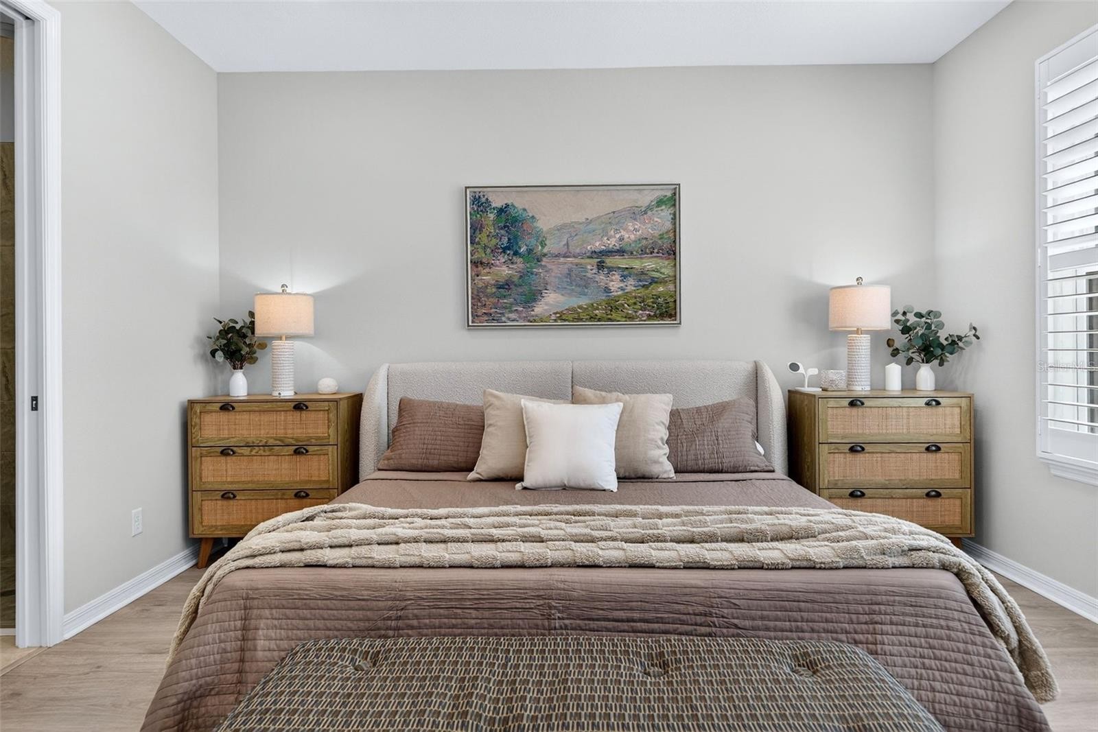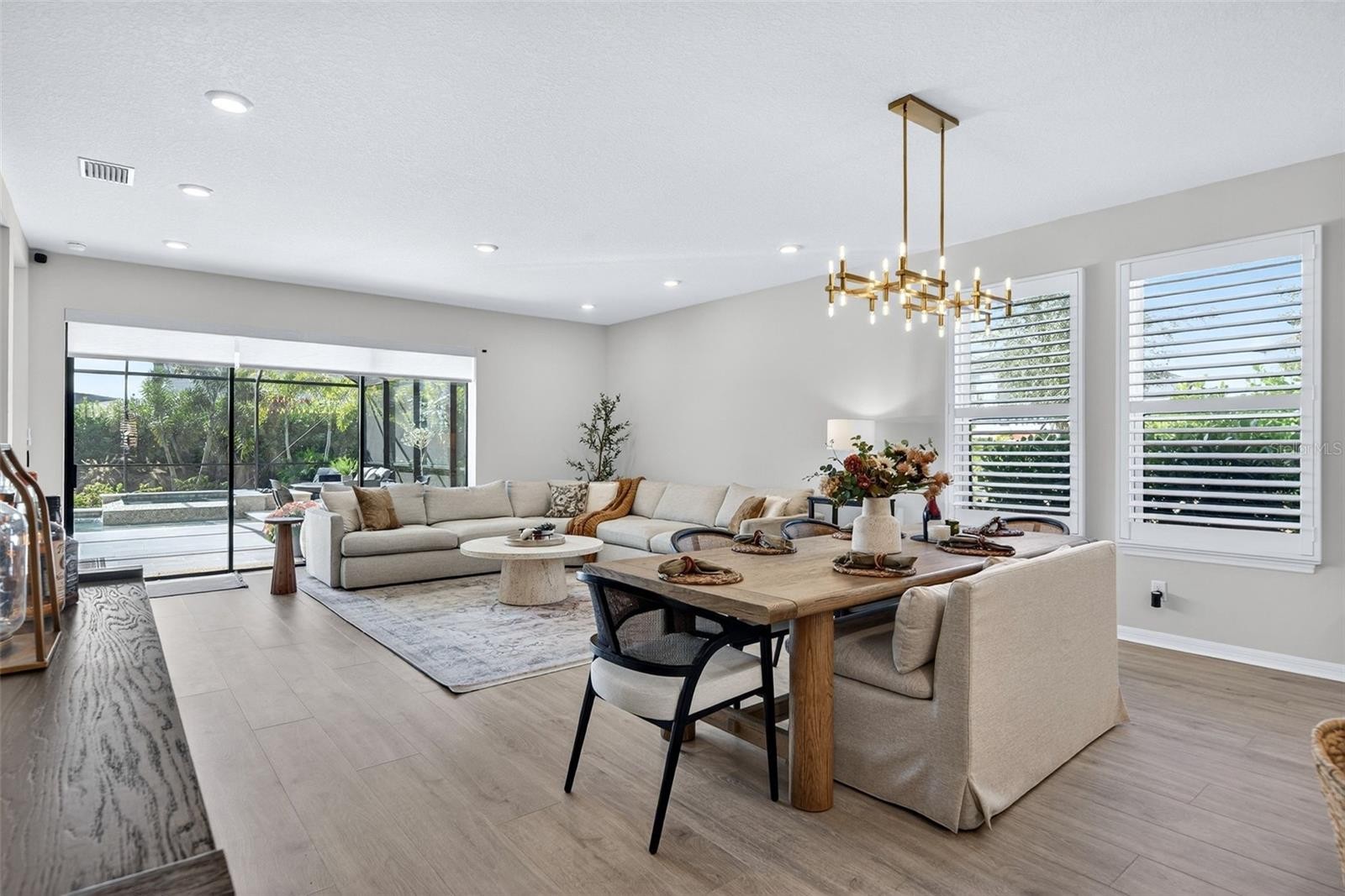 A true showpiece of modern Florida luxury, 16106 Culpepper Drive is an exceptional Antigua floor plan residence set on a premium corner lot with serene water views in the highly sought-after Park East at Azario. Meticulously upgraded and designed for elevated living, this stunning single-story home blends refined interiors with a resort-caliber outdoor retreat—creating an irresistible lifestyle opportunity for today’s luxury buyer. From the moment you arrive, the extended paver driveway, upgraded front entry, and enhanced landscaping with mature trees make a striking first impression. Inside, the home unfolds into a bright, open-concept layout where natural light pours through expansive south-facing sliders, framing the spectacular outdoor living space beyond. Plantation shutters throughout add timeless elegance and privacy, while high-end finishes elevate every room. The gourmet kitchen is both beautiful and functional, featuring a gas cooktop, oversized center island, butler’s pantry, and a dedicated drinking water filtration system—perfectly suited for entertaining or everyday luxury. Seamless flow into the living and dining areas makes hosting effortless and inviting. Step outside to your private backyard oasis, where luxury truly comes to life. Enjoy a custom-designed pool and spa, a covered outdoor kitchen complete with built-in grill and refrigerator, and an outdoor gas fireplace that transforms evenings into unforgettable experiences. A battery-operated lanai shade on the rear slider enhances comfort, while the expansive screened enclosure creates a resort-style atmosphere ideal for year-round enjoyment. The primary suite is a serene retreat, offering peaceful views and a spa-inspired ambiance. Custom-designed closets in the primary suite, pantry, and laundry room provide exceptional organization and convenience. Three additional bedrooms are thoughtfully arranged, including a private guest suite with its own bath, while a versatile den with glass French doors offers the perfect space for a home office, media room, or flex space. Additional premium upgrades include air conditioning installed in the garage, ensuring comfort and flexibility for storage, fitness, or hobby use—further enhancing the home’s thoughtful design. Sophisticated, stylish, and designed to impress, this exceptional home offers the ultimate blend of luxury, comfort, and resort-inspired living. Opportunities like this are rare—schedule your private showing and experience it for yourself.
