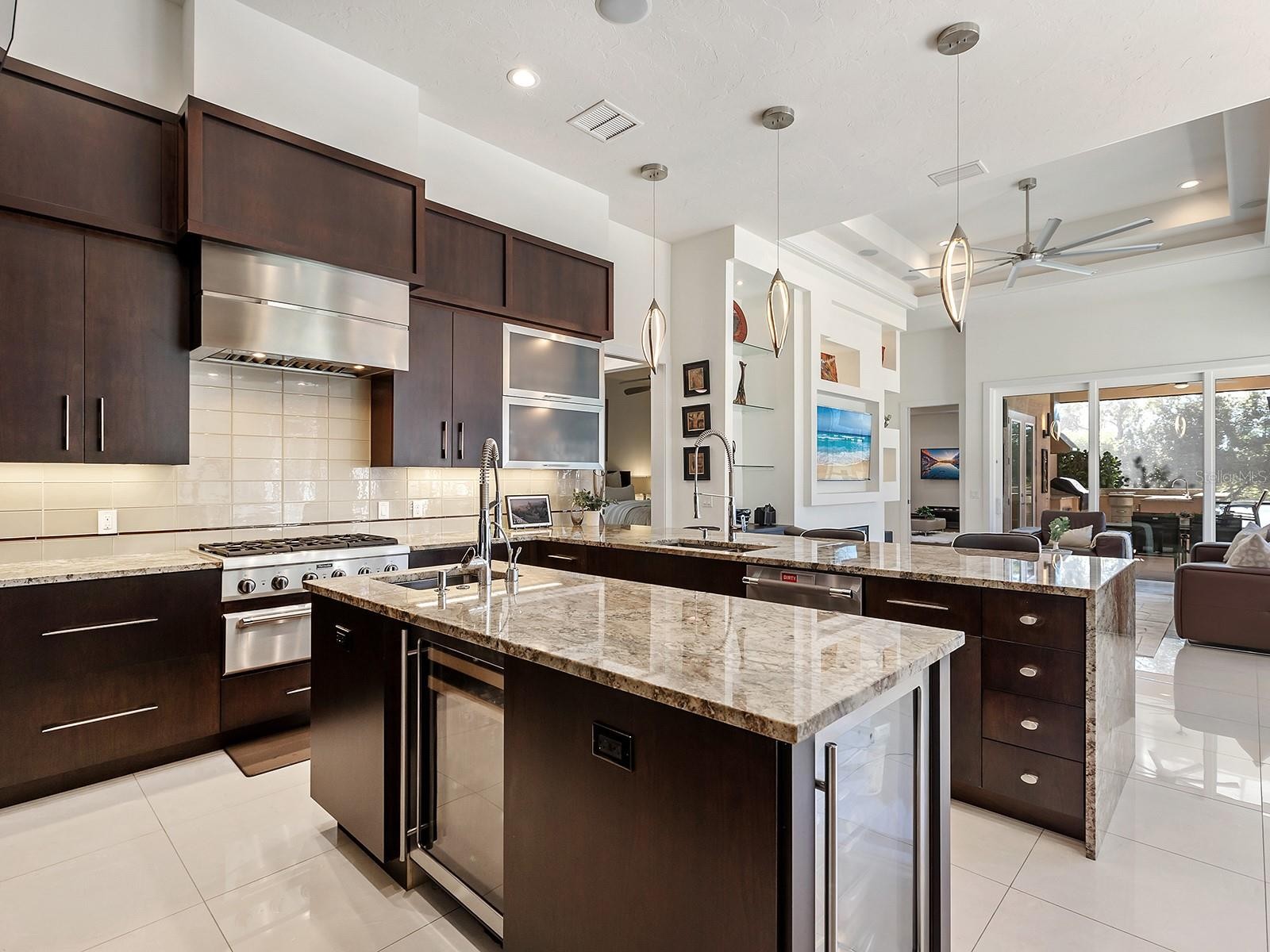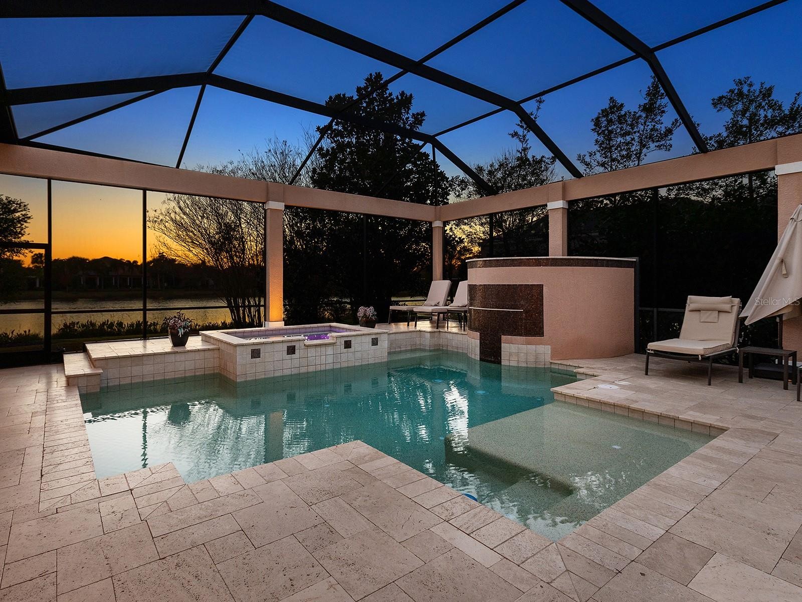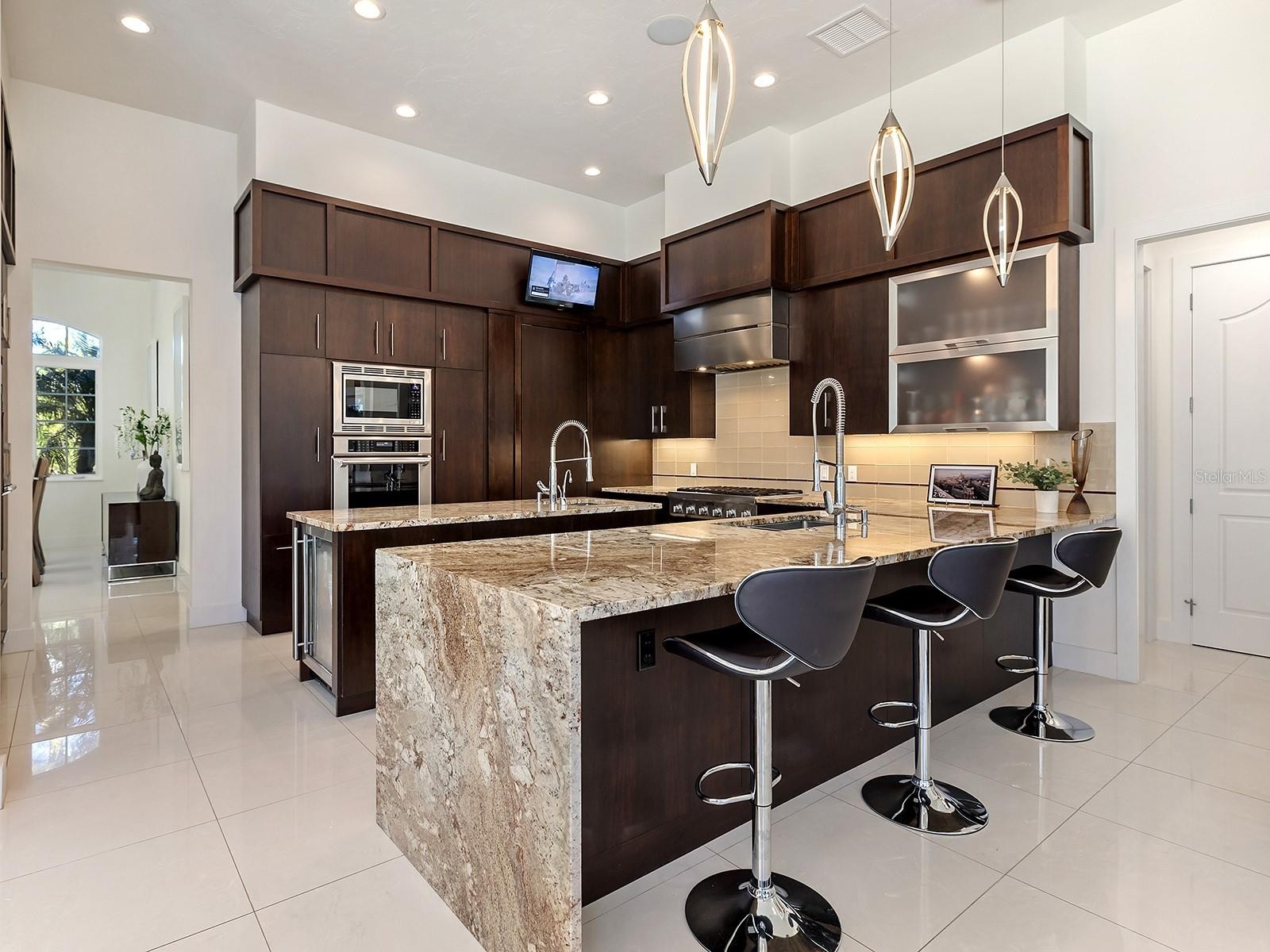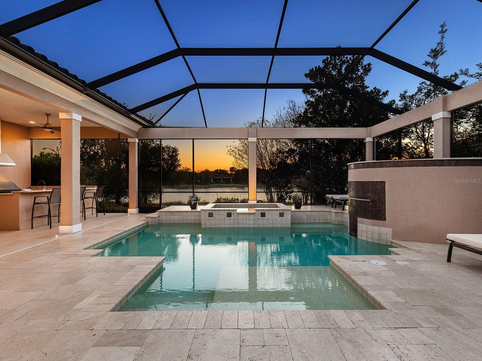 Ready for a completely custom, lakeside lifestyle in one of the premier communities of Lakewood Ranch? Now available in The Lake Club is this custom Todd Johnston residence that is brimming with contemporary style, sparkling lake views, and the little touches throughout the home that make living here a true joy. Located in the original phase of The Lake Club, you’ll arrive home from the gated entrance to streets lined with mature palms and oaks, and you can take advantage of the proximity of the clubhouse and amenities. Boasting over 3,400 SF, this home has a space for every lifestyle, whether you enjoy formal entertaining, casual gatherings, or outdoor get togethers. From the solid double front door, you’re invited into the foyer where you get the first glimpses of the southwestern lake views and custom upgrades including porcelain tile flooring; impact windows and sliders, designer light fixtures, custom feature walls, tray ceilings with sound system, and more. The formal living and dining spaces set the stage for holiday meals and elegant entertaining, or wind down with casual weeknights in the family room and dinette nook. The chef’s kitchen is truly the star of this home showcasing custom slab cabinetry, waterfall stone counters, peninsula seating, and a central island with prep sink, 2 wine refrigerators, and reverse osmosis system. The top-of-the-line appliance suite by Thermador makes cooking a breeze with a 6-burner gas cooktop, warming drawer, dishwasher, refrigerator, built-in steam wall oven, microwave, and your own coffee station with built-in Miele cappuccino machine. The family room is the ideal hang out space with a custom feature wall of art display niches and fireplace, plus two walls of sliding glass doors connecting you to the outdoors. The travertine paver lanai takes center stage with a completely custom pool that is truly a work of art with waterfall, sunshelf, and raised spa that maximizes the lake views. Surrounded by a classic colonnade screen enclosure, the lanai offers two separate covered entertaining areas and custom outdoor kitchen outfitted with stainless steel grill, separate side burner, bar fridge, and your very own pizza oven! Inside the spacious primary suite offers dual views of the lanai and pool, separate seating area, large walk-in closet with his and hers built-ins, and a custom morning bar so you don’t need to leave your bedroom for morning coffee. The en-suite bathroom is truly a spa experience with custom tile walls and floors, jetted soaking tub; vanity with extra storage, large built-in mirrored medicine cabinet, towel warmer, his and her’s private water closets, TV within the mirror and a spacious frameless glass walk-in shower with rain heads, body sprays, and steam. When you crave privacy, retreat to the study with custom leather-look floors and built-in storage cabinetry that is tucked away from the action of the home. There is even a large bonus room with lakes views and French doors to the lanai that offers a versatile space for a media room, hobby room, den, or anything your lifestyle desires. Guests will find comfort in their own spacious bedrooms complete with walk-in closets and en-suite bathrooms; one bathroom also offers additional access as a full pool bath. Completing this impressive residence is a laundry room, and 3-car side-loading garage. The Lake Club is an exclusive premier, gated community with a Grande Clubhouse, restaurant, pool, tennis, pickleball and more.