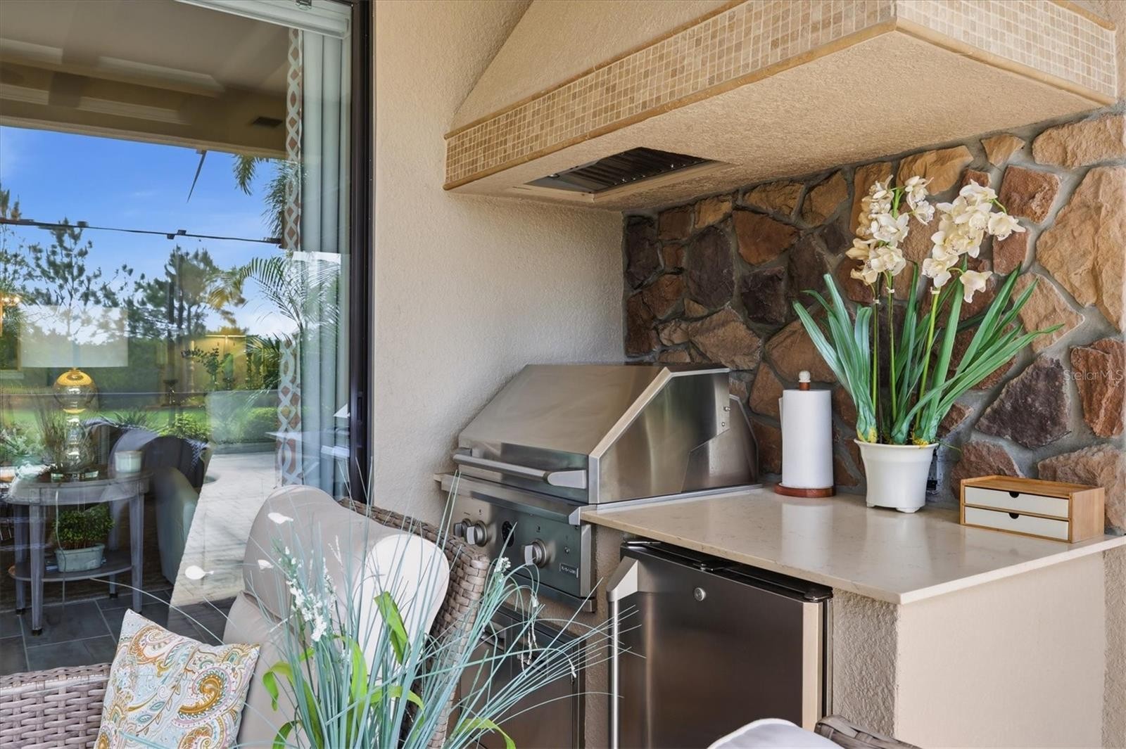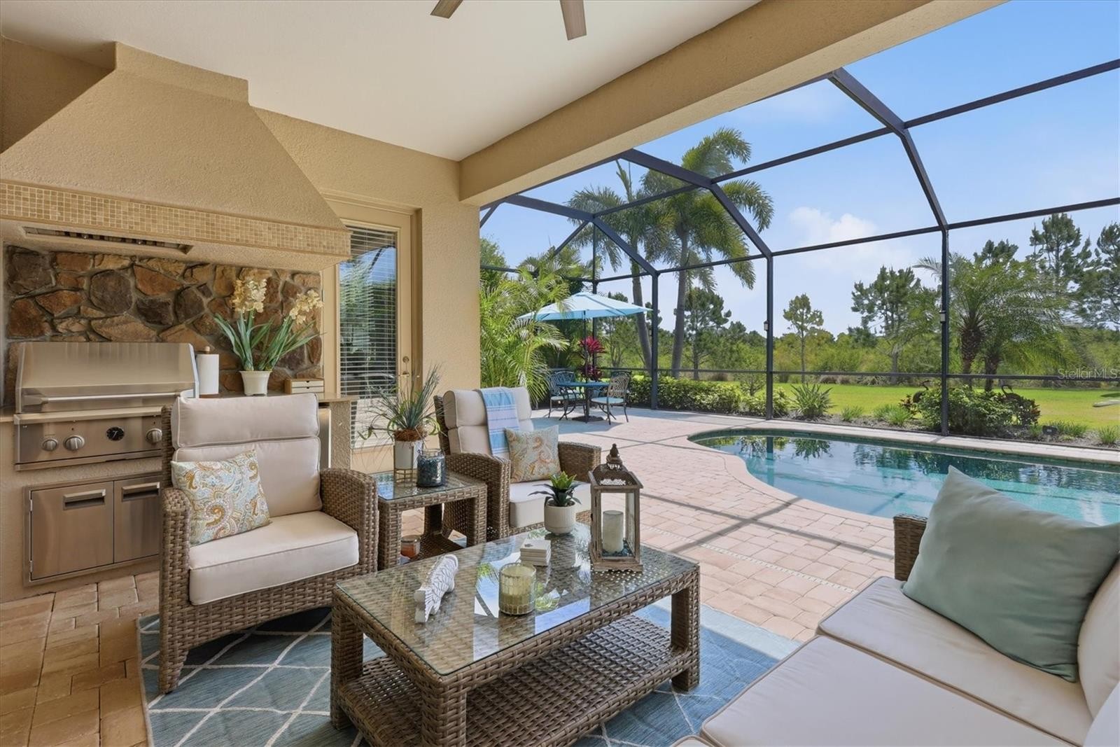 Located behind the gates of Country Club East in Lakewood Ranch, this highly upgraded residence offers an exceptional blend of luxury, privacy, and seamless indoor-outdoor living. Perfectly positioned on a beautiful private preserve homesite, the home captures the essence of Florida living with tranquil views and thoughtfully designed spaces throughout. Inside, the home showcases a bright, open-concept layout enhanced by 10-foot coffered ceilings, beamed architectural details, and extensive custom millwork. Modern tile flooring flows throughout the main living areas and primary suite, complemented by upgraded lighting and refined finishes. The dining room makes a striking impression with architectural arches and mirrored walls that reflect the space and add depth to the entry foyer, creating an elegant and inviting ambiance. The chef’s kitchen is both functional and beautifully appointed, featuring quartz countertops, a large center island, and 42-inch soft-close cabinetry with pot-and-pan drawers. Additional custom cabinetry has been added to the breakfast nook, complete with built-in drawers and floating shelves to increase storage capacity. Stainless steel appliances, including a 5-burner natural gas cooktop, complete the space, while a cozy breakfast nook provides the perfect place to start your day. A hidden pantry, tucked behind a custom-finished solid mahogany antique door, adds a distinctive and sophisticated design element. With four bedrooms, the flexible fourth bedroom is ideal for use as a home office or guest suite. The owner’s suite serves as a private retreat, featuring double crown molding, an oversized walk-in closet with custom shelving, and a spa-style en suite bath designed for comfort and relaxation. Built to more recent hurricane standards, the home includes a tied-down roof system and high-impact windows, offering enhanced durability and peace of mind. Additional upgrades include 8-foot interior doors, crown molding and upgraded baseboards, a tankless water heater, and epoxy-finished garage flooring. Step outside to your private outdoor oasis, where a heated pool and spa—enhanced with a new pump, skimmer, and lighting—are surrounded by lush, extensive landscaping for ultimate privacy. The expansive lanai features a custom summer kitchen complete with a grill and refrigerator, ideal for entertaining or relaxing year-round. Triple pocket sliding glass doors fully open to the lanai, creating a seamless transition between indoor and outdoor living. Meticulously maintained and ideally located just minutes from Waterside Place, UTC shopping and dining, and a short drive to the world-renowned Gulf Coast beaches, this home offers a lifestyle defined by comfort, quality, and convenience.