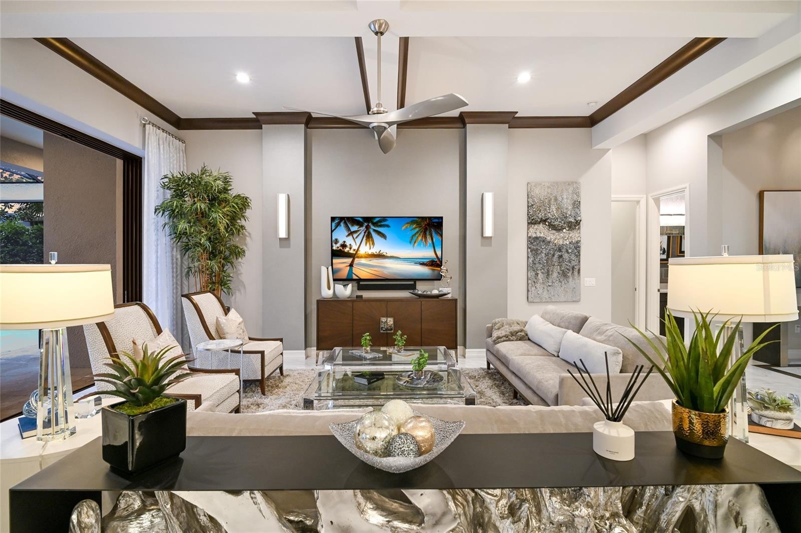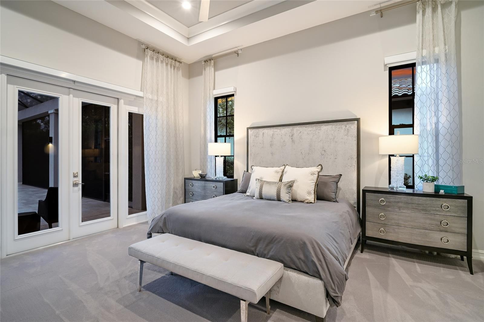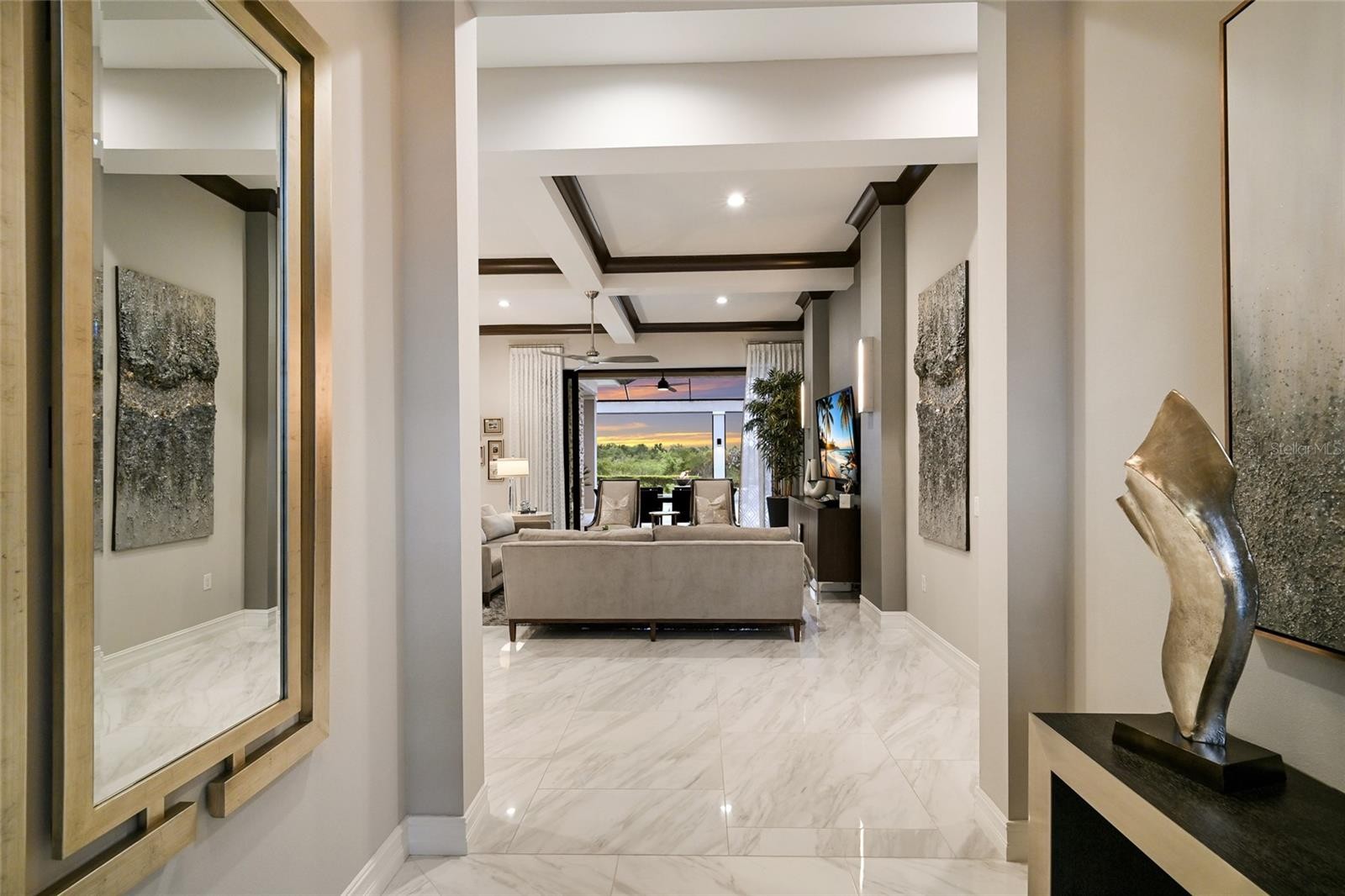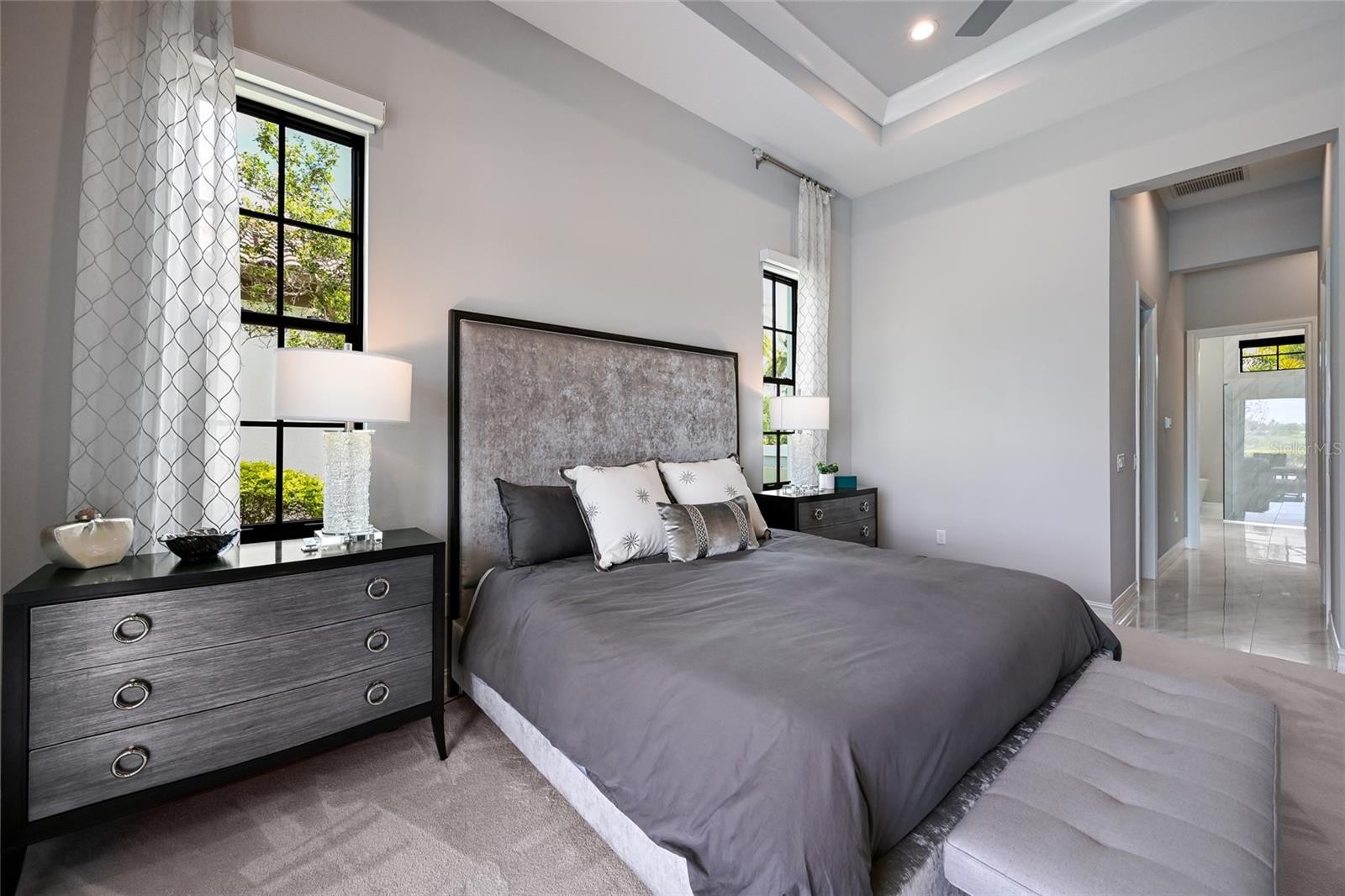 Curated by an interior designer, this professionally refined residence was built on a stunningly private lot boasting conservation wildlife views in the Vineyards section in the exclusive gated community of The Lake Club. Encompassing 3,268 square feet of open one-story living, this customized Stock Home built in 2019 exudes stylishly planned indoor and outdoor spaces, accentuated volume ceilings, skillfully selected finishes, significant upgrades after build, and, of course, all IMPACT windows/doors/sliders. A magnificent outdoor living retreat delivers on all fronts with extensive open and under cover spaces grounded with travertine pavers, soaring designer accentuated ceilings, full summer kitchen recently expanded with a wrap around bar, a PebbleTec heated saltwater pool/spa with fire bowls, and a dual sided gas fireplace with surrounding stone. Ten foot disappearing impact glass sliders seamlessly connect the outdoor oasis to a luxuriantly elevated great room, dining area and kitchen crowned with stunning ceiling treatments and designer light fixtures creating a sophisticated and open continuity of space. Meanwhile the kitchen further accentuates with waterfall quartz counters, dovetail soft-close drawers, large walk-in pantry, high-performance Jenn-Air appliances, and even a warming drawer. An impressive club room with an ensuite pool bath directly off lanai beckons for entertaining or spill over guests with the addition of a built-in bar with undercounter wine and beverage fridges. Serentity awaits in the owner’s quarters positioned on a private wing, offering tray ceilings, large scale windows, direct lanai access via French doors, two oversized walk-in customized closets, privacy remote screens, and a luxuriously appointed bath with separate vanity stations with an abundance of cabinetry, an oversized invigorating shower, soaking tub, and separate water closet. There are two additional guest suites generous in size, both with ensuite full baths, walk-in closets, plantation shutters, and each on separate wings of the home. The residence also offers a powder room and an impressive office behind double-entry doors just off the entry foyer. Other notable highlights of this newly built all-encompassing 5,039 total square foot residence includes the addition of a stone facade and recently painted exterior, welcoming courtyard entry pillars, brilliantly finished laundry room, tankless water heater, all impact windows and doors, water softener system, reverse osmosis in the kitchen, Smarthome automation, and an oversized three car garage with built-in storage cabinets. Modern refinement and a lifestyle fulfilled beckons in The Lake Club, where residents enjoy access to a wealth of amenities, including two resort-style heated pools, Grande Clubhouse with fine dining and bar area, a fitness center, spa, tennis courts, pickleball, a playground, dog park, and services of a full-time concierge and activities director.