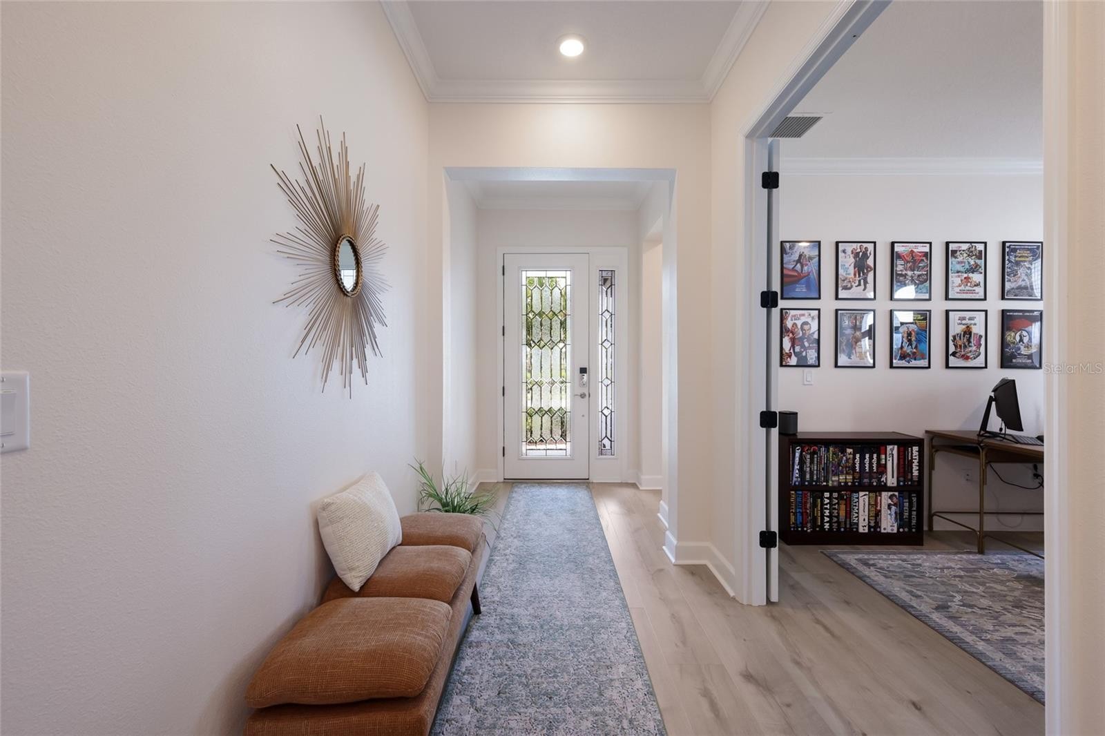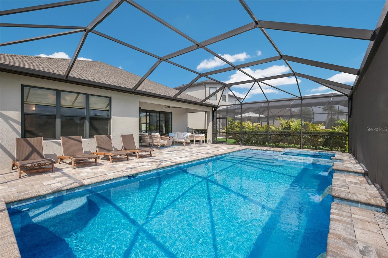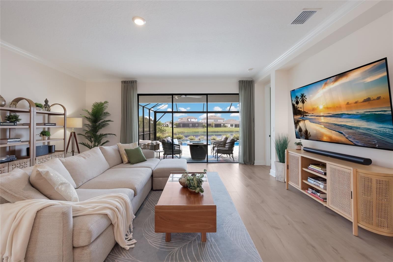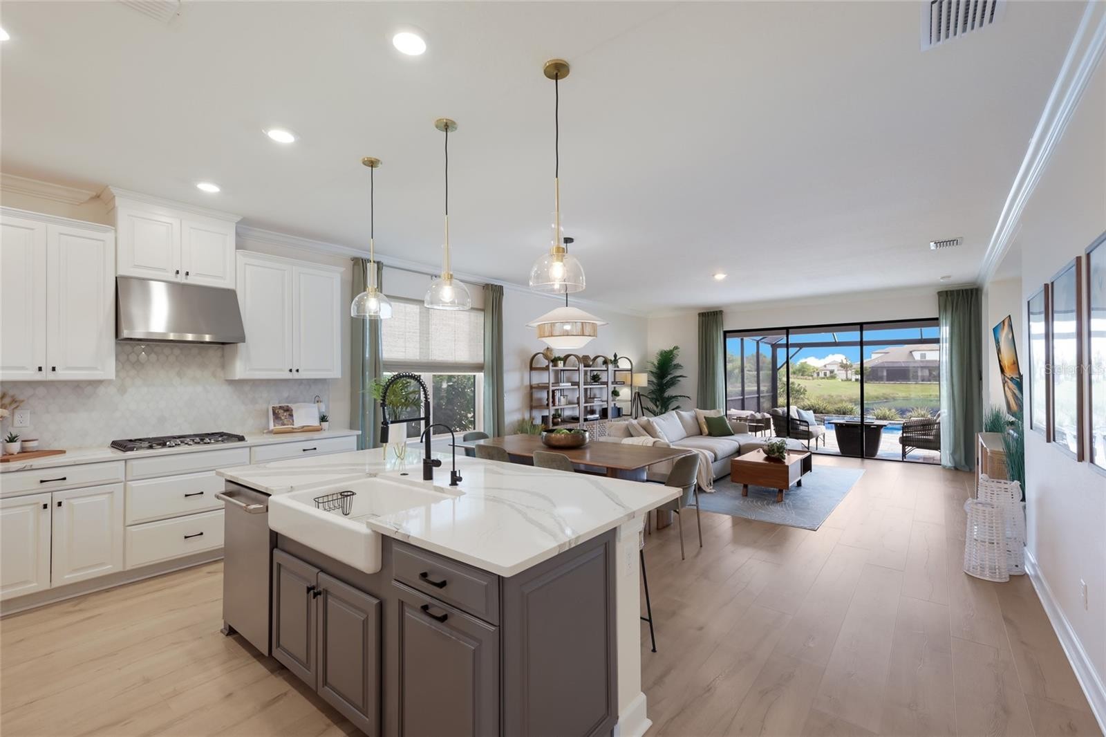 Welcome to a light filled, beautifully appointed 4 bedroom plus den, 3 bath home that blends clean modern lines with warm transitional style, complete with a pool and spa, breathtaking deep water views, and standout upgrades throughout. With its airy open layout, soft designer finishes, high ceilings, and seamless indoor outdoor flow, this home feels both polished and inviting, offering a fresh, stylish look with the comfort and livability today’s buyers want. Gourmet kitchen highlights include stainless GE Cafe appliances, quartz countertops, a gas cooktop with range hood, a French door oven, a farmhouse sink, soft close drawers, pull out drawers beneath the cooktop, roll out trash, slide out shelves, a dry bar and butler’s pantry, and upgraded light fixtures. Interior upgrades include high ceilings with 8 foot interior doors, quartz countertops throughout, crown molding, 5 inch baseboards throughout, laminate flooring, a frosted glass front door, a home office with French doors, a tray ceiling in the primary bedroom, floor to ceiling tile in both the primary and guest bathrooms, herringbone tilework in the primary bath, upgraded modern chandeliers in the hallway, dining room, and primary bedroom, and a 15 amp 110 volt floor outlet with brass cover in the living room. The primary suite offers an ensuite bath with a step in shower featuring frameless glass enclosure, dual shower heads including a rainshower, a bench, a garden bath, dual sinks, and an enormous walk in closet. Outside, enjoy a gas heated saltwater pool and spa with three water features, tranquil water views, a panoramic screen enclosure, prewiring for speakers on the lanai, and a ceiling fan. Park East at Azario offers residents a well rounded community lifestyle with a resort style pool and hot tub, volleyball court, basketball court, playground, dog park, sports field, and beautifully maintained community landscaping throughout. Beyond the neighborhood, the home is positioned near A-rated schools and just minutes from the shopping, dining, and entertainment hubs that make Lakewood Ranch so desirable. Main Street Lakewood Ranch offers boutiques, restaurants, cinemas, events, and a walkable town center atmosphere, while Waterside Place adds a more modern lakefront setting with dining, retail, a farmers market, live music, and regular social events. Lakewood Ranch as a whole features more than 300 shops and restaurants, giving buyers an exceptional level of everyday convenience and lifestyle appeal. The area is further enhanced by proximity to renowned Gulf Coast beaches including Siesta Key, Lido Key, Longboat Key, Anna Maria Island, and Coquina Beach, while travel is made easy with Sarasota Bradenton International Airport nearby and both St. Pete Clearwater International Airport and Tampa International Airport also readily accessible.