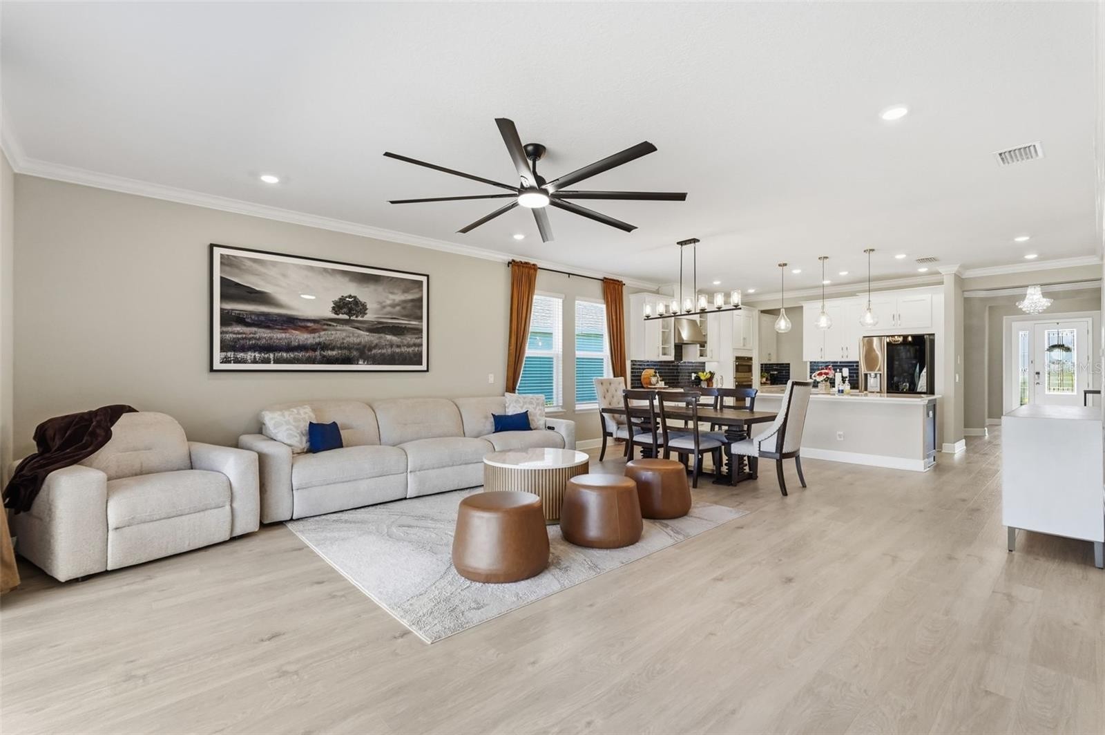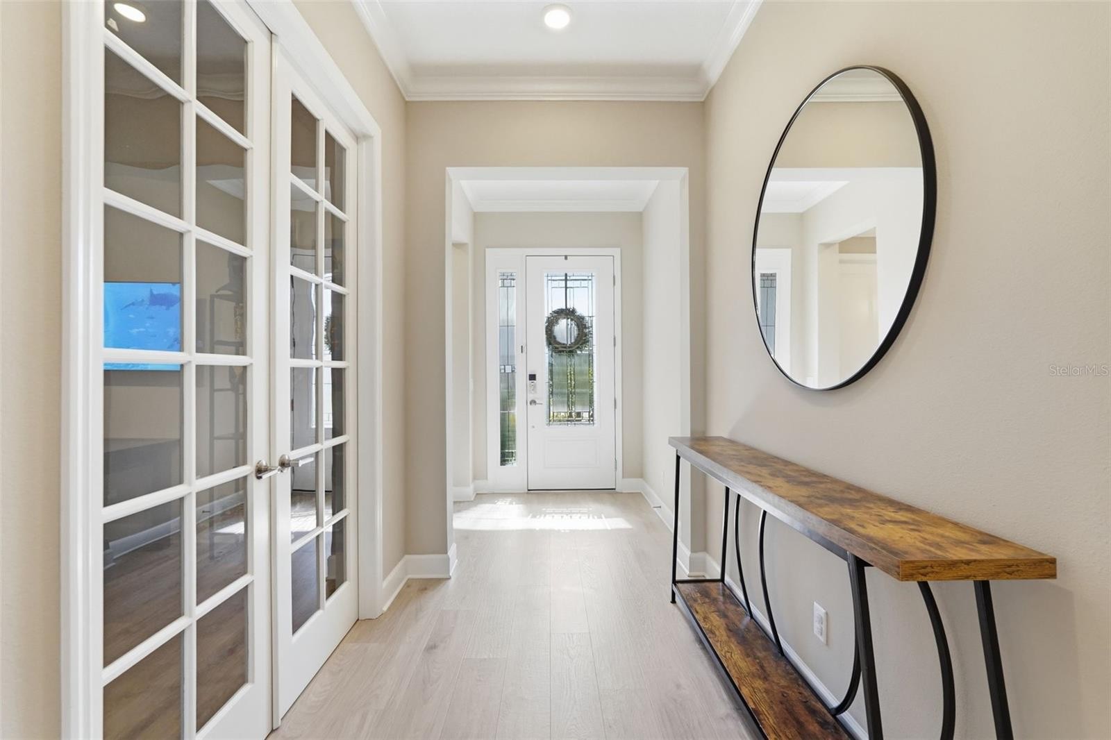 Welcome to this exceptional residence in Lakewood Ranch, Florida, ideally located within the highly desirable Park East at Azario community. Built in 2025, this stunning Antigua floor plan offers four bedrooms, a dedicated office, and an impressive collection of upscale, thoughtfully selected upgrades that create a home both elegant and inviting. All available upgrades have been thoughtfully completed in this home, offering a truly move-in-ready experience with elevated finishes throughout. Enjoy close proximity to Florida’s world-renowned Gulf Coast beaches, premier shopping and dining at destinations like UTC Mall, local boutiques and restaurants throughout Lakewood Ranch, fitness centers, medical facilities including Lakewood Ranch Medical Center, shopping plazas, parks, and so much more, placing everything you need just minutes from your doorstep. Due to an unexpected executive relocation, this beautifully upgraded home is now available, creating a rare opportunity for a new owner. Meticulously maintained and thoughtfully designed, it offers a perfect blend of comfort, style, and everyday functionality. From the moment you step through the striking glass front door, you are welcomed into a light-filled, open-concept space enhanced by additional recessed lighting throughout, 8-foot doors, crown molding, and beautiful luxury vinyl flooring. Designer features such as custom shiplap and accent walls, statement chandeliers, upgraded light fixtures, ceiling fans in every room, and a built-in fireplace with shelving add warmth and character. The gourmet chef’s kitchen is the heart of the home, showcasing quartz countertops, glass-front cabinetry, stainless steel appliances, a built-in oven and microwave, and a premium refrigerator that crafts specialty ice, perfect for entertaining. Pocket sliding glass doors lead to a pavered back patio, creating a seamless indoor-outdoor flow ideal for relaxing or hosting guests. The primary suite offers a peaceful retreat with a tray ceiling and a spa inspired bath featuring a soaking tub, seamless glass shower with rain head and handheld sprayer, and tile extended to the ceiling. A thoughtfully added door provides convenient access to the laundry room from both the hallway and the primary closet. All three bathrooms feature floor-to-ceiling tile for a refined, cohesive look, and pull down attic stairs provide easy access to additional storage.