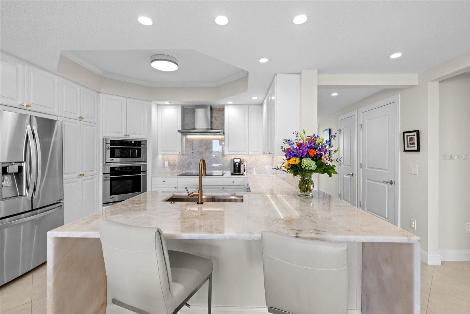 Rarely available bayfront luxury awaits in Summer Cove on Siesta Key— offering expansive water views in a boutique, gated community of just 45 residences on 3.5 lush acres with beach access to world-famous Siesta Key Beach. Built in 2007, this beautifully renovated 4th-floor condo offers 3 bedrooms with 2.5 baths, in approximately 2,100 sq ft that truly lives like a single-family home. A private elevator lobby affords direct entry into your foyer. The open-concept interior is stunningly updated and impeccably finished, with a designer kitchen featuring quartzite countertops and backsplash, white cabinetry, stainless steel appliances, and sweeping water views. The kitchen flows seamlessly into the dining area and spacious living room, where floor-to-ceiling sliders span the entire length of the space. Open the sliders to an oversized bayfront terrace with glass railings showcasing beautiful water views —perfect for sunrise coffee, watching boats cruise the Intracoastal, and dining al fresco in the evenings. The primary suite is equally impressive, showcasing floor-to-ceiling sliders that frame beautiful bay views, plus two custom walk-in closets and a spa-inspired bath with soaking tub, dual-sink vanity, and an expansive walk-in shower with multiple shower heads, including a rain shower. A split floor-plan, two additional bedrooms are tucked down the hall—one with a large custom walk-in closet, partial Gulf views, and an en-suite bath that also opens to the hallway. Additional highlights include a laundry room with sink, bonus storage room with closet, convenient service-elevator access, and stair access to the exit. A second terrace is located off the back of the residence and offers partial Gulf views, ideal for sunset lounging. A true standout feature: enjoy sunrises over the bay from your main terrace and sunsets over the Gulf from the rear terrace - the best of both worlds. Hurricane-impact windows and sliders throughout. Two garage parking spaces are included in an adjacent garage, located on the 2nd level for added storm convenience, with a private storage locker behind the parking spaces. Summer Cove amenities include private beach access, a bayfront resort-style pool and hydraulic kayak/SUP launch, boat docks, a striking clubhouse designed by Carl Abbott of the Sarasota School of Architecture, and a recently renovated fitness center that offers the convenience of a true on-site gym just steps from home. Additional clubhouse features include gathering spaces, a full kitchen for easy catering, and a private owner locker—ideal for storing gym gear and more. A pet-friendly community, two large pets are permitted. An active social calendar with frequent clubhouse gatherings makes for a vibrant community. Beyond the gates, enjoy the best of Siesta Key and Sarasota—just minutes to Siesta Key Village for abundant restaurants, boutiques, and island nightlife, and a short drive to downtown Sarasota’s renowned arts and culture - waterfront dining, shopping, theaters, museums, opera, ballet, and symphony. A highly sought-after Siesta Key community where residences are seldom available—don’t miss this exceptional opportunity.