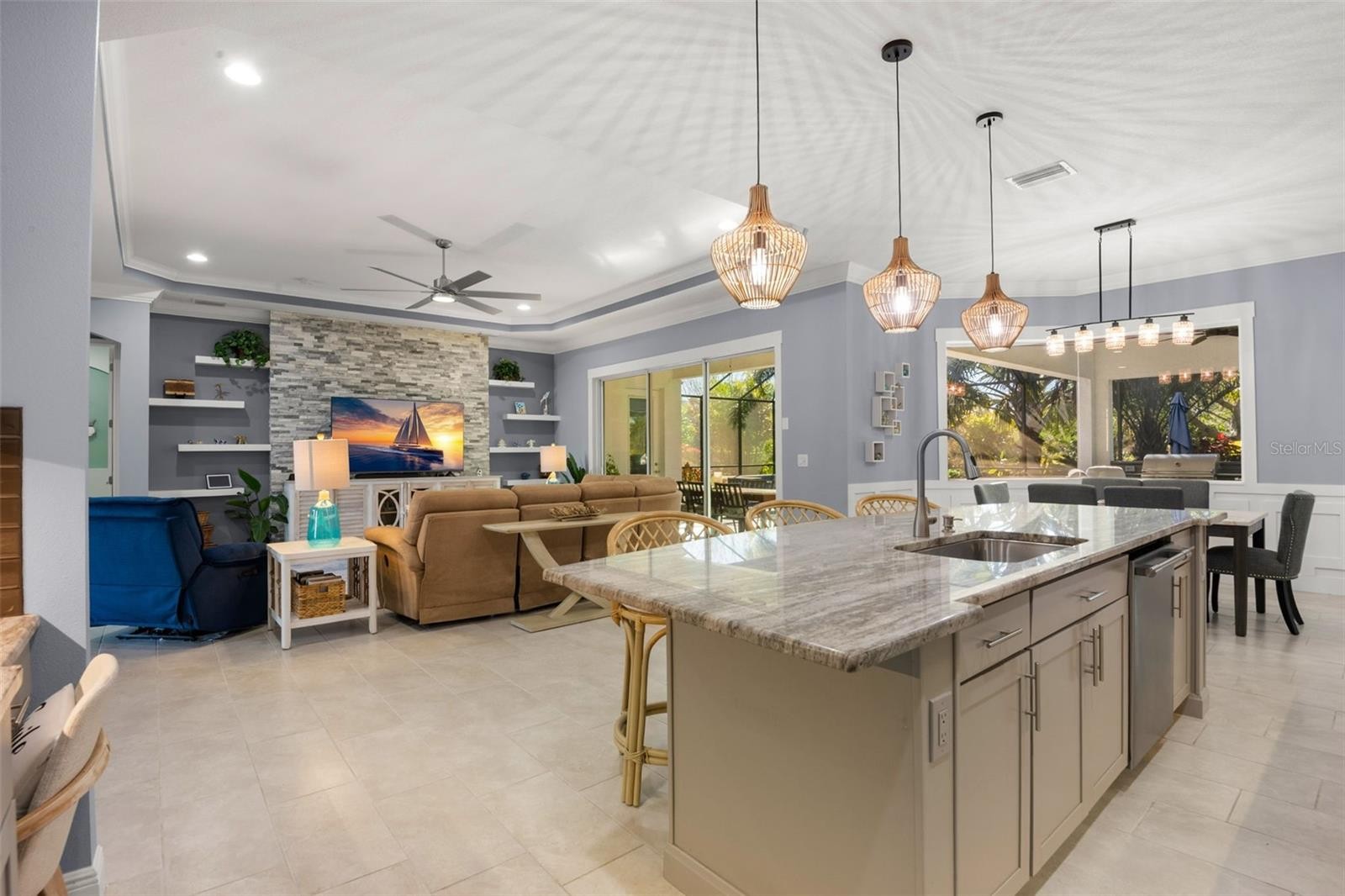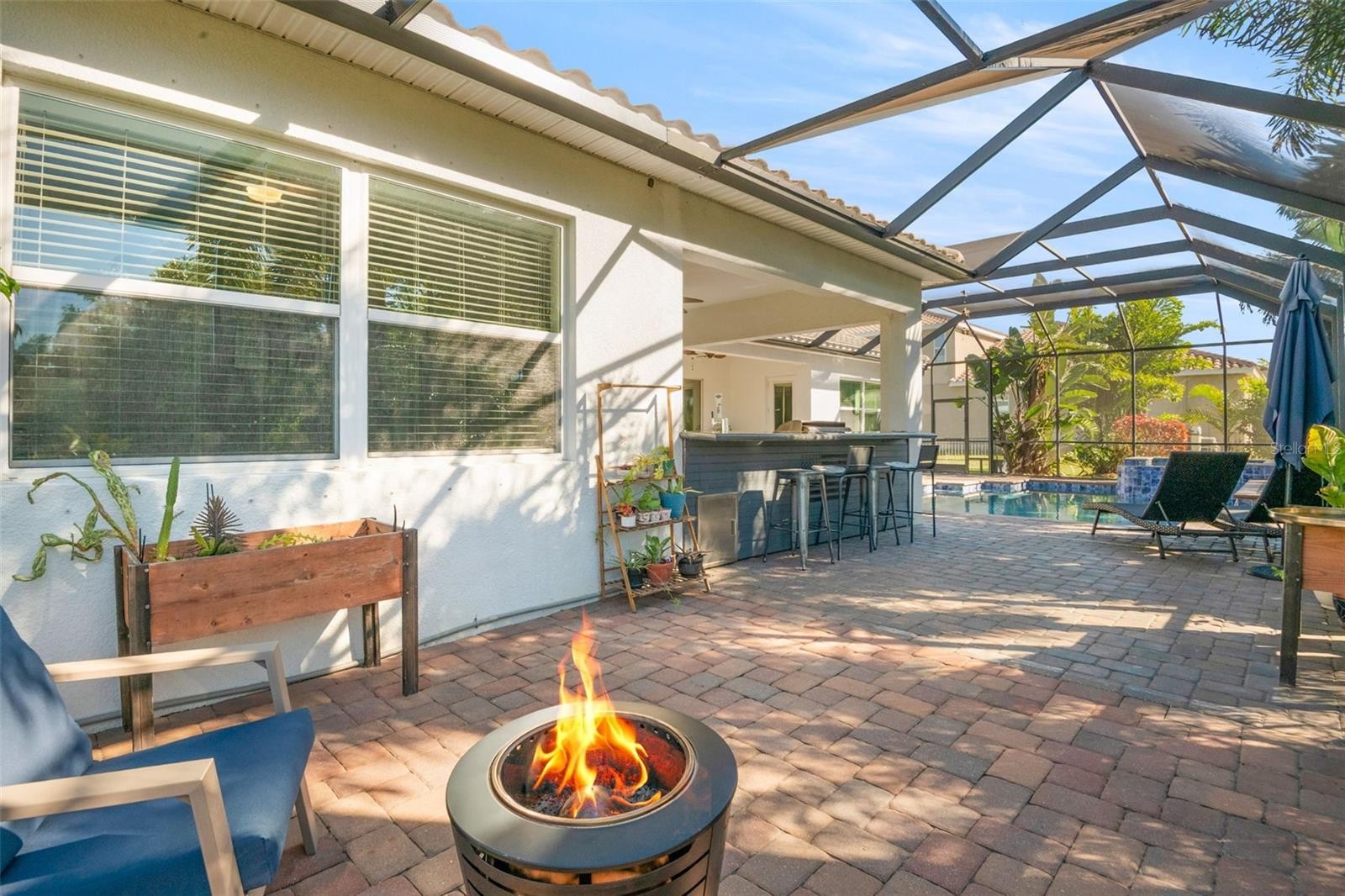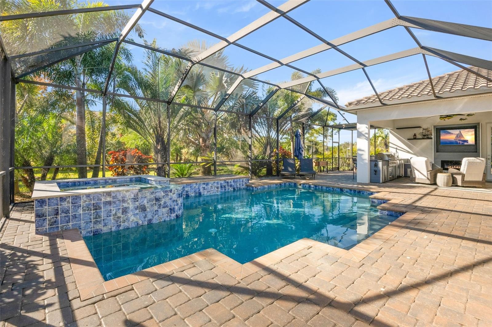 Welcome Home to an exquisite Lory model in the prestigious Rye Wilderness Estates. This residence combines timeless sophistication with modern design, offering 4 bedrooms, 4 bathrooms, a 3-car garage, and a half-acre homesite crowned with a tile roof and paver driveway. Double 8-foot glass entry doors open to a grand interior where 10-foot ceilings with crown molding create an immediate sense of elegance. The expansive great room is a true showpiece, featuring a dramatic stone accent wall with custom shelving and a tray ceiling that elevates the space. The gourmet kitchen is designed for both function and style, boasting an oversized island, top-tier stainless steel appliances, induction cooktop, custom vented hood, designer backsplash, granite countertops, and solid wood cabinetry with pullouts. A walk-in pantry provides abundant storage, blending convenience with refinement. The outdoor living space rivals a private resort. A custom pool with brand-new spa is framed by an extended paver lanai and screened enclosure, while the fully equipped outdoor kitchen with fireplace and seating area offers the ultimate setting for entertaining. Manicured landscaping surrounds the property, creating privacy and a lush backdrop. The master suite is a private retreat behind double doors, featuring expansive custom walk-in closets and a spa-like bath with dual vanities, a soaking garden tub, and a grand walk-in shower. Two additional en-suite bedrooms with walk-in closets, plus a fourth bedroom with access to the pool bath, ensure comfort and luxury for family and guests alike. With no CDD fees and low HOA dues, Rye Wilderness Estates is celebrated for its generous lot sizes, estate-style homes, and proximity to fine dining, shopping, top-rated schools, entertainment, and world-class Gulf beaches. Community amenities include playgrounds and sports courts, enhancing the appeal of this exclusive neighborhood. This property is more than a home — it is a statement of luxury, offering a lifestyle defined by elegance, comfort, and distinction.