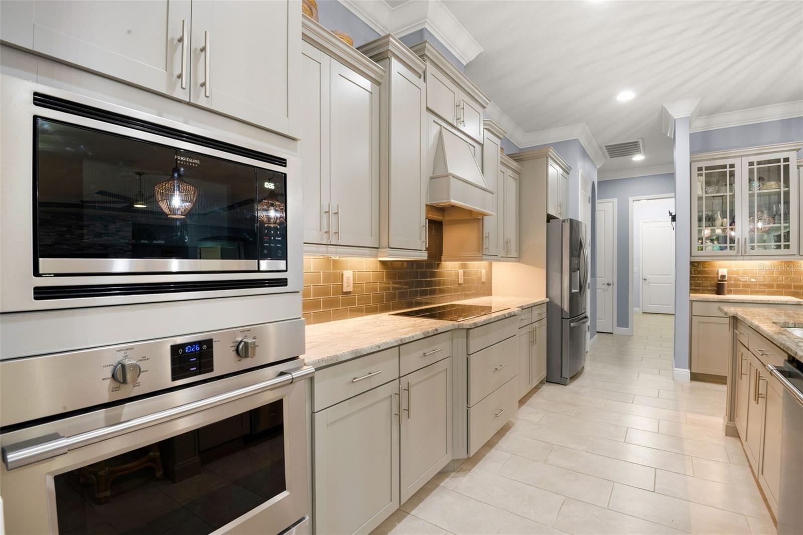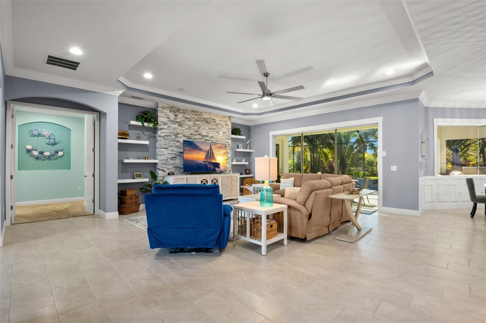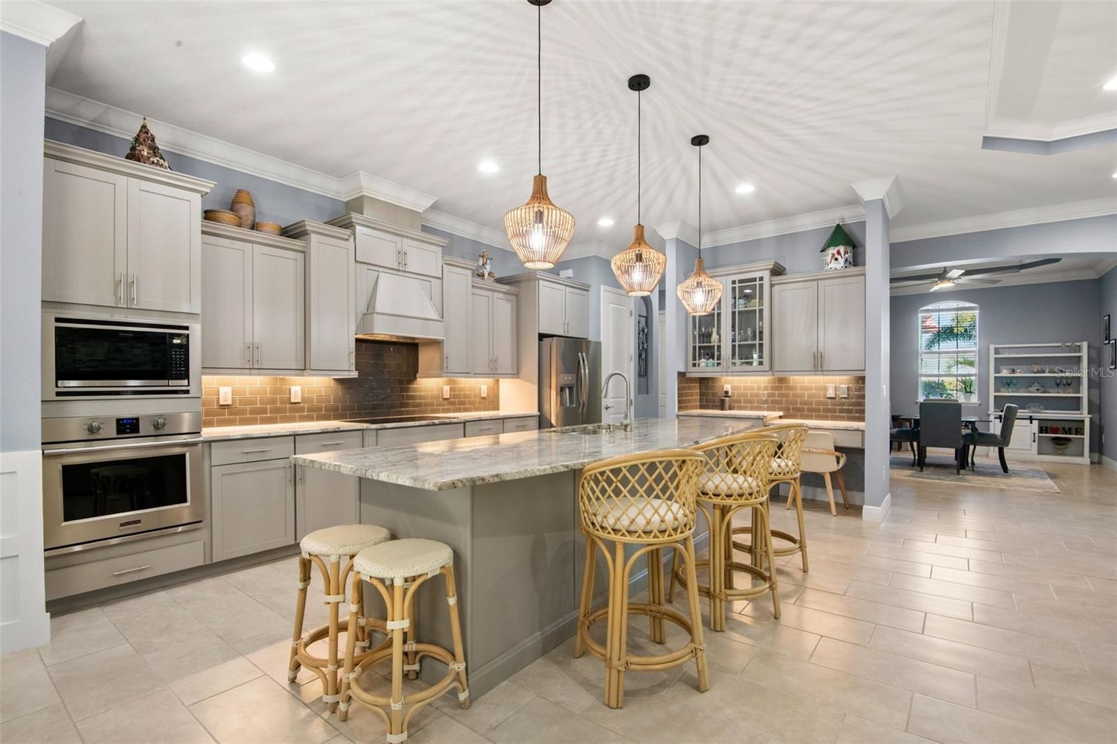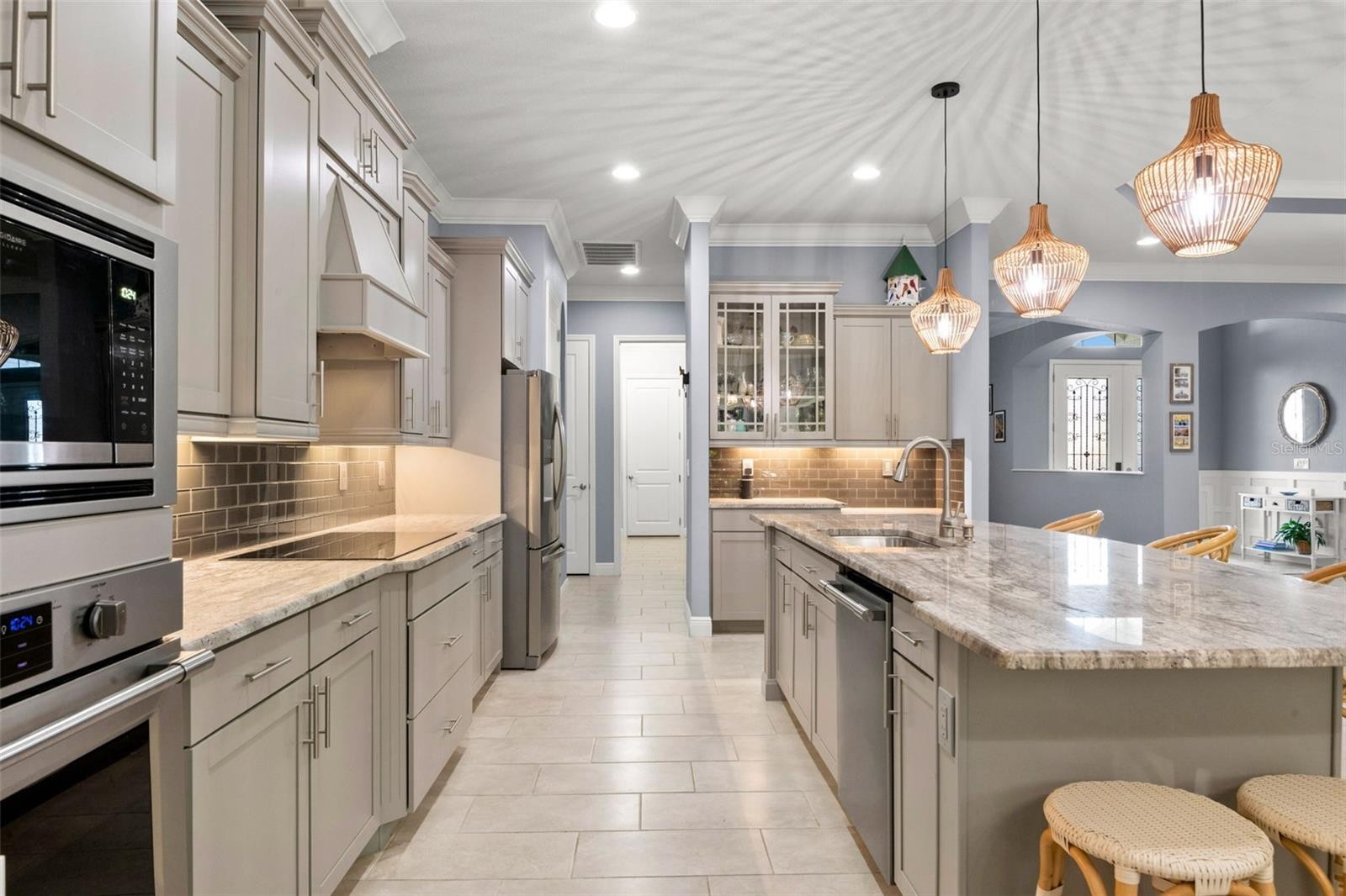 Welcome Home to an exquisite Lory model in the prestigious Rye Wilderness Estates. This residence combines timeless sophistication with modern design, offering 4 bedrooms, 4 bathrooms, a 3-car garage, and a half-acre homesite crowned with a tile roof and paver driveway. Double 8-foot glass entry doors open to a grand interior where 10-foot ceilings with crown molding create an immediate sense of elegance. The expansive great room is a true showpiece, featuring a dramatic stone accent wall with custom shelving and a tray ceiling that elevates the space. The gourmet kitchen is designed for both function and style, boasting an oversized island, top-tier stainless steel appliances, induction cooktop, custom vented hood, designer backsplash, granite countertops, and solid wood cabinetry with pullouts. A walk-in pantry provides abundant storage, blending convenience with refinement. The outdoor living space rivals a private resort. A custom pool with brand-new spa is framed by an extended paver lanai and screened enclosure, while the fully equipped outdoor kitchen with fireplace and seating area offers the ultimate setting for entertaining. Manicured landscaping surrounds the property, creating privacy and a lush backdrop. The master suite is a private retreat behind double doors, featuring expansive custom walk-in closets and a spa-like bath with dual vanities, a soaking garden tub, and a grand walk-in shower. Two additional en-suite bedrooms with walk-in closets, plus a fourth bedroom with access to the pool bath, ensure comfort and luxury for family and guests alike. With no CDD fees and low HOA dues, Rye Wilderness Estates is celebrated for its generous lot sizes, estate-style homes, and proximity to fine dining, shopping, top-rated schools, entertainment, and world-class Gulf beaches. Community amenities include playgrounds and sports courts, enhancing the appeal of this exclusive neighborhood. This property is more than a home — it is a statement of luxury, offering a lifestyle defined by elegance, comfort, and distinction.