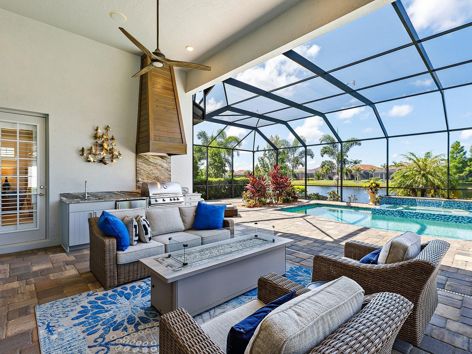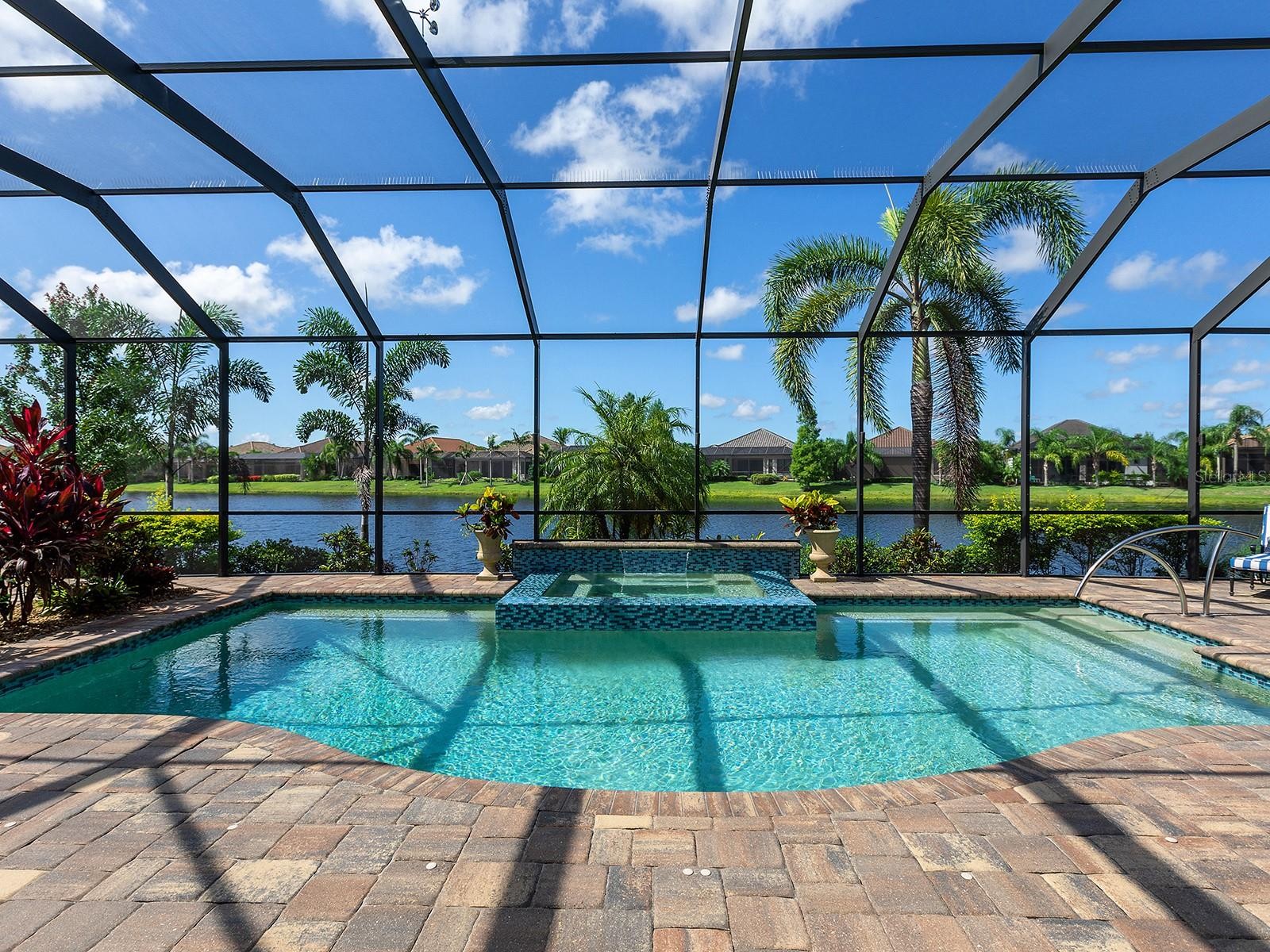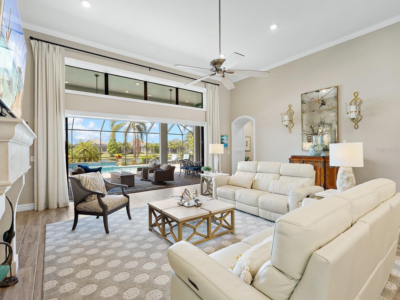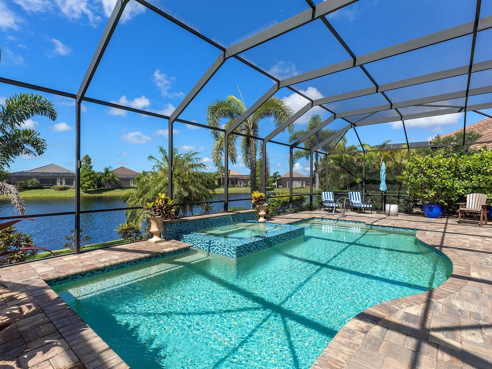 On a tranquil lakefront home site in Country Club East, built by Cardel Homes, this Dolcetto 4 floor plan offers over 3,300 square feet of refined living, where a natural color palette and wood-look tile floors set a tranquil tone. Thoughtful upgrades—custom ceilings, crown molding, designer lighting and detailed trim—blend craftsmanship with comfort throughout. A paver driveway and lush landscaping introduce the home, with no neighbors across the street—just a tranquil walking path and gazebo. A stunning glass front door, framed by side windows and a transom arch, opens to a foyer with a wallpaper-accented niche, tray ceiling, crown molding and coffered details—all set above elegant wood-look tile floors that continue throughout the main living areas. The great room offers a gas fireplace with a carved stone mantle, custom coffered ceilings, crown molding and transom windows above pocketing sliders with electric shades, all framing peaceful lake views. The adjacent kitchen showcases custom cabinetry, quartz countertops, a stainless-steel farm sink, under-cabinet lighting and top-tier KitchenAid appliances—including a six-burner gas cooktop with a vent hood. A spacious walk-in pantry with wood shelving and convenient pullout drawers offers abundant storage. Centered by a large island with pendant lighting, the space flows seamlessly into the open dining area, surrounded by designer windows and detailed wainscoting. Designed for entertaining, the outdoor living area includes a covered summer kitchen with polycarbonate cabinetry, granite countertops, a built-in grill with custom-trimmed vent, remote-controlled screens, and architectural columns that divide lounge and dining zones. A lap pool and spa with blue and teal tile and a water spillover feature complete the lakefront retreat. A custom archway leads to the private guest wing, featuring two spacious bedrooms with walk-in closets, large windows, plush carpet, and a shared Jack and Jill bath with dual vanities, a walk-in shower and subway tile. A separate pool bath, accessible from the bonus room, offers a glass-enclosed shower, designer wallpaper and a solid surface vanity. The primary suite is privately situated and designed for serenity. The bedroom features plush carpet, custom-trimmed coffered ceilings and numerous windows for natural light. The luxurious bath includes a barrel-style ceiling with a chandelier, crown molding, dual quartz-topped vanities, LED-lit mirrors, a free-standing soaking tub, large glass-enclosed walk-in shower with a bench, tile floors and walls, a linen closet and two custom walk-in closets. The office/den features glass French doors, a coffered ceiling with a designer chandelier, a custom accent wall, and a built-in illuminated bookshelf. A nearby bonus room, accessed through a trimmed archway, offers flexible use with crown molding, wood-look tile and plantation-shuttered windows. Additional highlights include a valet drop zone with built-in workspace and storage, an oversized side-entry garage with custom shelving, ceiling racks, plantation-shuttered windows, a Kohler whole-house generator, dual HVAC systems, a tankless water heater and a central vacuum. The laundry room offers cabinetry, folding space, a hanging area, crown molding and a plantation-shuttered window. Country Club East residents enjoy a private clubhouse with fitness center, resort-style pools and proximity to Waterside Place, LWR Main Street and The Mall at UTC.