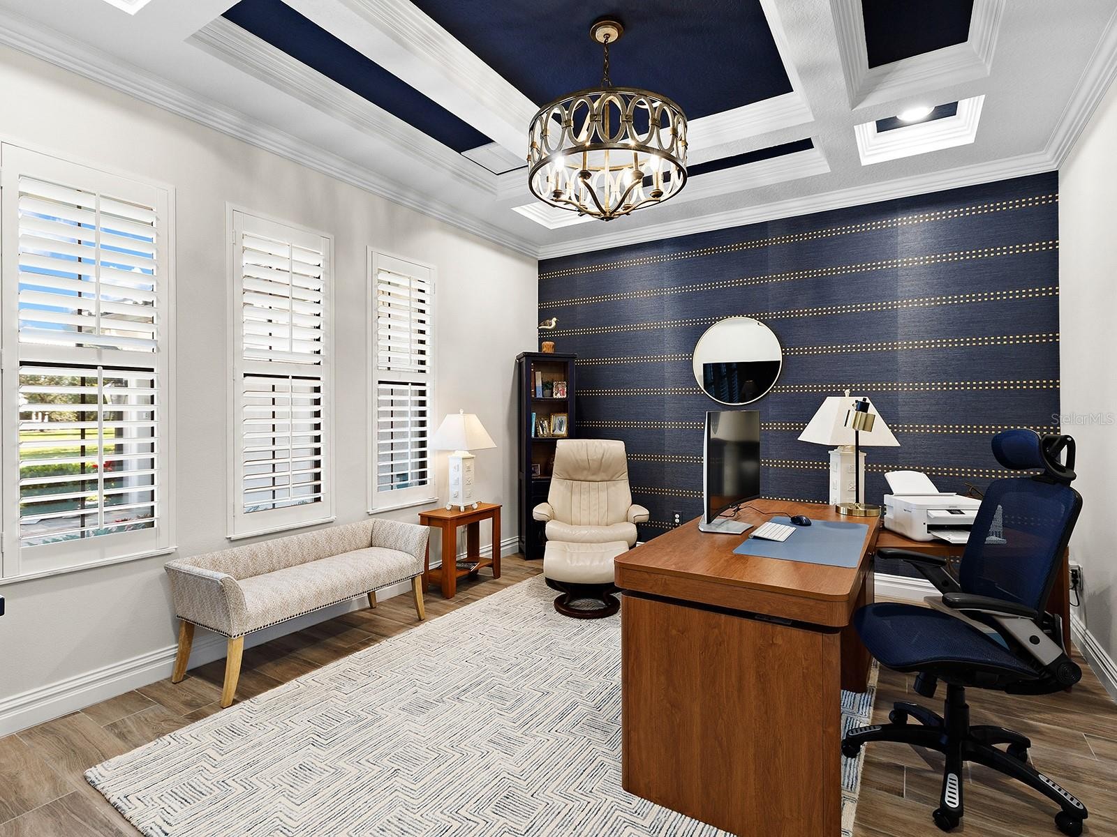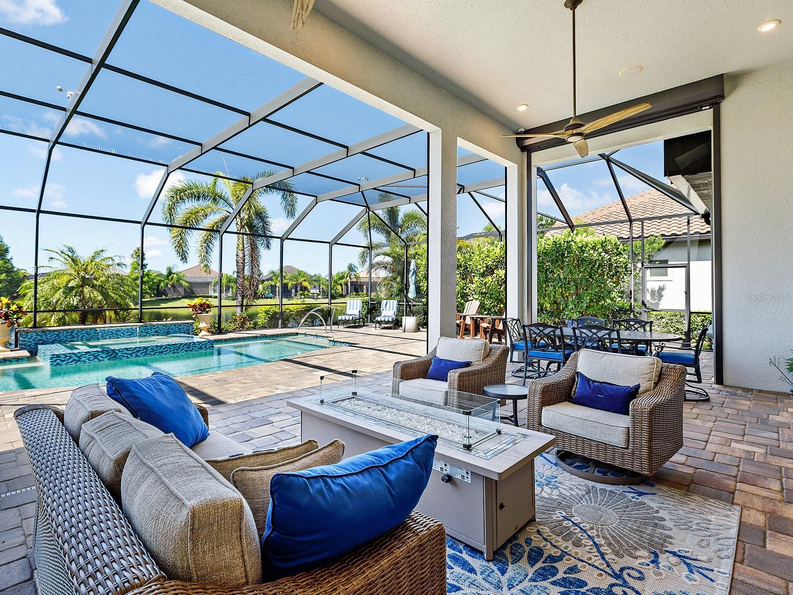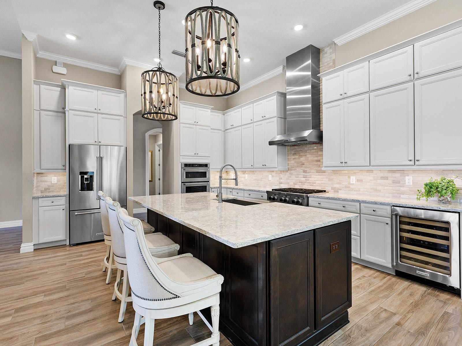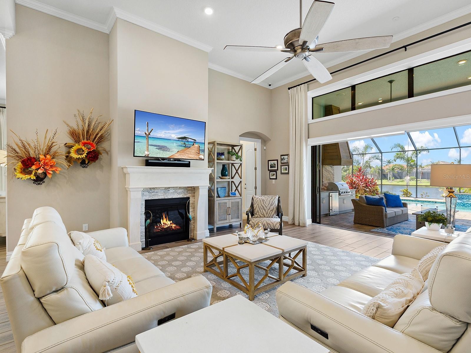 On a tranquil lakefront home site in Country Club East, built by Cardel Homes, this Dolcetto 4 floor plan offers over 3,300 square feet of refined living, where a natural color palette and wood-look tile floors set a tranquil tone. Thoughtful upgrades—custom ceilings, crown molding, designer lighting and detailed trim—blend craftsmanship with comfort throughout. A paver driveway and lush landscaping introduce the home, with no neighbors across the street—just a tranquil walking path and gazebo. A stunning glass front door, framed by side windows and a transom arch, opens to a foyer with a wallpaper-accented niche, tray ceiling, crown molding and coffered details—all set above elegant wood-look tile floors that continue throughout the main living areas. The great room offers a gas fireplace with a carved stone mantle, custom coffered ceilings, crown molding and transom windows above pocketing sliders with electric shades, all framing peaceful lake views. The adjacent kitchen showcases custom cabinetry, quartz countertops, a stainless-steel farm sink, under-cabinet lighting and top-tier KitchenAid appliances—including a six-burner gas cooktop with a vent hood. A spacious walk-in pantry with wood shelving and convenient pullout drawers offers abundant storage. Centered by a large island with pendant lighting, the space flows seamlessly into the open dining area, surrounded by designer windows and detailed wainscoting. Designed for entertaining, the outdoor living area includes a covered summer kitchen with polycarbonate cabinetry, granite countertops, a built-in grill with custom-trimmed vent, remote-controlled screens, and architectural columns that divide lounge and dining zones. A lap pool and spa with blue and teal tile and a water spillover feature complete the lakefront retreat. A custom archway leads to the private guest wing, featuring two spacious bedrooms with walk-in closets, large windows, plush carpet, and a shared Jack and Jill bath with dual vanities, a walk-in shower and subway tile. A separate pool bath, accessible from the bonus room, offers a glass-enclosed shower, designer wallpaper and a solid surface vanity. The primary suite is privately situated and designed for serenity. The bedroom features plush carpet, custom-trimmed coffered ceilings and numerous windows for natural light. The luxurious bath includes a barrel-style ceiling with a chandelier, crown molding, dual quartz-topped vanities, LED-lit mirrors, a free-standing soaking tub, large glass-enclosed walk-in shower with a bench, tile floors and walls, a linen closet and two custom walk-in closets. The office/den features glass French doors, a coffered ceiling with a designer chandelier, a custom accent wall, and a built-in illuminated bookshelf. A nearby bonus room, accessed through a trimmed archway, offers flexible use with crown molding, wood-look tile and plantation-shuttered windows. Additional highlights include a valet drop zone with built-in workspace and storage, an oversized side-entry garage with custom shelving, ceiling racks, plantation-shuttered windows, a Kohler whole-house generator, dual HVAC systems, a tankless water heater and a central vacuum. The laundry room offers cabinetry, folding space, a hanging area, crown molding and a plantation-shuttered window. Country Club East residents enjoy a private clubhouse with fitness center, resort-style pools and proximity to Waterside Place, LWR Main Street and The Mall at UTC.