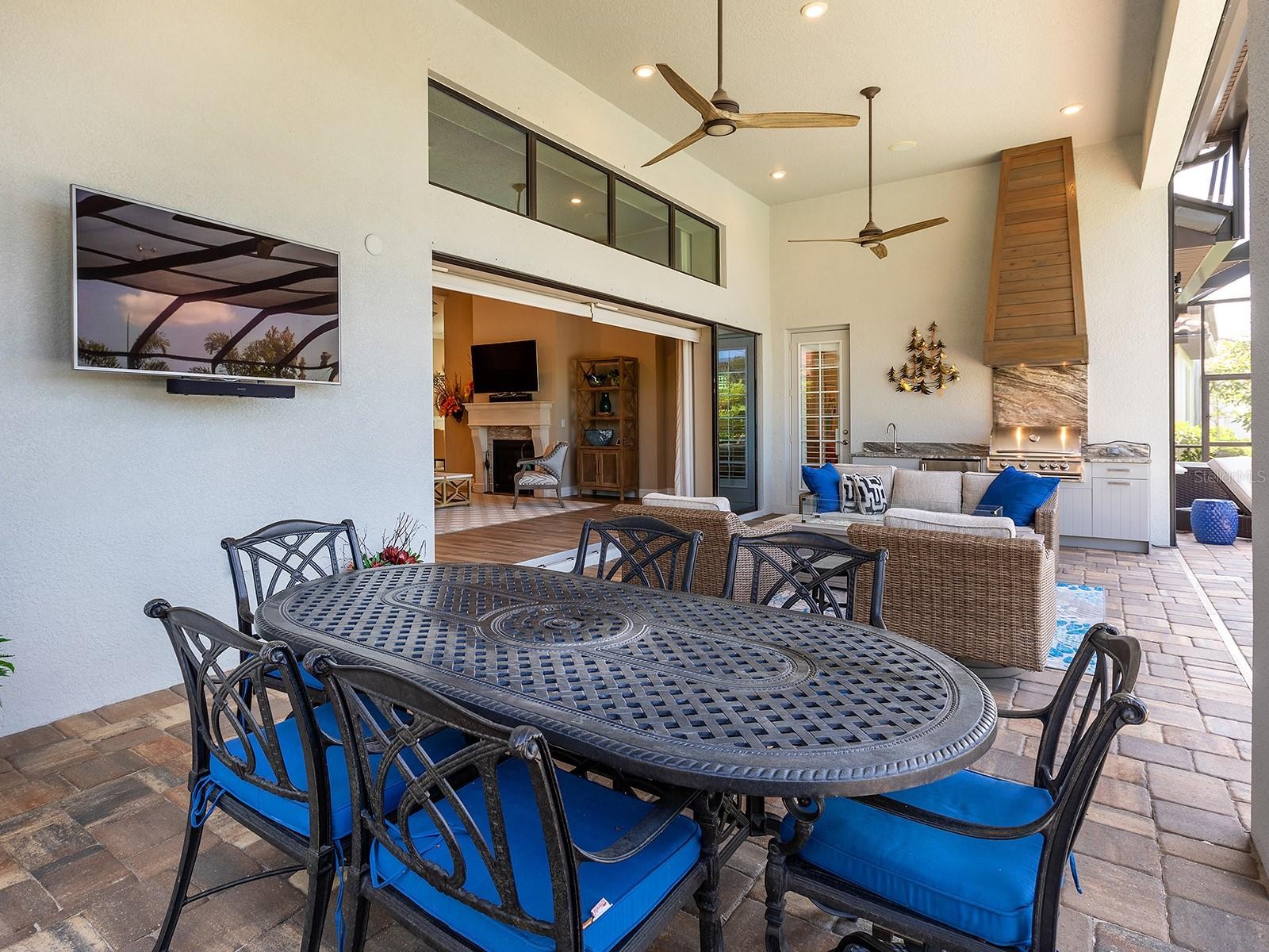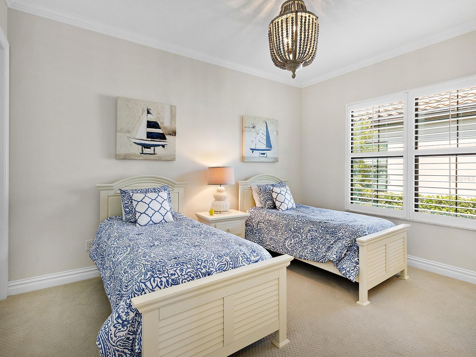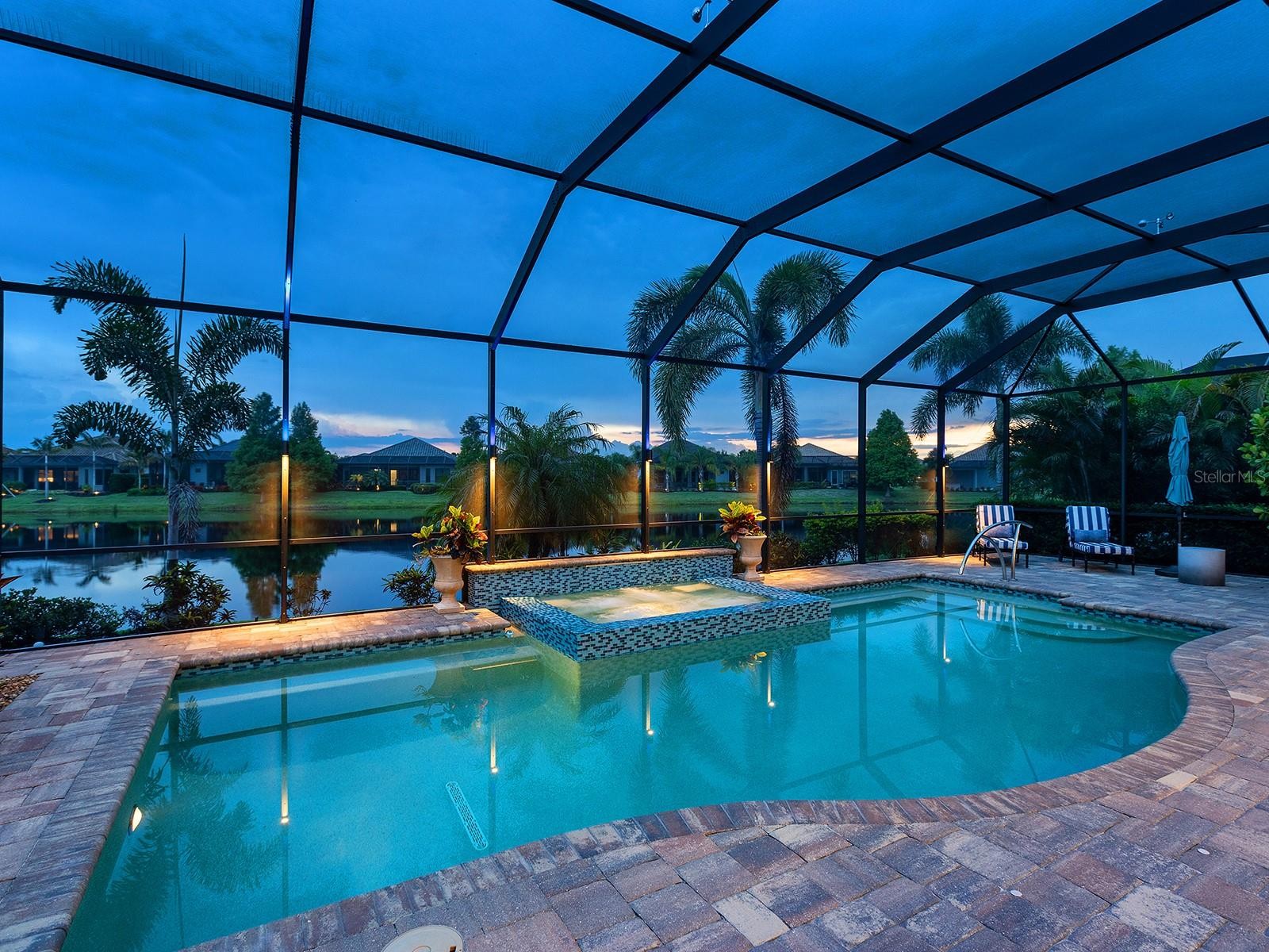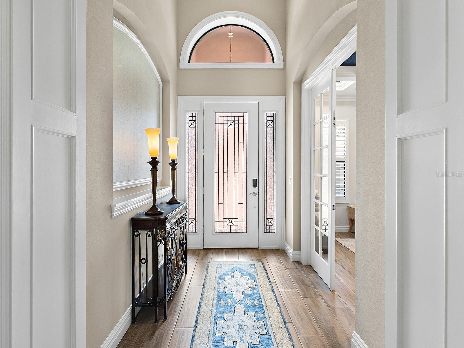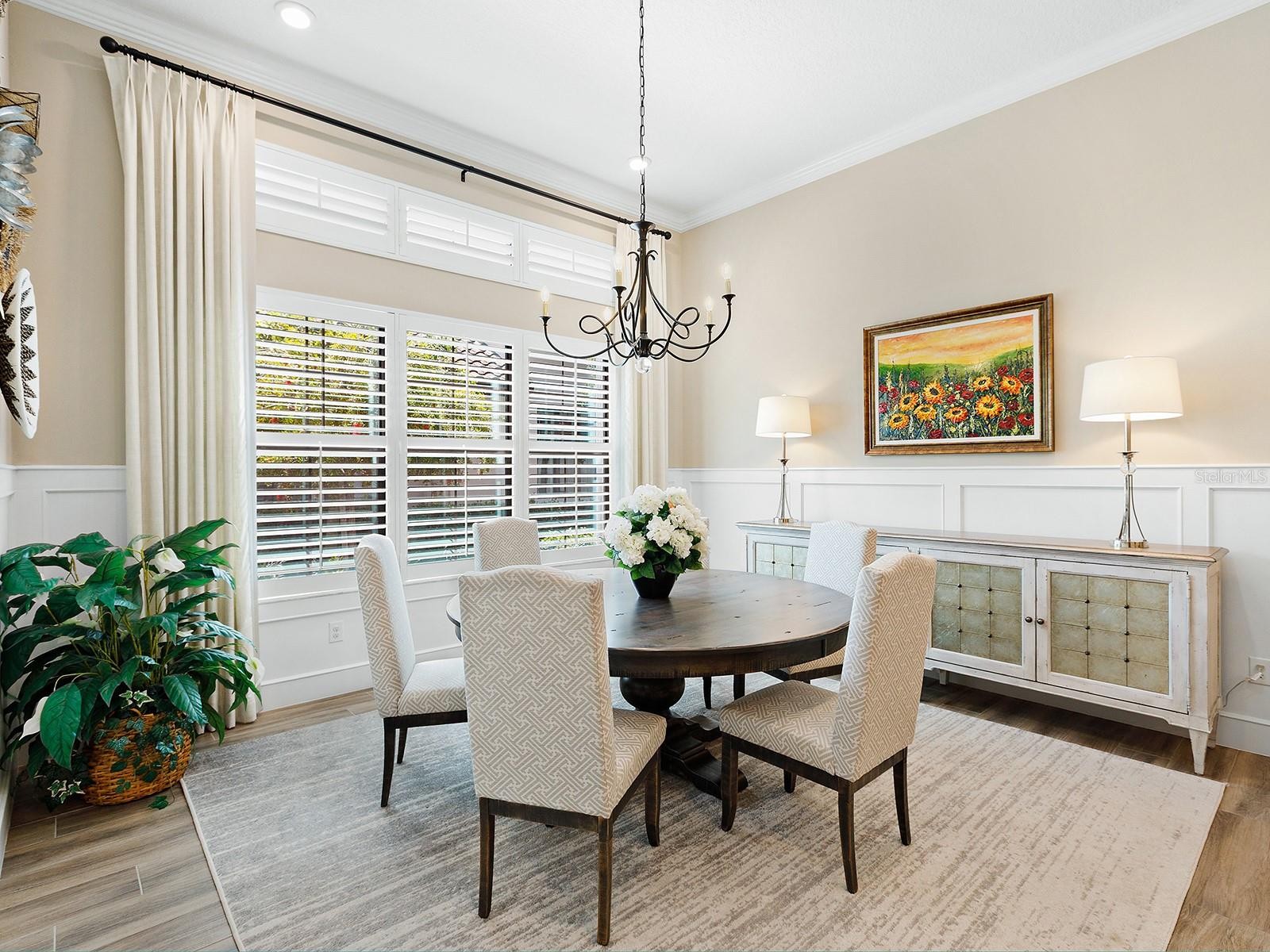 On a tranquil lakefront home site in Country Club East, built by Cardel Homes, this Dolcetto 4 floor plan offers over 3,300 square feet of refined living, where a natural color palette and wood-look tile floors set a tranquil tone. Thoughtful upgrades—custom ceilings, crown molding, designer lighting and detailed trim—blend craftsmanship with comfort throughout. A paver driveway and lush landscaping introduce the home, with no neighbors across the street—just a tranquil walking path and gazebo. A stunning glass front door, framed by side windows and a transom arch, opens to a foyer with a wallpaper-accented niche, tray ceiling, crown molding and coffered details—all set above elegant wood-look tile floors that continue throughout the main living areas. The great room offers a gas fireplace with a carved stone mantle, custom coffered ceilings, crown molding and transom windows above pocketing sliders with electric shades, all framing peaceful lake views. The adjacent kitchen showcases custom cabinetry, quartz countertops, a stainless-steel farm sink, under-cabinet lighting and top-tier KitchenAid appliances—including a six-burner gas cooktop with a vent hood. A spacious walk-in pantry with wood shelving and convenient pullout drawers offers abundant storage. Centered by a large island with pendant lighting, the space flows seamlessly into the open dining area, surrounded by designer windows and detailed wainscoting. Designed for entertaining, the outdoor living area includes a covered summer kitchen with polycarbonate cabinetry, granite countertops, a built-in grill with custom-trimmed vent, remote-controlled screens, and architectural columns that divide lounge and dining zones. A lap pool and spa with blue and teal tile and a water spillover feature complete the lakefront retreat. A custom archway leads to the private guest wing, featuring two spacious bedrooms with walk-in closets, large windows, plush carpet, and a shared Jack and Jill bath with dual vanities, a walk-in shower and subway tile. A separate pool bath, accessible from the bonus room, offers a glass-enclosed shower, designer wallpaper and a solid surface vanity. The primary suite is privately situated and designed for serenity. The bedroom features plush carpet, custom-trimmed coffered ceilings and numerous windows for natural light. The luxurious bath includes a barrel-style ceiling with a chandelier, crown molding, dual quartz-topped vanities, LED-lit mirrors, a free-standing soaking tub, large glass-enclosed walk-in shower with a bench, tile floors and walls, a linen closet and two custom walk-in closets. The office/den features glass French doors, a coffered ceiling with a designer chandelier, a custom accent wall, and a built-in illuminated bookshelf. A nearby bonus room, accessed through a trimmed archway, offers flexible use with crown molding, wood-look tile and plantation-shuttered windows. Additional highlights include a valet drop zone with built-in workspace and storage, an oversized side-entry garage with custom shelving, ceiling racks, plantation-shuttered windows, a Kohler whole-house generator, dual HVAC systems, a tankless water heater and a central vacuum. The laundry room offers cabinetry, folding space, a hanging area, crown molding and a plantation-shuttered window. Country Club East residents enjoy a private clubhouse with fitness center, resort-style pools and proximity to Waterside Place, LWR Main Street and The Mall at UTC.