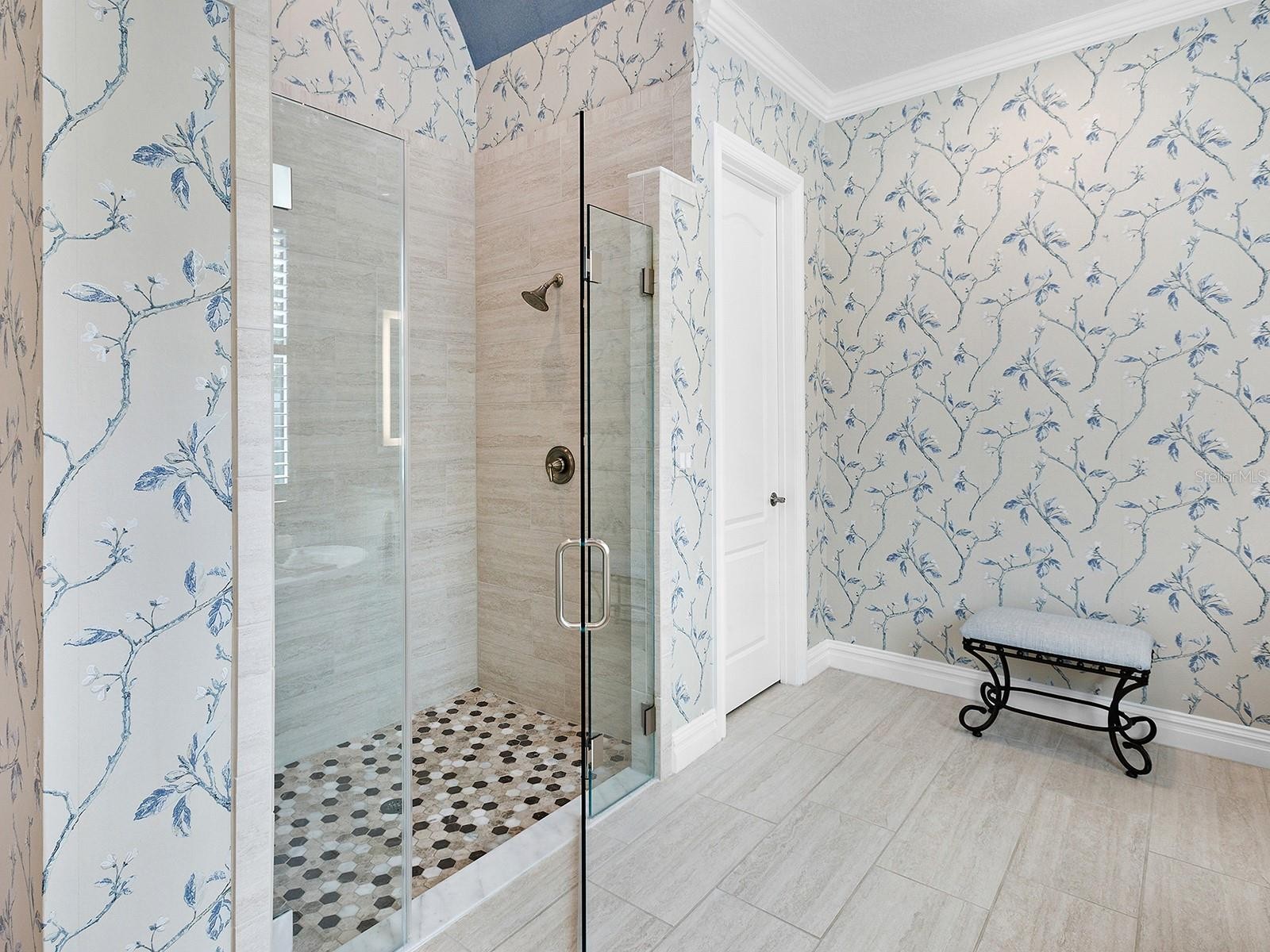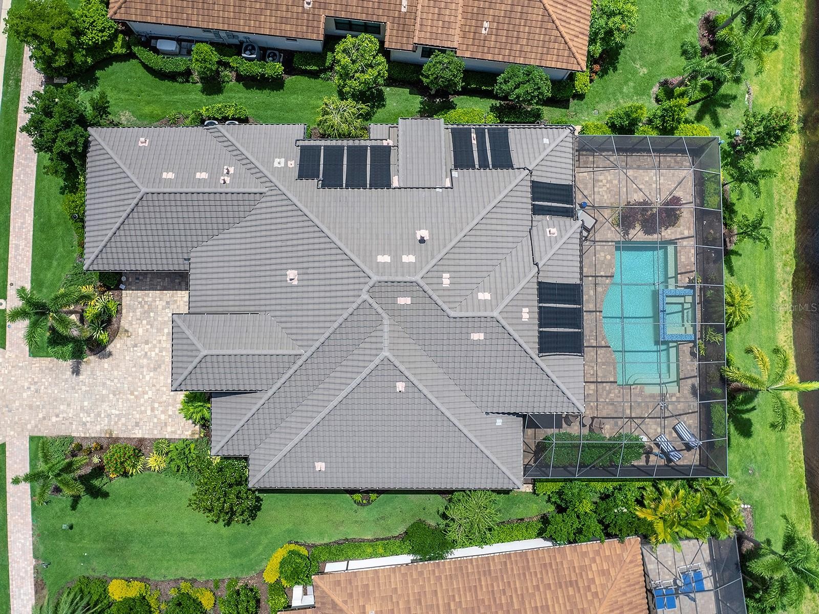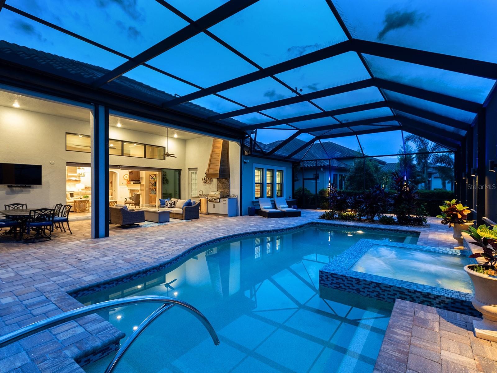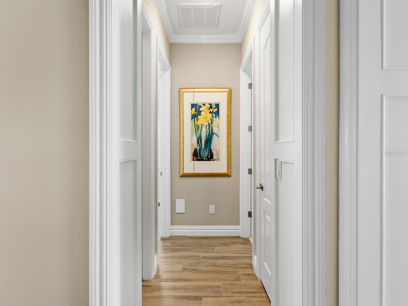 On a tranquil lakefront home site in Country Club East, built by Cardel Homes, this Dolcetto 4 floor plan offers over 3,300 square feet of refined living, where a natural color palette and wood-look tile floors set a tranquil tone. Thoughtful upgrades—custom ceilings, crown molding, designer lighting and detailed trim—blend craftsmanship with comfort throughout. A paver driveway and lush landscaping introduce the home, with no neighbors across the street—just a tranquil walking path and gazebo. A stunning glass front door, framed by side windows and a transom arch, opens to a foyer with a wallpaper-accented niche, tray ceiling, crown molding and coffered details—all set above elegant wood-look tile floors that continue throughout the main living areas. The great room offers a gas fireplace with a carved stone mantle, custom coffered ceilings, crown molding and transom windows above pocketing sliders with electric shades, all framing peaceful lake views. The adjacent kitchen showcases custom cabinetry, quartz countertops, a stainless-steel farm sink, under-cabinet lighting and top-tier KitchenAid appliances—including a six-burner gas cooktop with a vent hood. A spacious walk-in pantry with wood shelving and convenient pullout drawers offers abundant storage. Centered by a large island with pendant lighting, the space flows seamlessly into the open dining area, surrounded by designer windows and detailed wainscoting. Designed for entertaining, the outdoor living area includes a covered summer kitchen with polycarbonate cabinetry, granite countertops, a built-in grill with custom-trimmed vent, remote-controlled screens, and architectural columns that divide lounge and dining zones. A lap pool and spa with blue and teal tile and a water spillover feature complete the lakefront retreat. A custom archway leads to the private guest wing, featuring two spacious bedrooms with walk-in closets, large windows, plush carpet, and a shared Jack and Jill bath with dual vanities, a walk-in shower and subway tile. A separate pool bath, accessible from the bonus room, offers a glass-enclosed shower, designer wallpaper and a solid surface vanity. The primary suite is privately situated and designed for serenity. The bedroom features plush carpet, custom-trimmed coffered ceilings and numerous windows for natural light. The luxurious bath includes a barrel-style ceiling with a chandelier, crown molding, dual quartz-topped vanities, LED-lit mirrors, a free-standing soaking tub, large glass-enclosed walk-in shower with a bench, tile floors and walls, a linen closet and two custom walk-in closets. The office/den features glass French doors, a coffered ceiling with a designer chandelier, a custom accent wall, and a built-in illuminated bookshelf. A nearby bonus room, accessed through a trimmed archway, offers flexible use with crown molding, wood-look tile and plantation-shuttered windows. Additional highlights include a valet drop zone with built-in workspace and storage, an oversized side-entry garage with custom shelving, ceiling racks, plantation-shuttered windows, a Kohler whole-house generator, dual HVAC systems, a tankless water heater and a central vacuum. The laundry room offers cabinetry, folding space, a hanging area, crown molding and a plantation-shuttered window. Country Club East residents enjoy a private clubhouse with fitness center, resort-style pools and proximity to Waterside Place, LWR Main Street and The Mall at UTC.