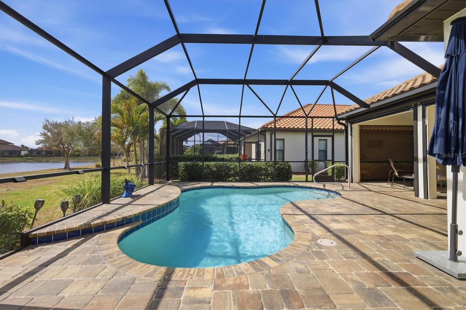 Beautiful maintained and upgraded 2019 White Star model with lake view. 3 bedroom plus den, 2 1/2 bathroom home with private pool and modern open floor plan with tray ceilings and crown molding. The home sparkles with ceramic tile flooring throughout and abundance of natural light. A stunning kitchen with granite counter tops, stainless steel appliances and plenty of counterspace and gas stove makes entertaining fun. The split bedroom floor plan gives everybody privacy. The master suite enjoys the lake view a en-suite bath with dual sinks and generous walk in closet. The house is in an x flood zone, has whole house hurricane protection as roll down shutters, a Generac natural gas generator, surge protector and integrated security system to give a buyer complete serenity. Located in the Grand Palm Community with endless resort-style amenities and activities, ranging from a resort-style pool, splash pad, dog park, pickleball, tennis, playground, fishing piers and much more so residents can relax or stay active without even leaving the community. Home comes furnished (except: antique chest in living room, office desk, chair and table, white chest in bedroom closet and reclyner in 2nd bedroom) House has fresh paint inside and out. New hot water circulation with pump and timer, New front load GE washer and dryer, New Pure MX ultraviolet light in HVAC, Monkey Bar 4'x8' shelves in Garage rated at 750 pounds, New front door with glass, New pool pump and all new furniture and 85" TV