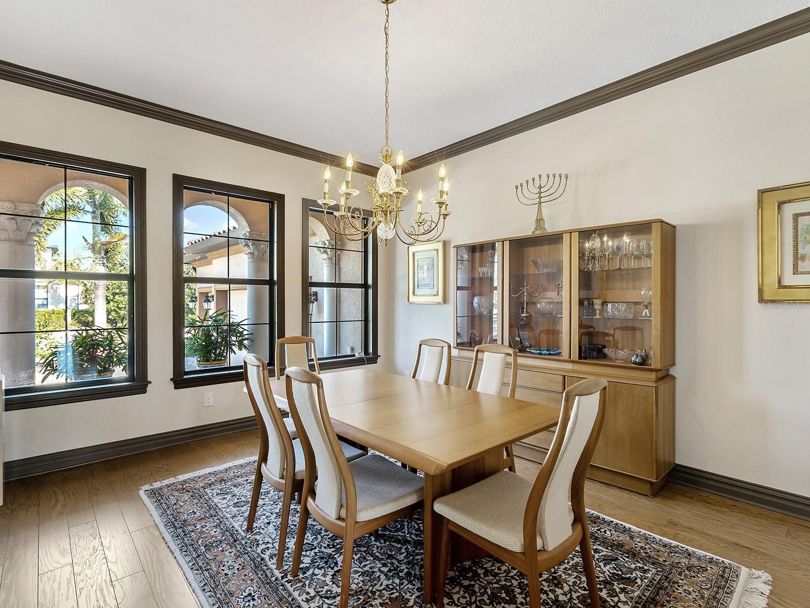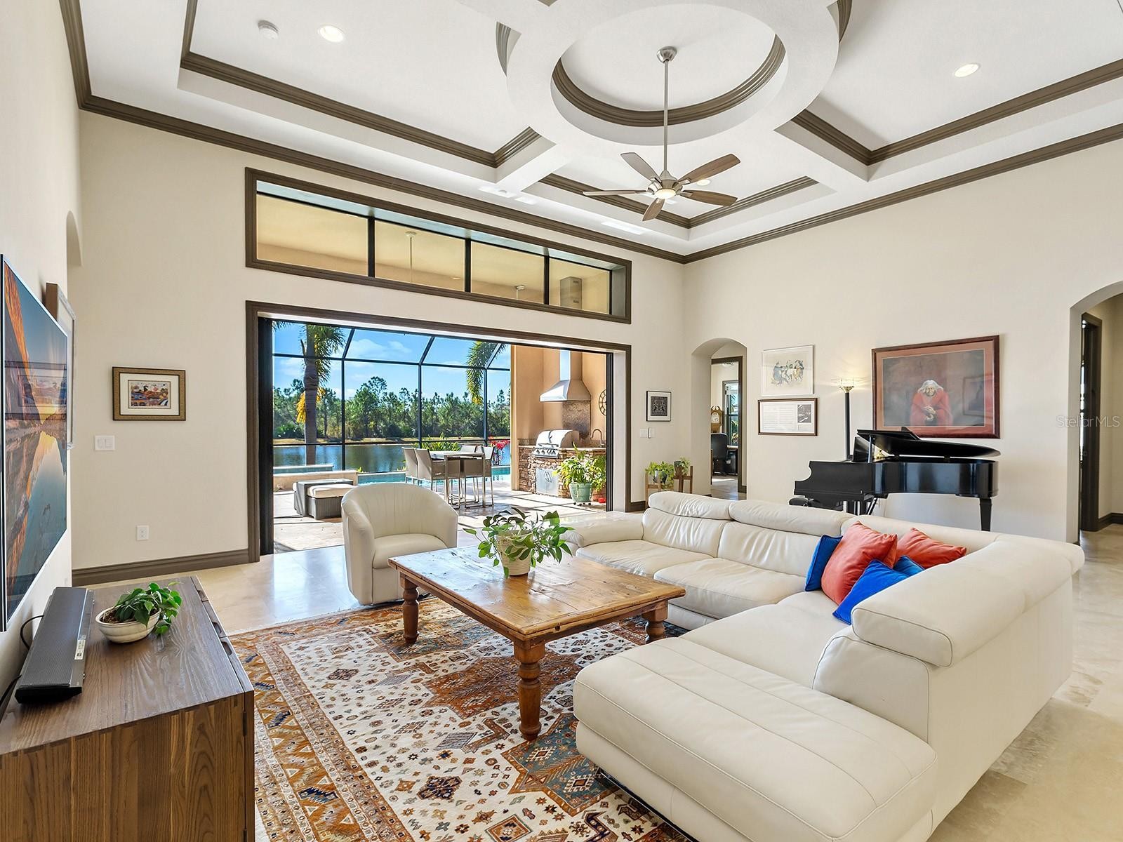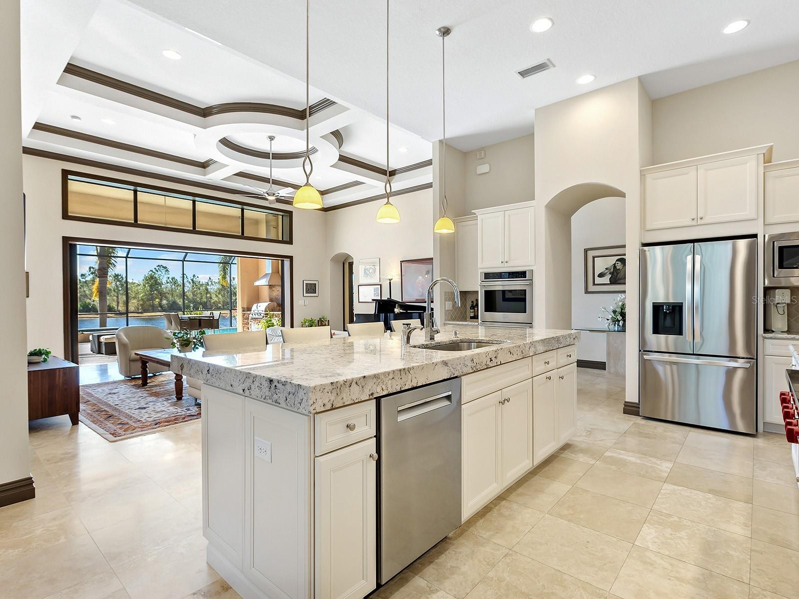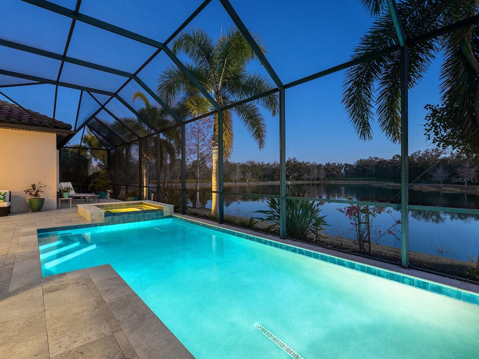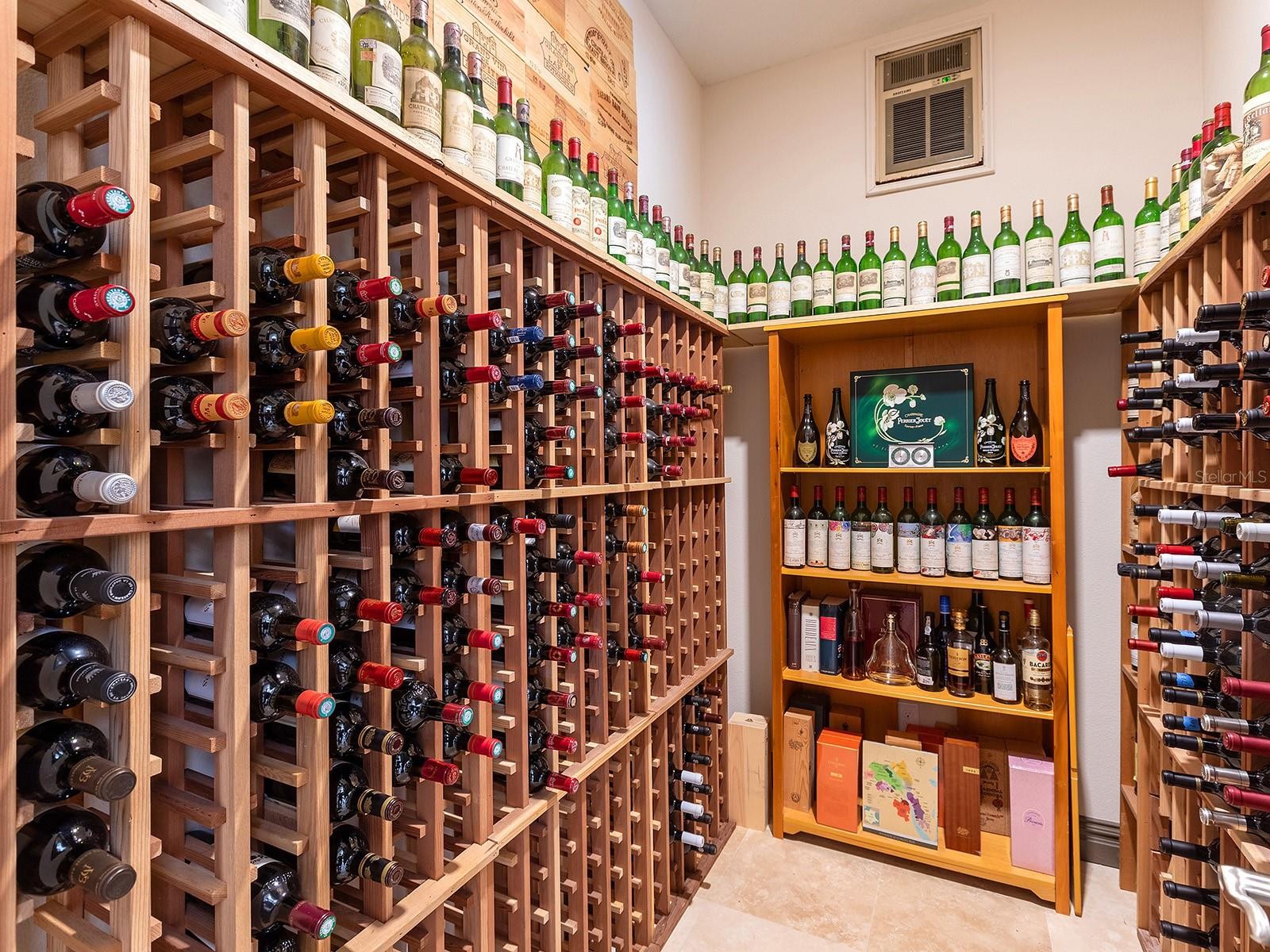 Welcome to 16818 Berwick Terrace, an exceptional Cardel Homes masterpiece tucked away at end of a quiet, sheltered cul-de-sac. Spanning nearly 3,700 square feet, this coastal-inspired residence exemplifies refined elegance and superior craftsmanship within the gated golfing community of Country Club East in Lakewood Ranch. This stunning single-story home showcases uninterrupted panoramic lake views, framed by lush landscaping and abundant wildlife, where waterfowl glide across the water and birds fill the air with song, creating a peaceful, private sanctuary. Glass entry doors open to a thoughtfully curated interior featuring travertine marble flooring and engineered hardwood flooring in all common areas including the primary suite, setting the tone for timeless luxury. At the heart of the home, the gourmet kitchen impresses with high-end appliances including Wolf and Monogram, rich wood cabinetry, and an expansive stone island that doubles as a breakfast bar, seamlessly flowing into the casual dinette and great room. The great room’s soaring ceilings and disappearing sliding glass doors blur the lines between indoor and outdoor living, ideal for entertaining or relaxing. Additional living spaces include a bonus room for leisure, a private den or office near the entry, and a climate-controlled custom wine room with capacity for over 700 bottles, a showpiece for the connoisseur. The luxurious primary suite is a private retreat, offering a spacious walk-in closet and a spa-inspired en-suite bath with a soaking tub, glass-enclosed walk-in shower and dual split stone vanities. Two generously appointed guest suites, each with walk-in closets and Jack and Jim bath, provide comfort and privacy for family and visitors. Go outside to a resort-style oasis designed for the ultimate Florida lifestyle. Enjoy a heated saltwater pool and spa, a spacious covered loggia and a full outdoor kitchen, all overlooking serene lake views that complete this exceptional setting. Notable upgrades include a spacious laundry room, extensive custom storage cabinetry from the 3.5-car garage, a whole-house generator, motorized hurricane screens in the lanai, whole-house surge protection, dual HVAC systems with UV lights, tankless water heater, accordion storm shutters, tray ceilings, lush landscaping with accent lighting and elegant crown molding, enhancing beauty and functionality. This is more than a home, it’s an elevated living experience. Residents of Country Club East enjoy a resort lifestyle with access to three community pools, including The Retreat, featuring a resort-style pool, fitness center, social spaces, outdoor kitchen and scenic nature trails, all included with HOA fees. Optional memberships are available at the Lakewood Ranch Golf and Country Club, offering golf and social amenities. Ideally near shopping, dining, A-rated schools, cultural venues and world-renowned beaches, this exceptional residence invites you to indulge in the lifestyle you deserve.