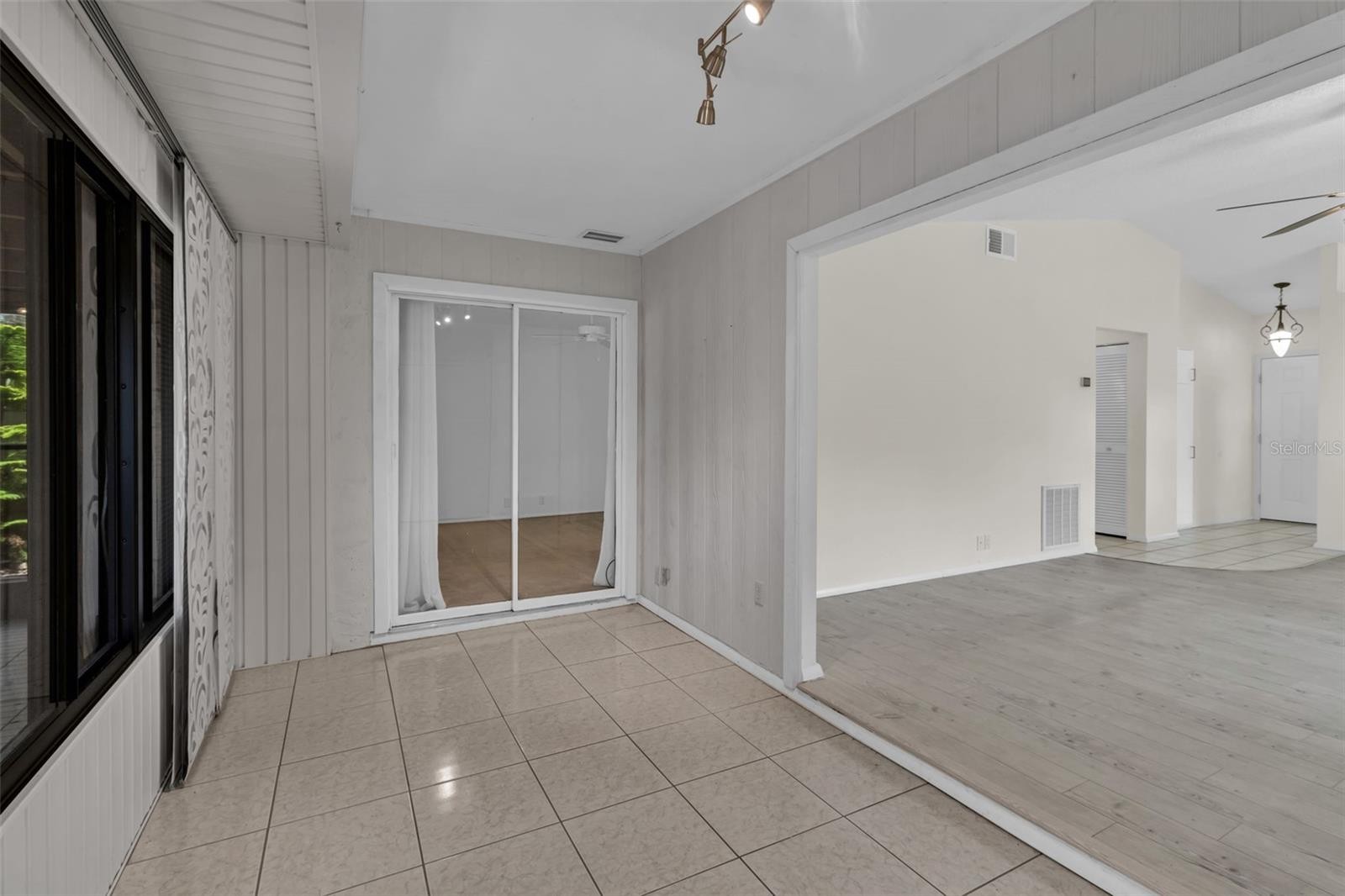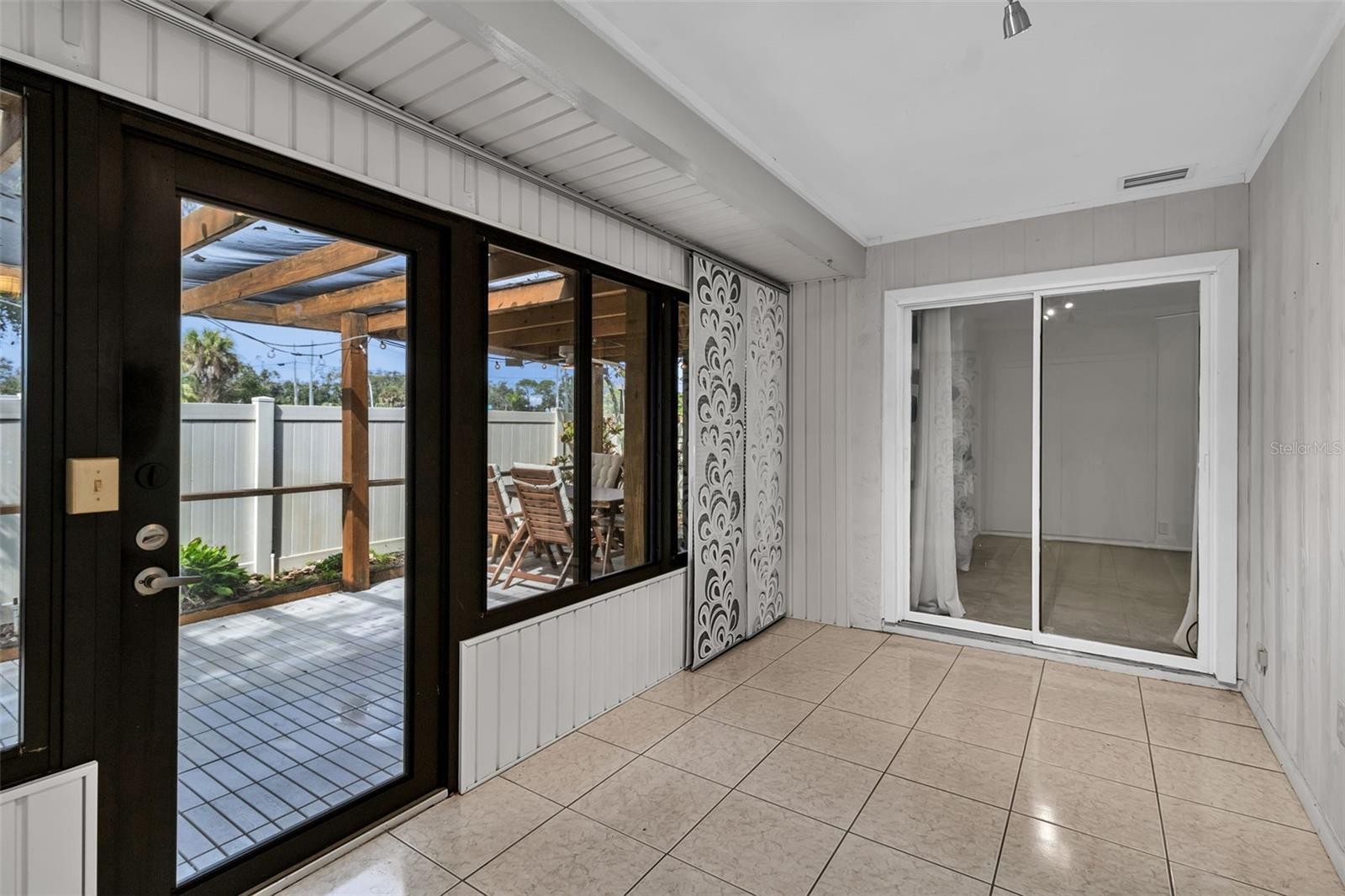 One or more photo(s) has been virtually staged. This updated villa in the 55+ Curry Cove community is perfect for carefree Florida living. It has 2 bedrooms, 2 bathrooms, and a covered carport. The home features an enclosed front porch, Corian countertops in the kitchen and bathrooms, stainless steel appliances, and wood flooring throughout the main living areas. The open layout with cathedral ceilings connects the kitchen, dining, and living rooms, giving it a spacious feel. The master bedroom has its own bathroom with a walk-in shower and a private entrance to the bonus room The bonus room adds extra space and includes a storage closet with washer and dryer. Enjoy your private, fenced patio with stylish flooring—a great place to enjoy your morning coffee or for entertaining guests on a temperate evening. With a whole house water filtration system, recent updates include a new AC in 2022 and a new hot water heater in 2025. Curry Cove offers a heated community pool and parking for RVs and boats. Its location is perfect for those who want to enjoy all the area offers Gulf beaches, downtown Venice, and a wide variety of dining and shopping venues.