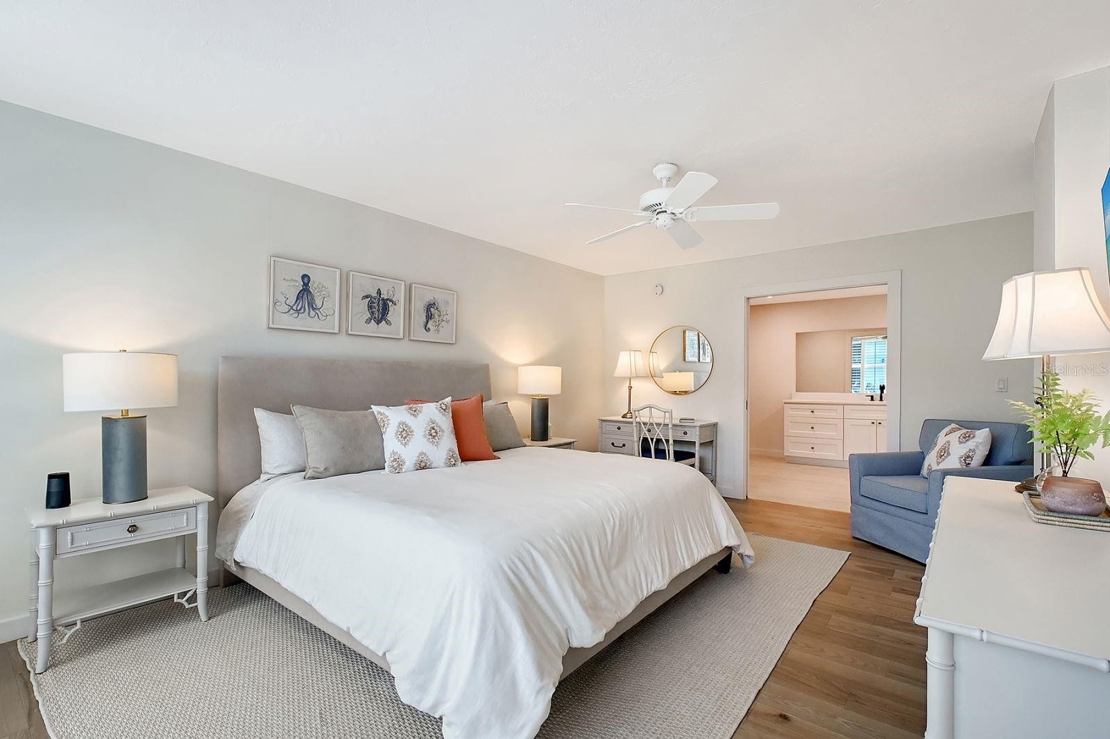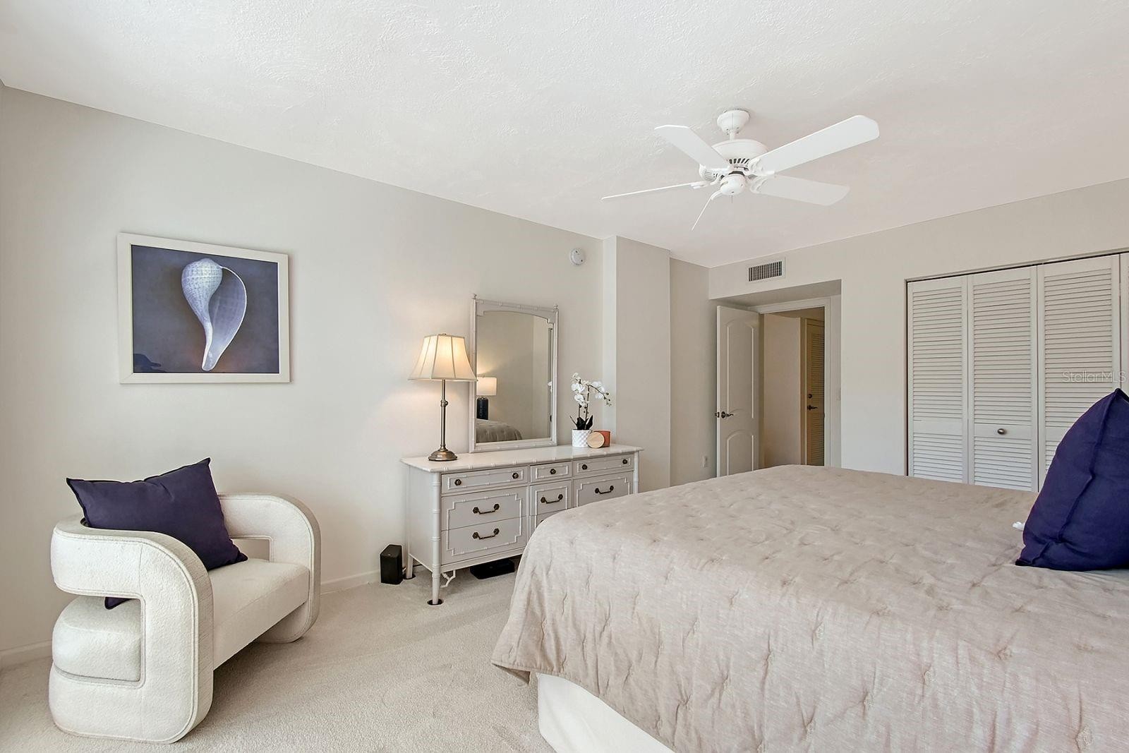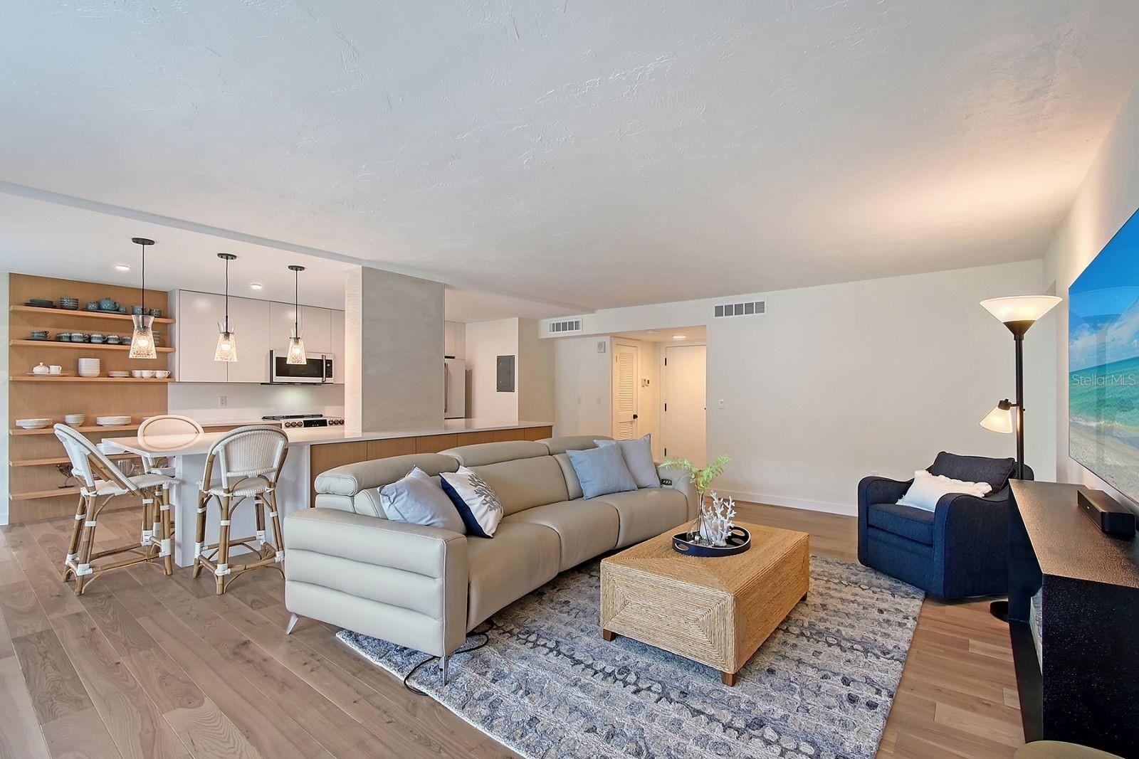 AQUARIUS CLUB – This exquisitely renovated fourth floor residence is situated within an exclusive beachfront boutique community on Longboat Key, located directly adjacent to the new Five Diamond St. Regis Resort. Modern design blends seamlessly with coastal elegance in the two-bedroom, two-bathroom retreat. The meticulously updated interior offers 1,551 Sq. ft of open living space, with privacy in a split bedroom floor plan. A generous balcony unveils views of the Gulf with floor-to-ceiling windows and sliding glass doors that lend brightness to the space, creating an airy atmosphere that feels both expansive and welcoming throughout. The kitchen is open to the living area, with details such as beautiful quartz countertops, an expansive island with dramatic quartz waterfall edge, recessed lighting, open shelving and modern cabinetry that blends sleek white finishes with natural wood. The state-of-the-art Café appliances are matte white and Wi-Fi enabled including a French door refrigerator and electric range (with glass cooktop and double convection ovens), plus an undermount single basin stainless steel kitchen sink by Moen. The epitome of luxury and comfort, the spacious primary bedroom includes plantation shutters and a private ensuite bath that features an open, integrated closet providing a cohesive dressing and bathing area with tub. The additional bedroom is stylish and functional, with new carpet, floor-to ceiling windows with plantation shutters, and a custom closet. The lobby and community rooms have been beautifully updated and with just 58 residences, Aquarius Club offers a beachfront resort living experience that caters to those seeking a higher quality of life in a more intimate setting. Enjoy an amenity-rich lifestyle beachside with a heated pool, beach umbrellas, barbecue grill, fitness center, hospitality room with catering kitchen, library and game room, tennis and pickle ball courts, onsite management, and maintenance supervisor. A highlight of ownership at Aquarius Club is the “complimentary” social membership included for the new St. Regis Resort, located next door. Adding to the convenience and enjoyment of your beachfront retreat at Aquarius Club, the St. Regis membership offers discerning dining opportunities, preferred pricing on Spa services, use of resort pool and winding river, state-of-the-art fitness center and more. Embrace the unparalleled sophistication and charm of the Longboat Key lifestyle.