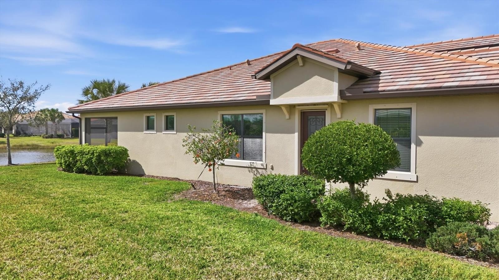 Wake up to water views in this beautiful paired villa in Del Webb at Lakewood Ranch. Enjoy the convenient access at the end of the cul-de-sac to the path leading directly to the clubhouse and resort-style amenities. Offered furnished, this residence is well maintained and has 2 bedrooms plus a spacious office adding flexibility for a 3rd bedroom. Designed with an open-concept layout, the main living areas feature ceramic tile flooring and flow seamlessly toward the water. The kitchen has granite counters, a bar and a pantry. The primary bedroom has water views and an en-suite bathroom with dual sinks, shower, walk-in and linen closets, and a water closet. The second bedroom has a large walk-in closet and is adjacent to the second bathroom. The inside laundry room has plenty of storage and hosts a utility sink. Enjoy quiet mornings on the cozy screened lanai overlooking the water before heading out to enjoy your new lifestyle in the premier 55+ pet friendly community of Del Webb. The amenities include an abundance of social activities, pools, a restaurant, live music, tennis, pickleball, bocce ball, fitness center, and an impressive array of amenities designed for active living. Take advantage of peaceful common area walking trails set along scenic ponds and enjoy the ease of a golf cart friendly community. Endless opportunities to stay active and social, with everything you need to live well and stay engaged. Vibrant lifestyles just beyond your front door includes farmers markets, live music, boutique shopping, and waterfront dining. Easy access to I75, UTC Mall, Waterside, downtown Sarasota and Bradenton, Gulf Coast’s award-winning beaches and medical facilities. This is Lakewood Ranch living, done beautifully.
