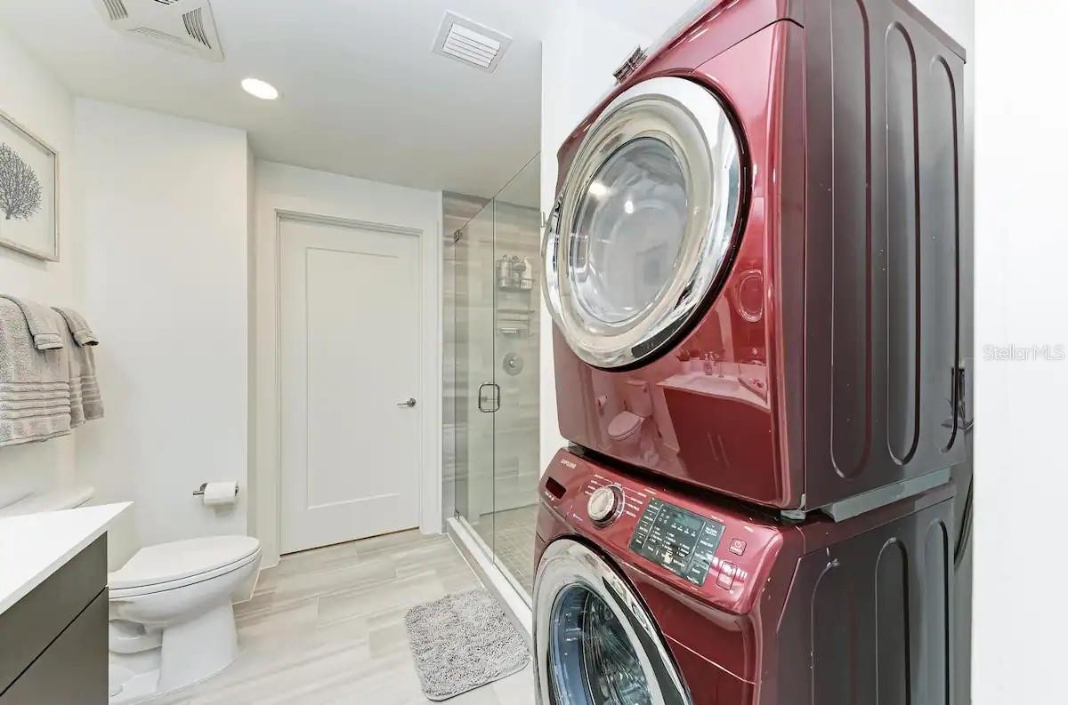 Truly Turn Key Luxury at its finest! This beautiful condo comes fully furnished with everything you need to move right in and enjoy the scenery. The Strand of Sarasota is a new luxurious condo, with breathtaking water views and direct access to Sarasota Bay. This gated community includes five-star amenities, and fantastic proximity to Downtown Sarasota and beaches! Located on the 4th floor, the residence includes an open living and dining area, a master suite with king bed and ensuite bath, a den with Murphy Bed, and a 2nd full bathroom. The unit contains a Fully stocked Kitchen, as well as a Sleeper Sofa in living room for additional guests. The In-unit laundry contains a full size washer and dryer for extra convenience. Additional items include a Nest thermostat and Keyless entry lock. Many basic items are included for your convenience, along with high end luxury linens, smart TVs in all rooms. There is 1 assigned covered parking spot on bottom level with elevator access to the 4th floor as well as extra storage unit. Additional parking is available in any non-numbered spots on the property. The resort style amenities include heated pool/spa, gym, gas fire pit and grill, electric car charging, dog park, boardwalk, and kayak launch. You can rent monthly or weekly, which is a rare find in downtown Sarasota. Whether you're looking to live here full time, part time or as an investment option, don’t miss a chance to take advantage of this unique opportunity.