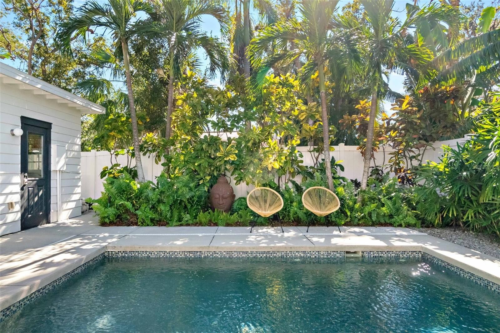 Welcome to this charming 1926 "Old Florida" bungalow that has been beautifully restored, blending its original character with modern conveniences. Located in the highly desirable Hudson Bayou neighborhood, this home offers 3 bedrooms, 3.5 bathrooms, and 2,122 sqft of living space. As you approach the home, you are greeted by an oversized brick front porch, perfect for relaxing or enjoying the outdoors. Inside, the main living area boasts an abundance of windows, flooding the space with natural light throughout. The centerpiece of the room is the original brick fireplace, and it is adjacent to the study, which is enclosed by 8-foot glass French doors. The updated kitchen is a true highlight, complete with designer appliances, wooden cabinets, a large walk-in pantry, and stone countertops. A tankless hot water heater and natural gas add to the home's modern features. The primary suite, added in 2015, features a tray ceiling and an oversized picture window, plus his and her closets, dual vanities, and a walk-in shower. Outside, enjoy the covered back porch overlooking the pool area, surrounded by mature tropical landscaping. The large brick-paver driveway provides ample parking and leads to a detached one-car garage at the rear, along with an automated security gate. This home is located on a quiet street, just minutes from Southside Village, downtown bayfront shops and restaurants, St. Armands Circle, and Siesta Key. Don't miss the chance to own this beautifully restored home in one of the most sought-after neighborhoods in the area.